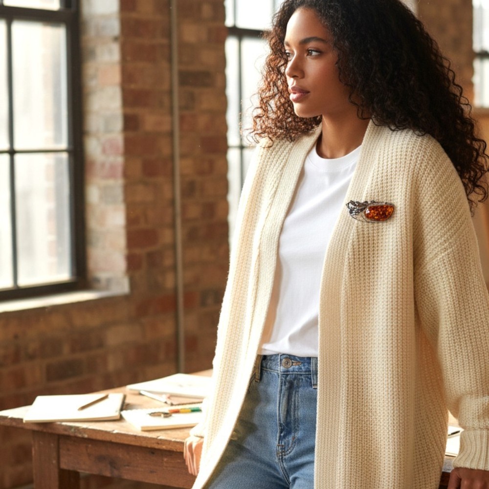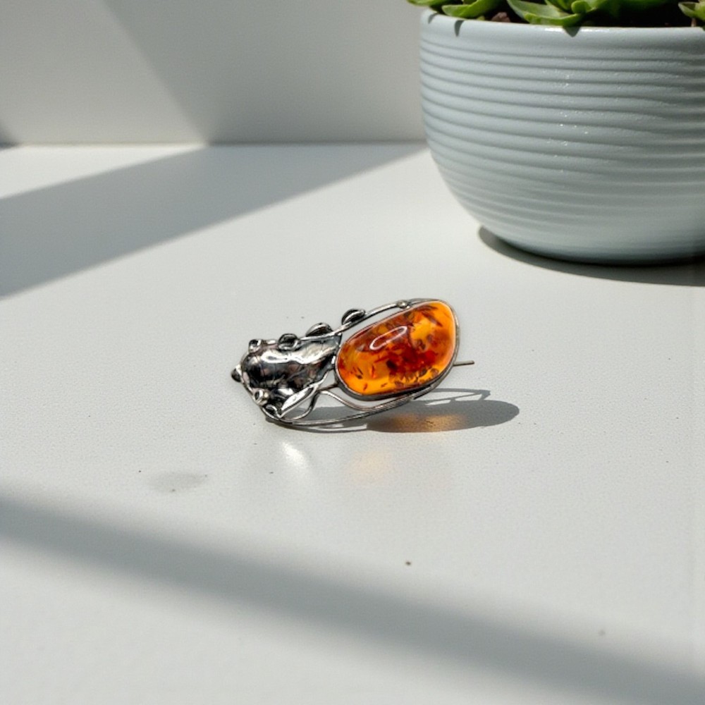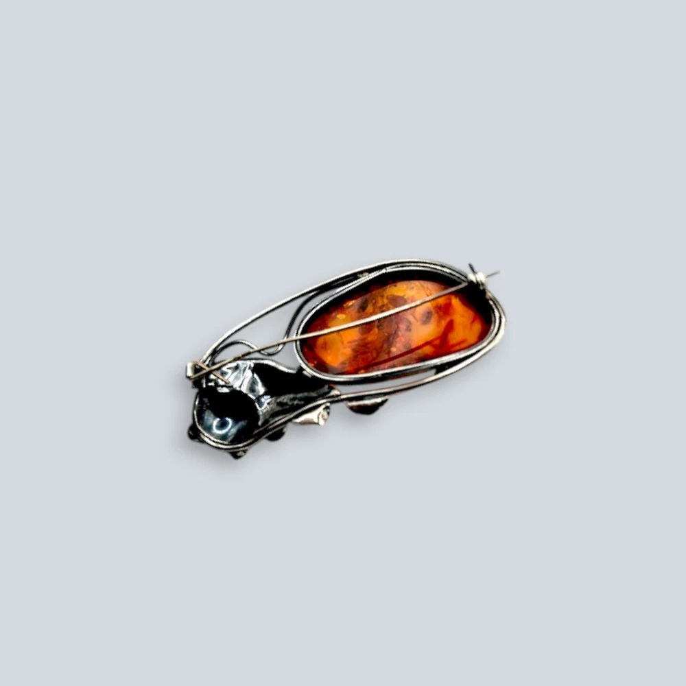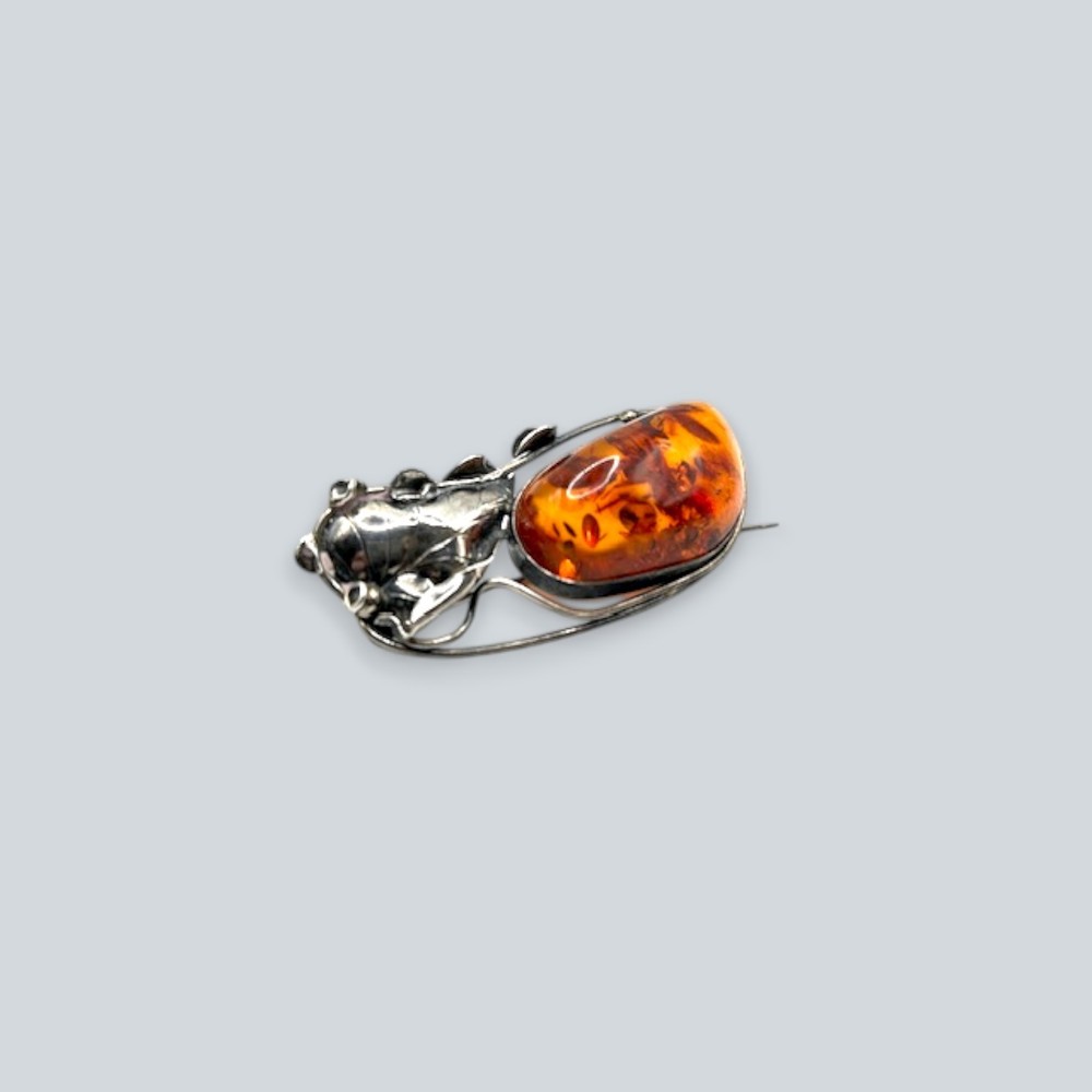 This one of a kind Vintage Handmade Art Nouveau Sterling Silver Brooch features a large Baltic Amber stone, giving it a unique and elegant look. The orange color of the amber stone adds a pop of color to the piece, making it a standout accessory for any outfit. The intricate design of the Art Nouveau style further enhances the beauty of this handmade brooch, making it a captivating addition to any vintage jewelry collection. Baltic amber is fossilized tree resin from Eocene coniferous trees, approximately 40-45 million years old, found primarily along the Baltic Sea. Artisan hand crafted, one of a kind, the silverwork is so delicate & pretty, a crafted silver leaf encircled by tiny silver embellishments. The pin & clasp is functional, but in a hand made kind of way. Unmarked sterling, no makers mark. Pin is approximately 3" x 1.5", stone is about 1" x 1.5". Artistry and presence not found in todays mass produced jewelry, a rare thing of beauty and charm.