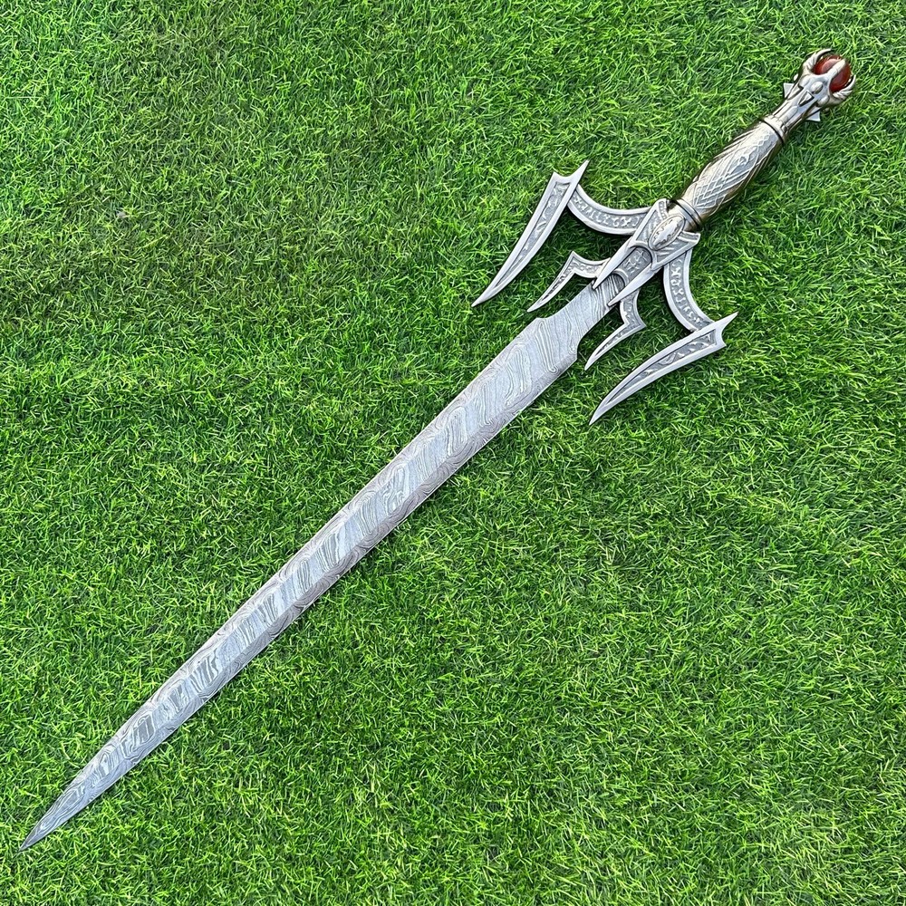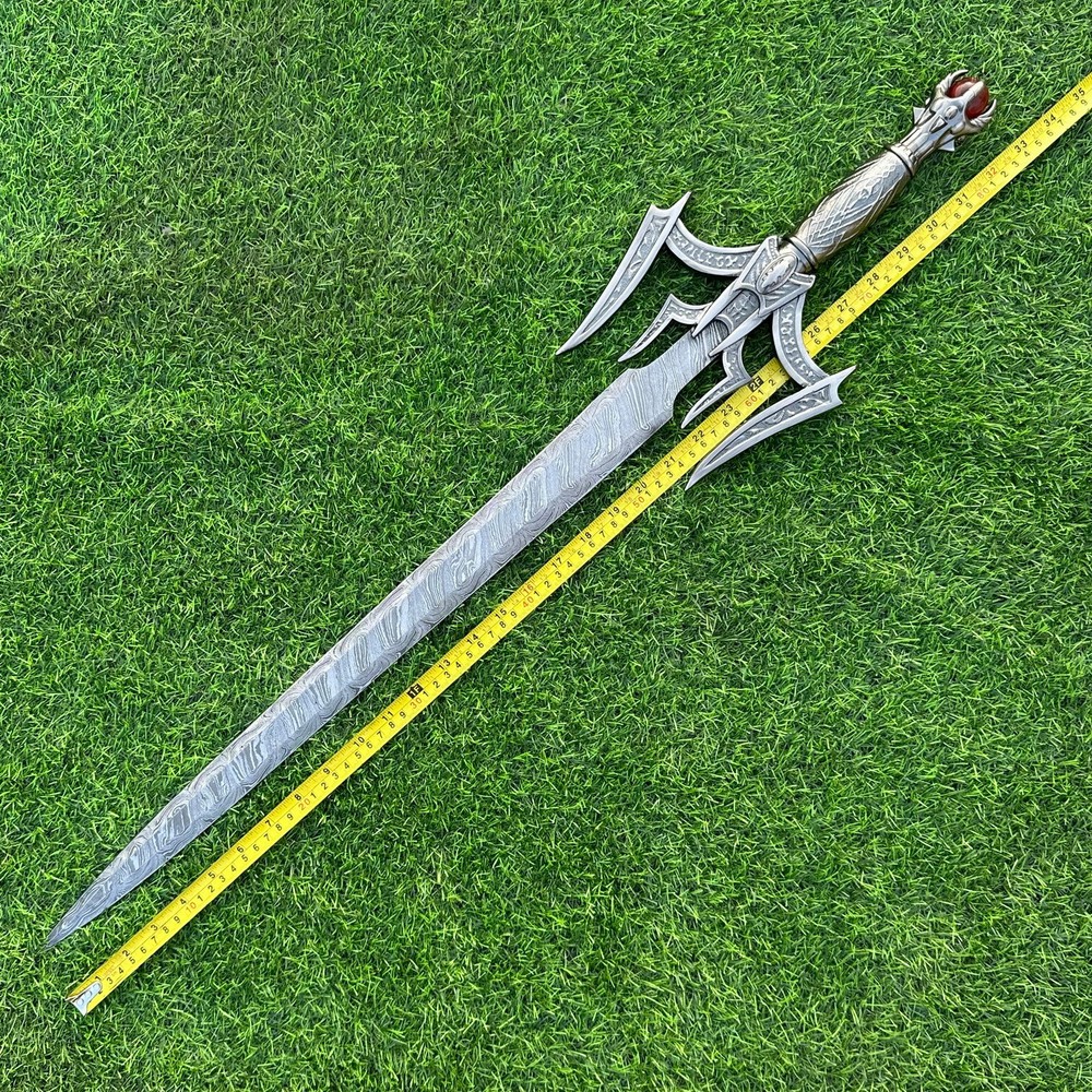 EXCLUSIVE HANDCRAFTED Damascus Steel Blade: A Legendary Sword for the Modern Warrior, Medieval Sword Swords Battle Ready, Hand Forged Sword, Damascus Sword, Long Sword, Viking Sword, Sword, Wedding Gift, With sheath Product Details: Overall Length: Approximately 34.0"inches (Approx.) Blade Material: Genuine Damascus Steel Blade Hardness: 54-58 HRC Handle Material: Pewter Size Verification: To help you easily determine the size, we've included images with a scale for precise dimension reference. Thank you for your understanding. We appreciate your consideration. Included Accessories: Sheath -excellent husband wife gift -Wedding gift -Father's Day gift -Mother's Day gift -Birthday Gift -Groomsmen gift -Christmas gift -Luxury Gifts For Men -Anniversary gift for husband -Thanksgiving Gift For International Customers: We kindly advise our international customers to familiarize themselves with their country's regulations prior to making a purchase. If customs in your region request customs duties, please be prepared to cover these costs. Regrettably, we cannot assume responsibility, nor issue refunds in such cases. Our Damascus Steel Creation Process: At our workshop, we take immense pride in crafting authentic Damascus steel knives that surpass mere acid etching. Here's an overview of our Damascus steel-making process: 1. Material Selection: We meticulously combine 1095HC and 15N20 nickel carbon steel for our blades. 2. Layering: The chosen steels undergo repeated heating and folding to achieve a remarkable 384 layers. 3. Acid Burn: Following the layering process, the blade is treated with acid, revealing the brilliant nickel shine and a dark gray hue in the high carbon steel, thereby showcasing the stunning Damascus patterns. 4. Blade Finishing: Concurrently, we expertly sharpen the blade's edge, transforming the acid-treated edge into a striking satin finish. Our unwavering commitment to preserving the authenticity and craftsmanship of Damascus steel ensures that each knife in our collection showcases intricate layers and delivers exceptional performance. AGE LIMITATION: Please note that we exclusively sell knives to individuals who are 18 years of age or older. Additional Details: Leather Sheath (if pictured): Rest assured, this item comes with a superior-quality, sheath. Crafted with meticulous hand-tooling and stitching, it exemplifies fine craftsmanship and is designed for exceptional durability. The added stitching ensures it withstands years of demanding use, providing reliable protection for your knife throughout its lifetime. Care and Maintenance: When necessary, use a Diamond Wet Stone or a superior sharpening tool to maintain a 20-degree blade edge. After use, clean the item with soap and water, ensure thorough drying, coat it with gun oil, and store it separately from the sheath. Leather absorbs moisture from the air and can lead to blade rust if stored improperly. Customer Feedback: Your satisfaction and feedback are of utmost importance to us. We genuinely appreciate your positive reviews! When assessing shipping time, please consider international transit. Your recognition bolsters our confidence to enhance our services. If you encounter any issues with your order or product dissatisfaction, please reach out to us first. We are committed to resolving any concerns to your satisfaction and kindly request you not to leave neutral or negative feedback. Payments & Returns: All accepted eBay payment methods are available for this purchase. Our return policy typically extends to 14 days. Shipping and Handling: We offer free shipping on all our products (In the USA) Tracking Info: The buyer will receive the tracking number via email (if available). You can also track the shipment in the "Order Details" section on eBay. USPS UPS DHL updates tracking information nightly (if available). Contact: Feel free to contact us anytime via eBay messages. We are dedicated to responding to your inquiries within 24 hours and providing the best possible assistance.