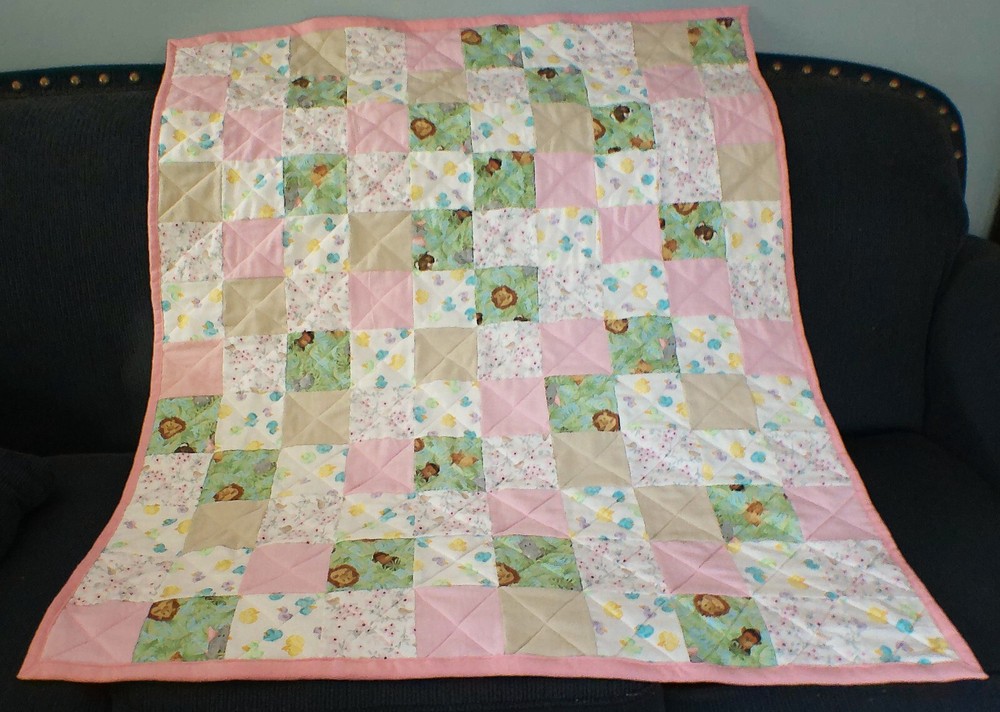 This item is a handmade baby girl's crib quilt made from all new flannel materials and featuring wildlife including monkeys, lions, giraffes, tigers, elephants, ducks and little birds along with coordinating prints. The coordinating color prints are pink and tan. This quilt's front and back are made from cotton flannel materials; the quilt contains new cotton batting. It is 40" x 46" in size. This quilt comes from a non-smoking, pet-free pet home. The buyer is to pay $10.99 shipping. Thanks for looking.
