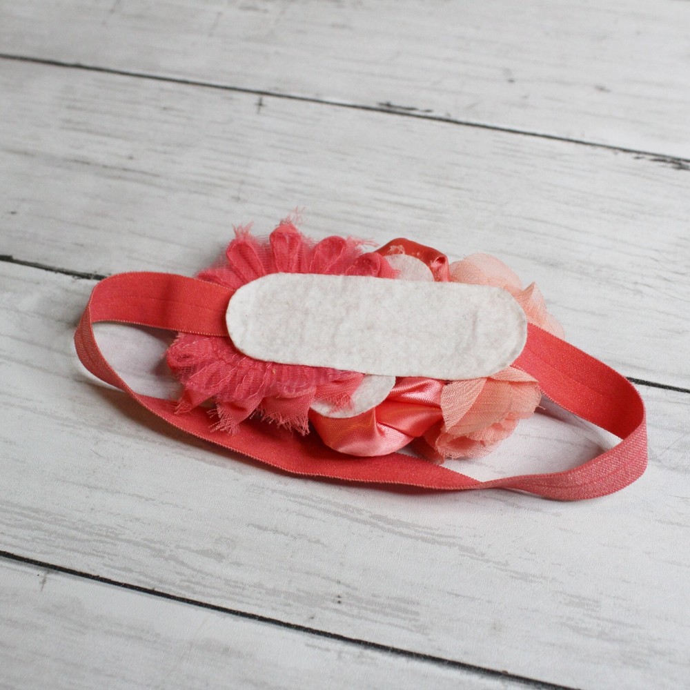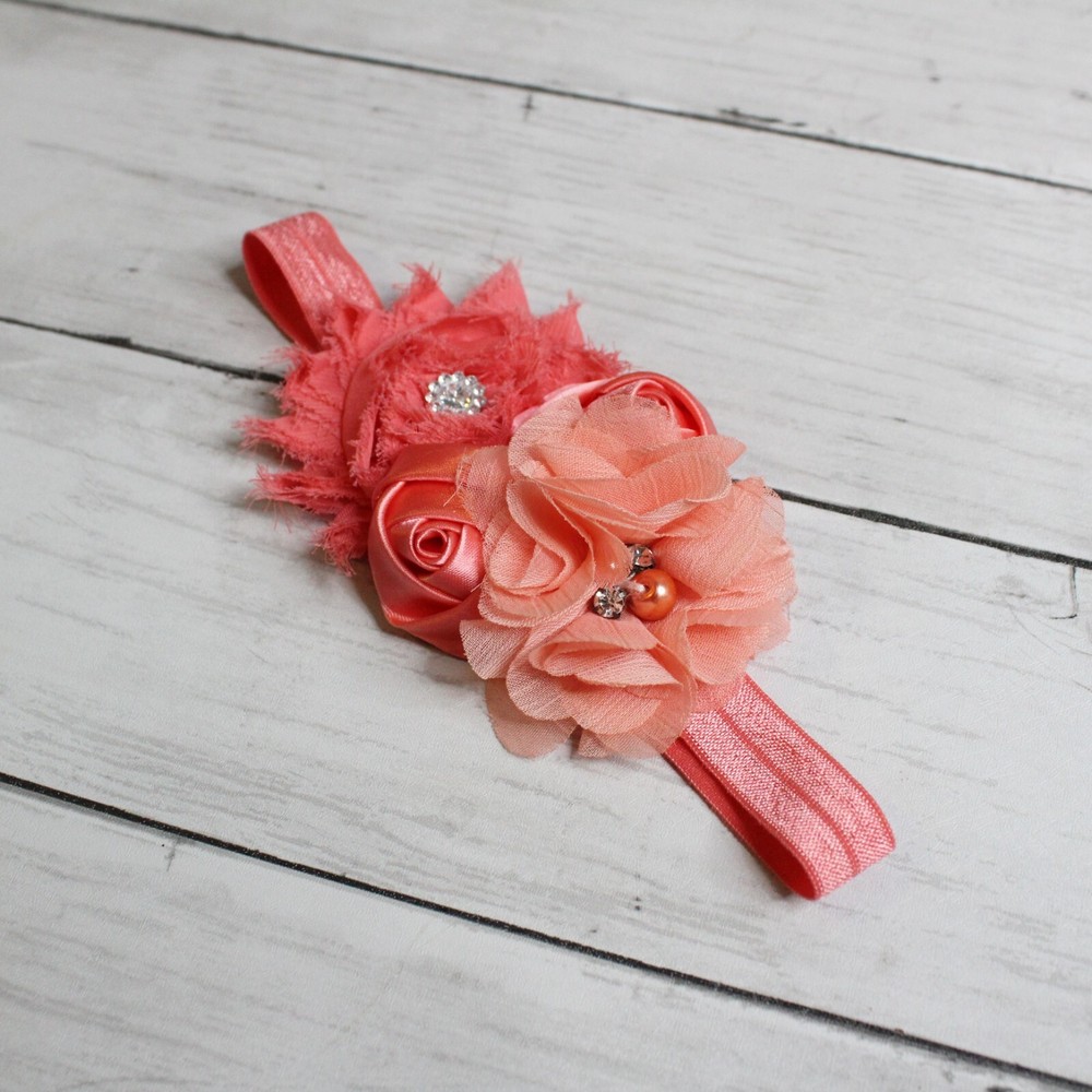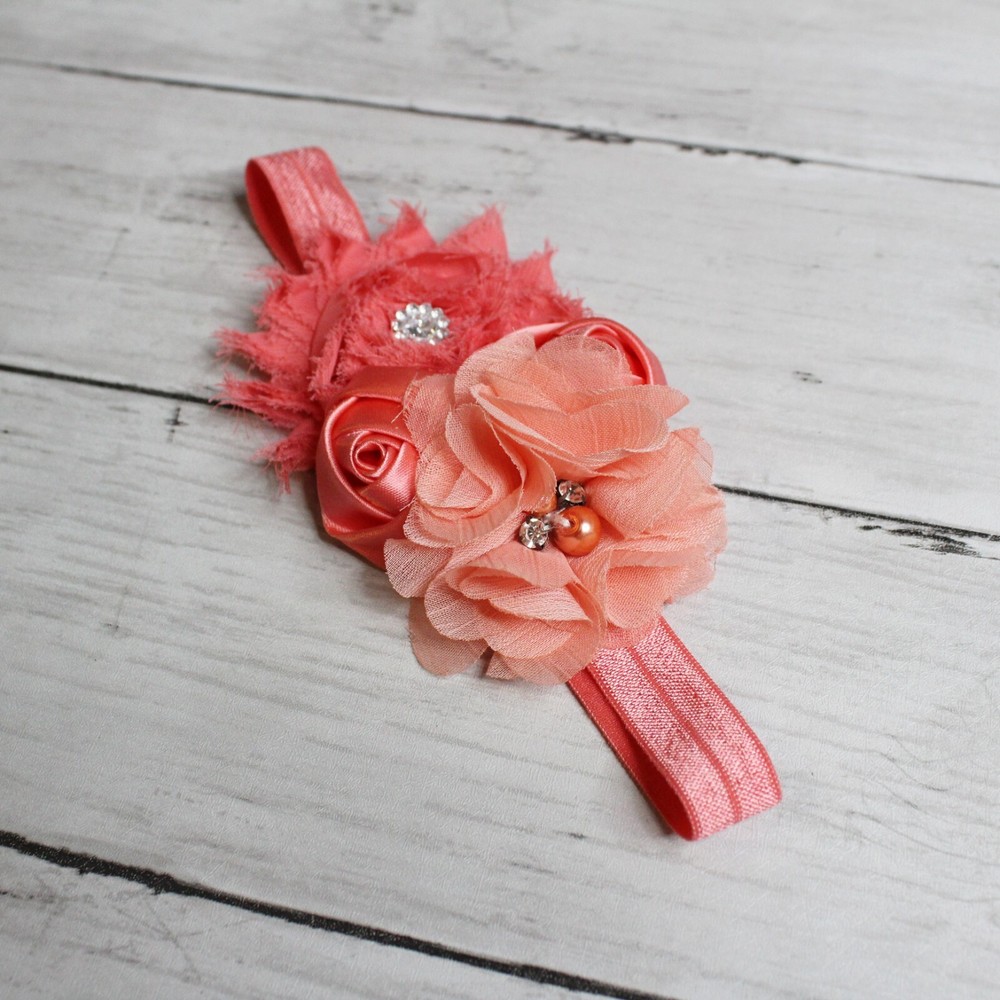 Handmade Elastic Headband Coral Orange Infant Baby Girl One Size This handcrafted headband is coral orange with slight pink hue with tulle flowers, satin rosettes, faux coral pearls and jeweled gems. It was only worn a couple of times and is in excellent hardly used condition. Item contains small parts and could cause choking hazard. Use under adult supervision only.