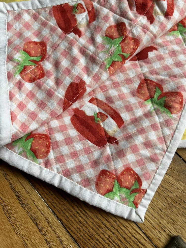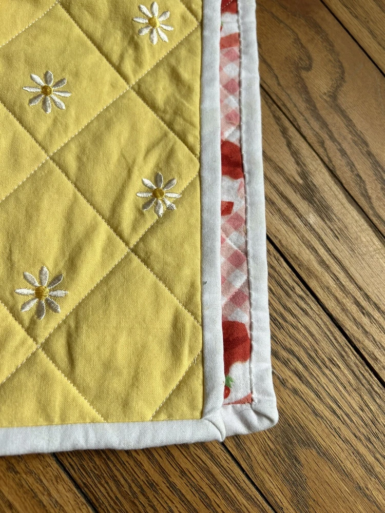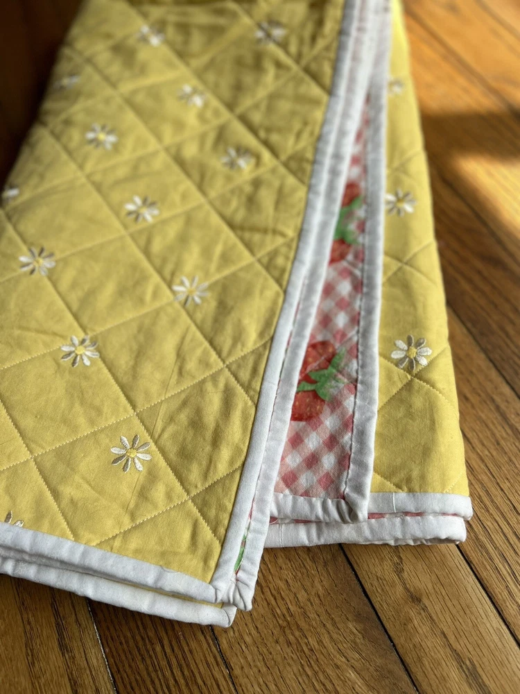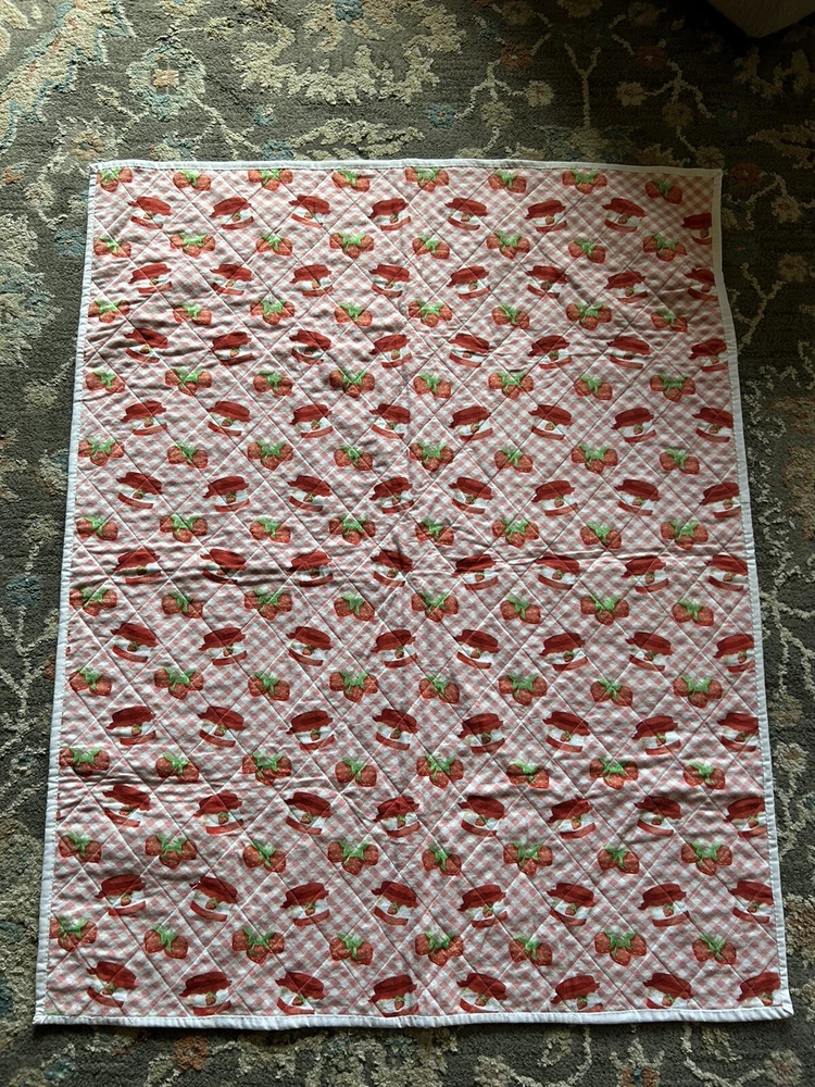 Handmade Babygirl Quilt Crib Daisies Strawberry Jam Summertime White Trim. This quilt was made by me :) All supplies purchased from JoAnn Fabrics. All fabrics prewashed. Top is cotton fabric with embroidered daisies. The backing is flannel gingham. The trim is hand stitched. Clean smell. Smoke free home. Please feel free to ask any questions. This is a handmade item so imperfections will exist. H01