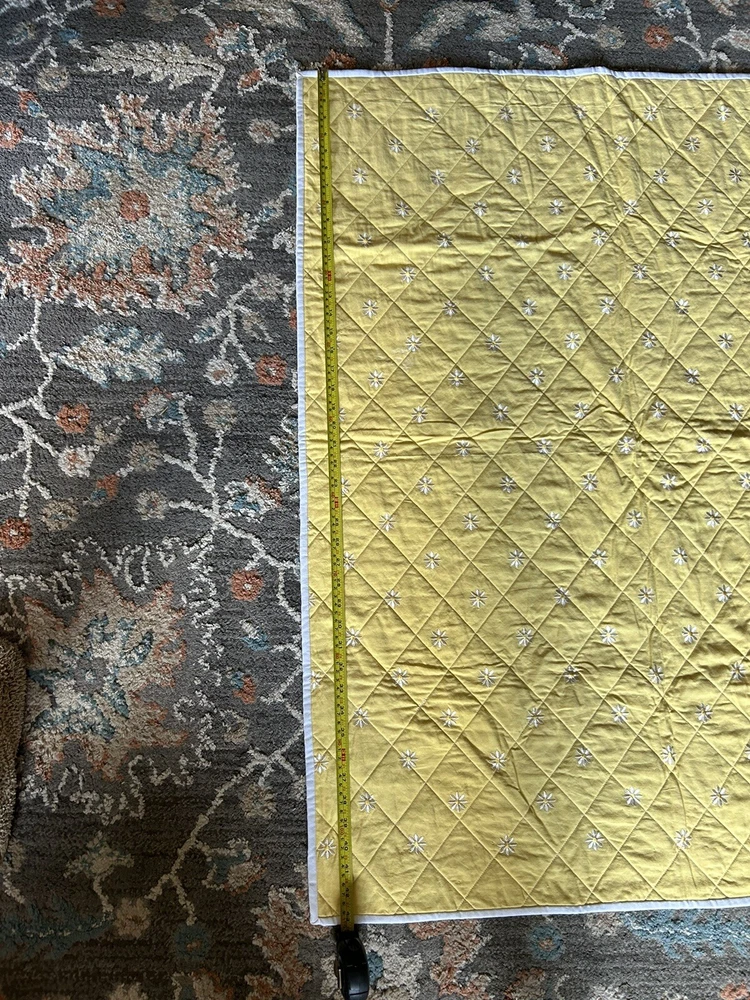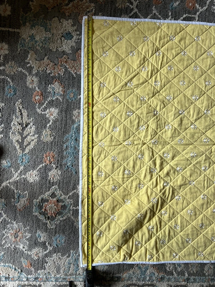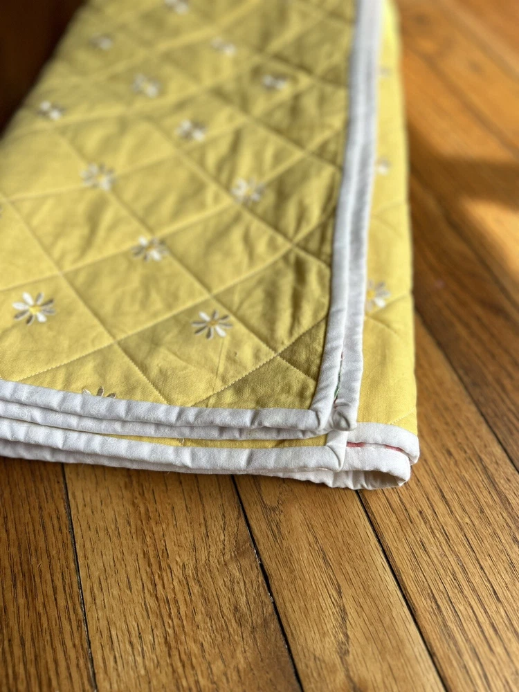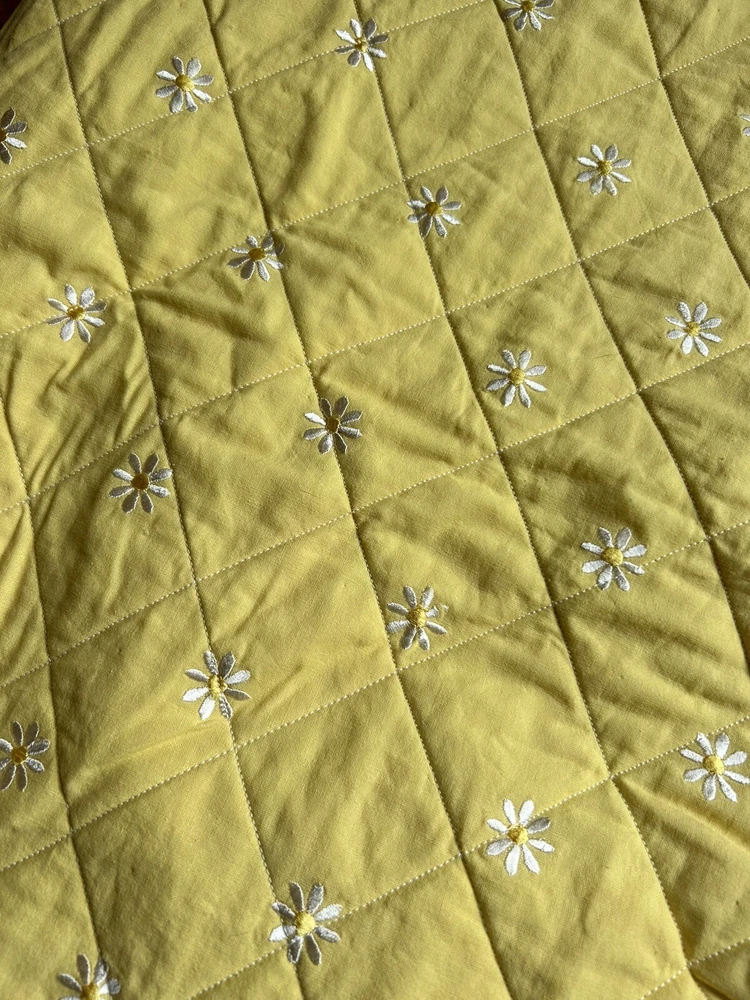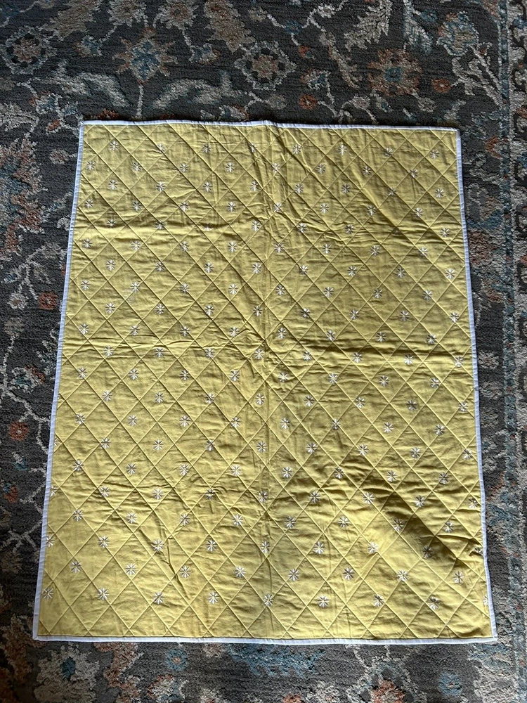 Handmade Babygirl Quilt Crib Daisies Strawberry Jam Summertime White Trim. This quilt was made by me :) All supplies purchased from JoAnn Fabrics. All fabrics prewashed. Top is cotton fabric with embroidered daisies. The backing is flannel gingham. The trim is hand stitched. Clean smell. Smoke free home. Please feel free to ask any questions. This is a handmade item so imperfections will exist. H01