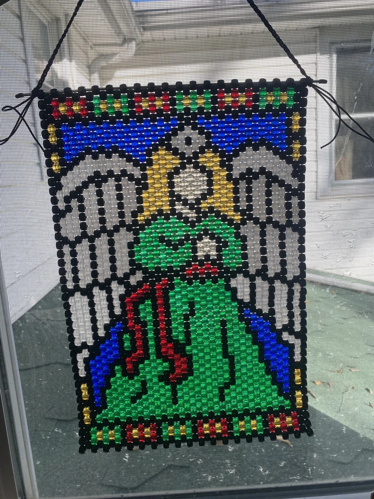 Handmade beaded banner measures about 15“ x 10“