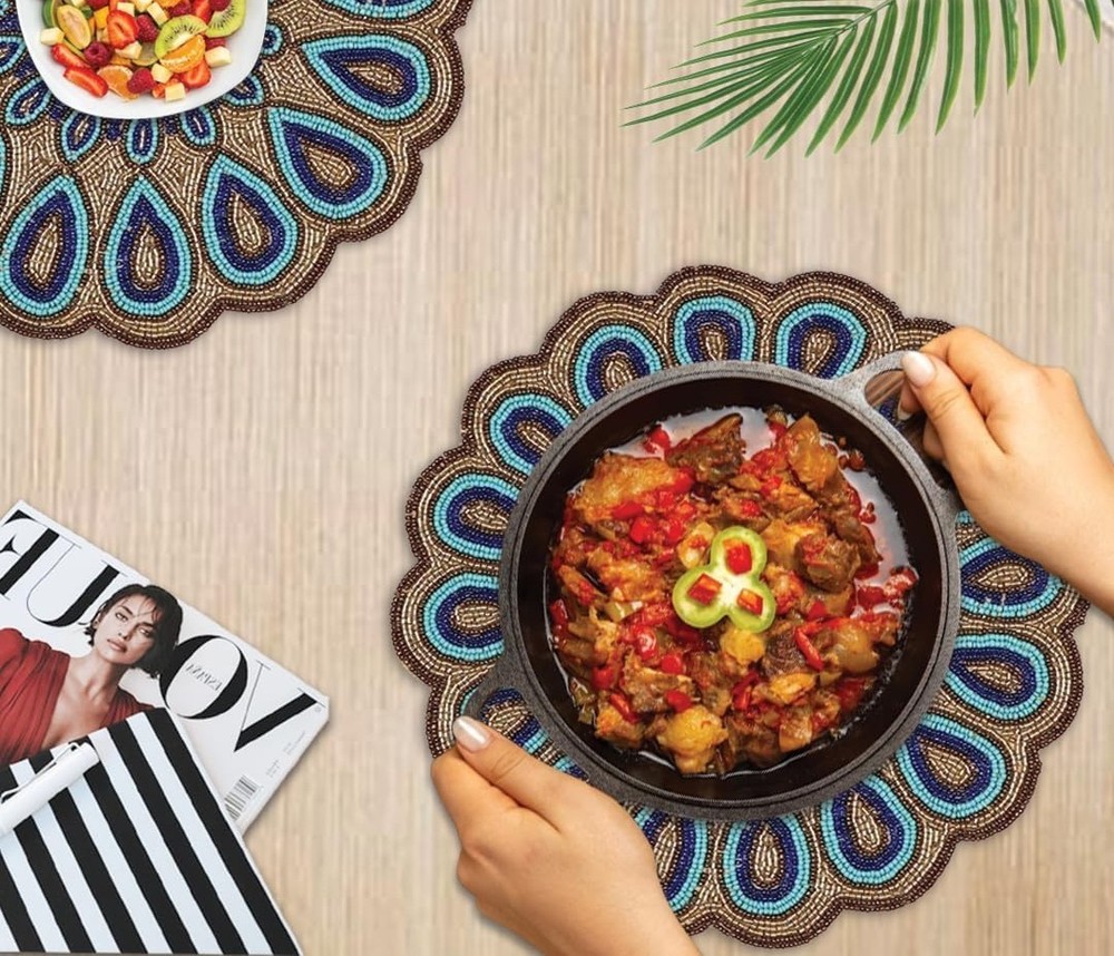 This handcrafted beaded placemat is a unique and stylish addition to any table setting, featuring glass beads in a beautiful blue color. The abstract pattern and boho luxe design make it perfect for special occasions like engagements, weddings, or anniversaries. The round shape and 14 inch diameter add a touch of elegance, while the beaded feature adds texture and charm. Made in India, this placemat is sure to add a touch of beachy or Christmas-inspired whimsy to your table decor. Remember to hand wash only to maintain its quality. Quantity : Set of 2