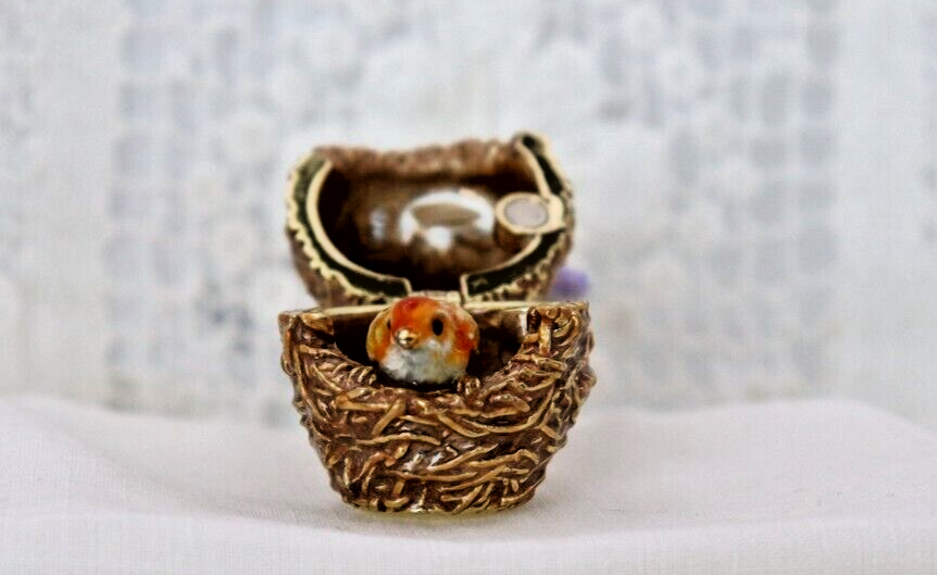 This handcrafted trinket box is designed as a bird nest with two adorable little birds and is adorned with Austrian Crystals by artisan Keren Kopal from Israel. The intricate details and colorful design make this piece a unique and original work of art. Perfect for storing small treasures or serving as a decorative piece, this one-of-a-kind trinket box is a beautiful addition to any collection. 3H x 1 1/4 x 1 3/8" D LBL Migration considers all offers. We know you will love your little treasure, but if for some reason you don’t, we will take care of you!