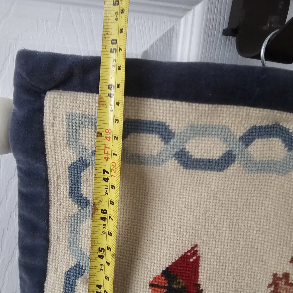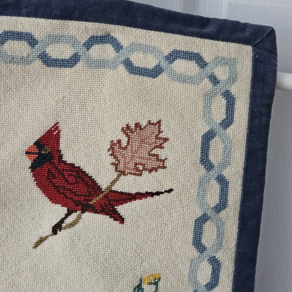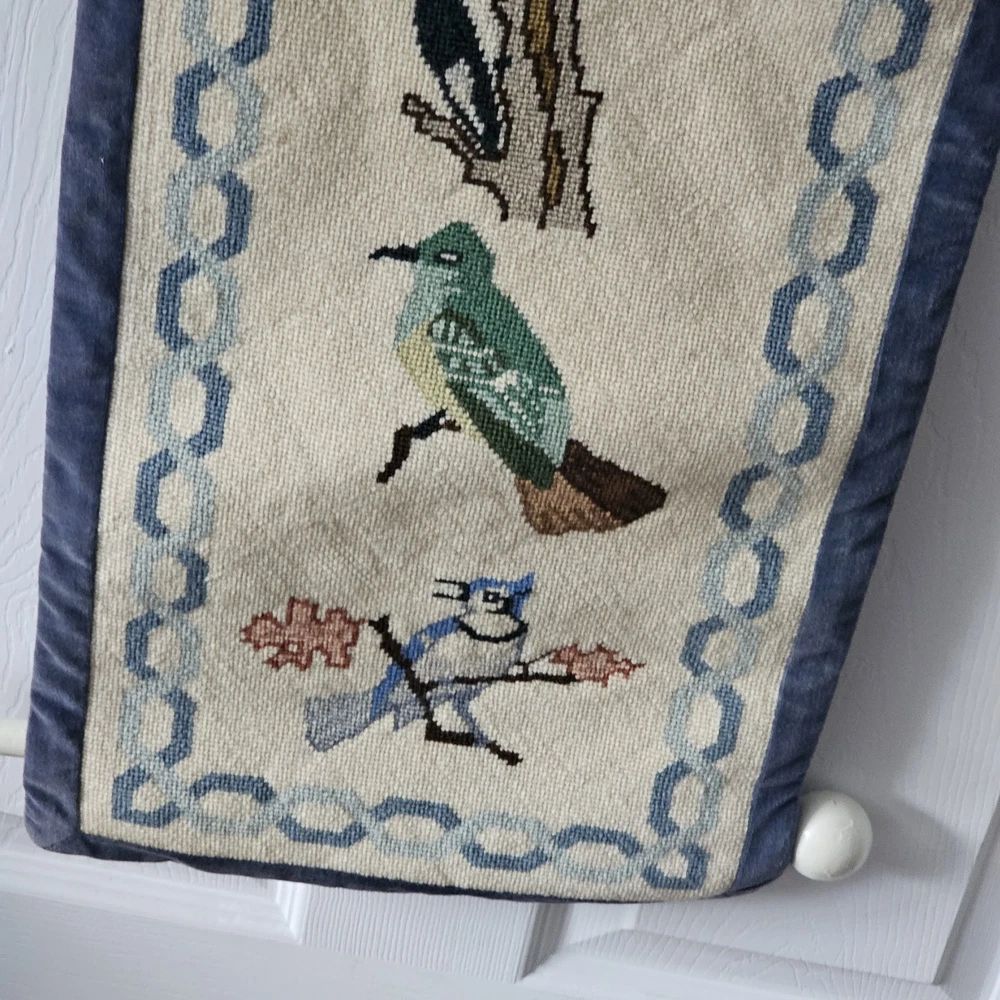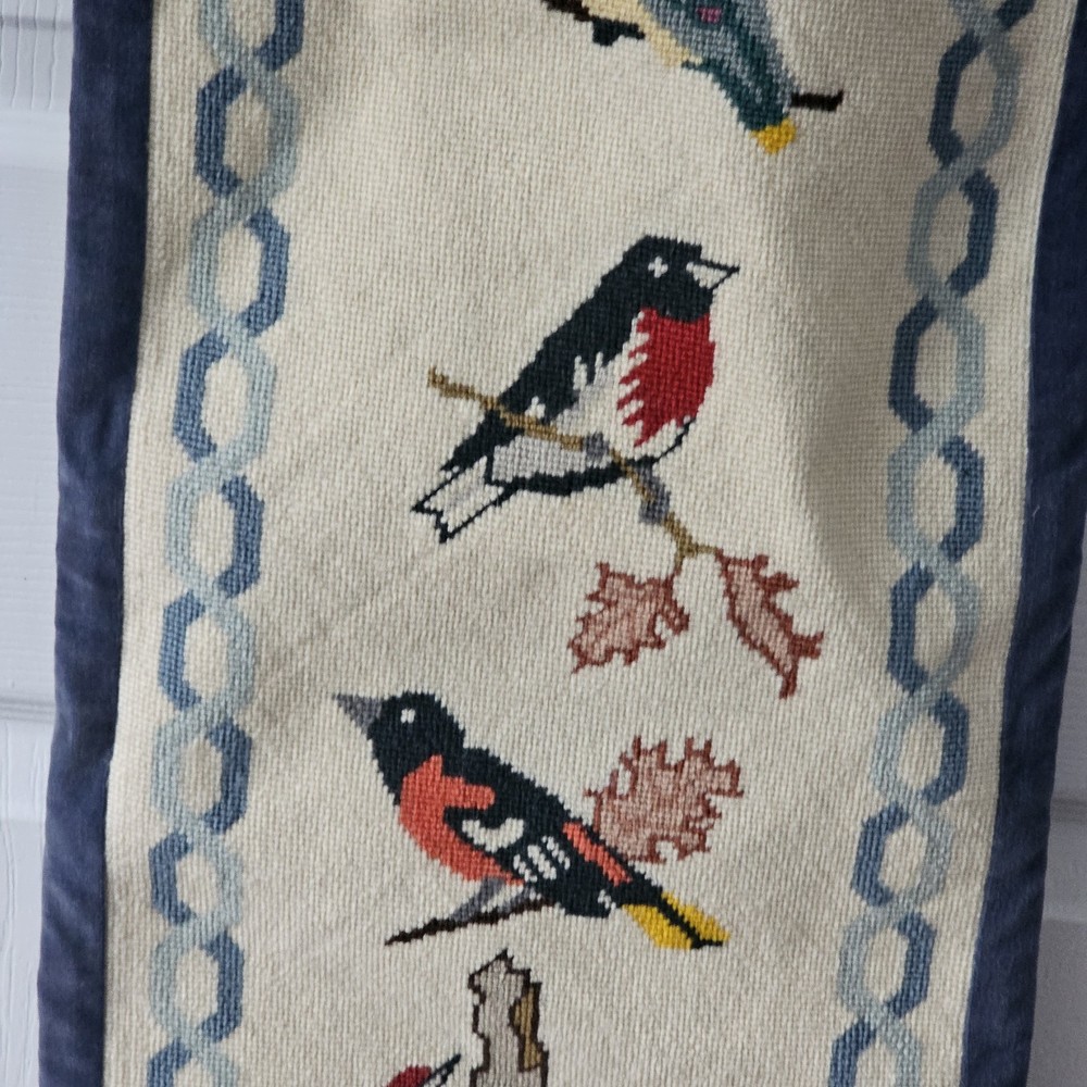This handmade Birds Needlepoint Cross Stitch Wall Hanging features intricate needlepoint embroidery on a velvet border, creating a beautiful and unique piece for your home decor. Measuring 50x12 inches, this wall hanging showcases the craftsmanship and attention to detail that comes from handmade work. Perfect for adding a touch of artistry to any room, this cross stitch piece adds a charming and elegant touch to your space. Some scratching on wooden ends. Velvet backing. See photos for imperfections sold as is