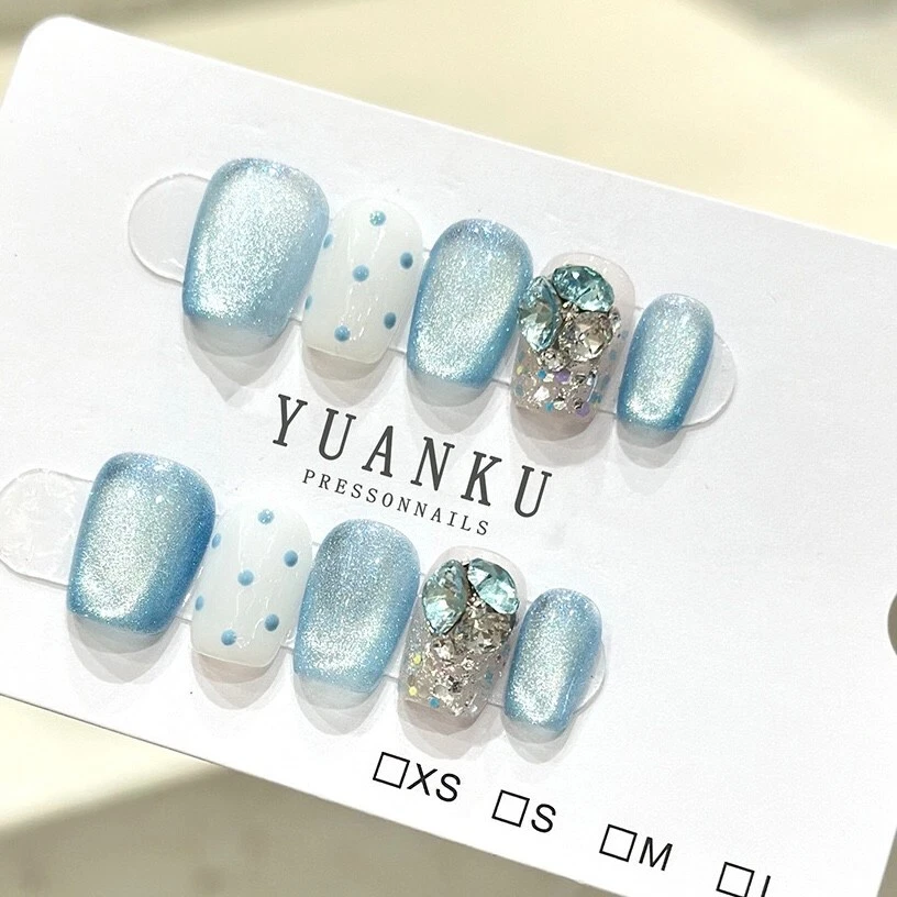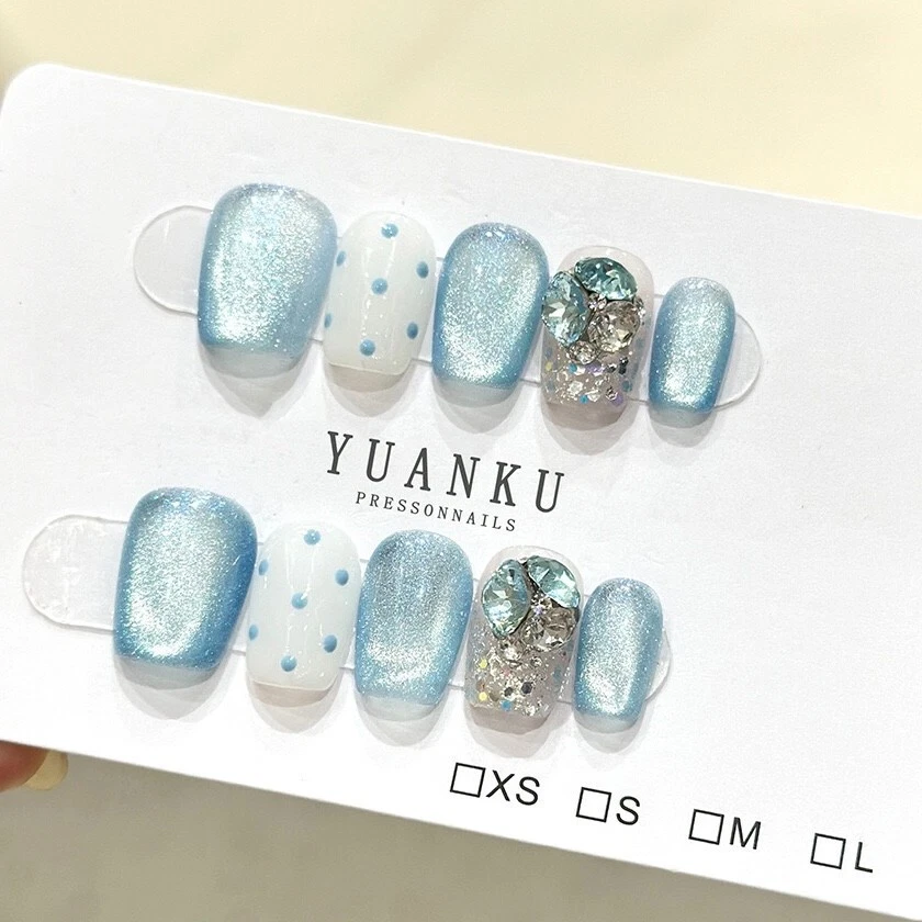 Handmade Blue Shimmer Diamond False Nail Short Coffin Press on Nail Nail Art