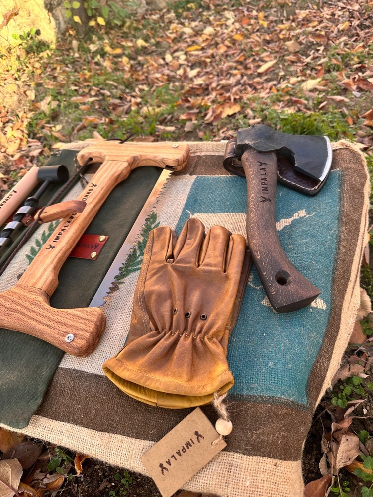 We've brought together everything you need for a trip into nature in this set. You'll receive Impala's highest quality and most exclusive products in one package, presented in a beautiful wooden box. The set contains a total of 7 pieces. When you order, you will receive the following products: ➡️Handforged Axe (including leather sheath) 🪓FEATURES🪓 🪓Steel: Handforged High Carbon Steel 🪓Steel Hardness: 58 HRC 🪓Handle: Beech Wood 🪓Sheath: Handmade Leather Sheath 🪓Total Length: 12 inches (approx. 30 cm) 🪓Blade Weight: 1.34 lbs (approx. 600 grams) 🪓Edge: Razor Sharp for ready to use! ➡️Leather Bushcraft Gloves 🍁 FEATURES 🍁 🌳Made from genuine calfskin. 🌳Due to the natural material, it is very normal for there to be differences in color and texture. These different textures of the natural material make your glove unique. 🌳It has a standard size. ➡️American Oak Bucksaw(including canvas case) 🦌FEATURES🦌 🌟Model:Umpa Lumpa Bow Saw 🌟Wooden Part: American Oak Wood 🌟Blade : Original G-man Chainsaw 🌟Total Lenght: 14.8 inch 🌟Cutting Length : 10.2 inch 🌟Total Height: 7.8 inch 🌟Bow Saw Weight: 1.2 lbs (approx.) 🌟Total Weight: 1.4 lbs (with Canvas Case) (approx.) ➡️Bushcraft Auger(20mm, incluing canvas case) 🌿FEATURES🌿 🍀The length of the auger is 9,84 inch(25 centimeters). 🍀Auger drilling diameter is 0,8 inch(20 mm) 🍀Total weight of only 1 lbs(approx. 430 gram) ➡️Wood Care Balm (30 ml) (1pcs.) ⭐FEATURES⭐ 🍃Special oils such as our own production beeswax, linseed oil, walnut oil, St. John's wort oil and sandalwood are used. ➡️Leather Care Balm (70 ml) (1pcs.) ☀️FEATURES☀️ 🌲It protects and nourishes the skin. It contains beeswax, petroleum jelly, and special oils. ➡️Handmade Wooden Box(1pcs.) 🎁FEATURES🎁 📦Wooden box, handcrafted entirely from the finest pine wood, is specially made for this set.