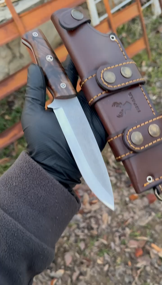 This entirely handmade, scandi-edged bushcraft knife is crafted for nature enthusiasts seeking control and durability. Made from the highest quality stainless N690 steel, it boasts exceptional sharpness, high corrosion resistance, and durability. This results in a knife of such quality that you can even pass it down to your grandchildren. Thanks to the scandi edge, you can easily handle tasks like chopping wood, starting fires, and carving trees in nature. You can even shave with its sharply sharpened blade! The stabilized wood used in the handle creates a unique design, making your purchase truly special! Its hard structure and smooth texture also provide ergonomic use! Hurry to get one of these amazing knives! It makes a fantastic gift option for nature lovers, hunters, and camping enthusiasts! Give your spouse, boyfriend, or father an unforgettable gift! π DETAILS π π Steel: N690 Stainless Steel π Hardness: 61 HRC π Grind: Scandi Grind π Construction: Fixed Blade π Total Length: 9.85 inch π Blade Length: 5.50 inch π Blade Thickness: 0.17 inch π Handle: Stabilized Wood (Walnut,Maple or Amboyna) π Sheath: 100% Handmade Leather Sheath