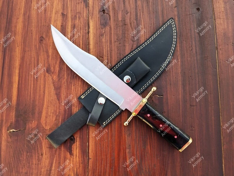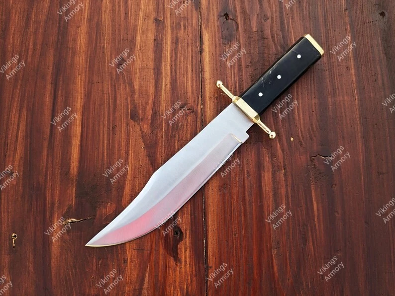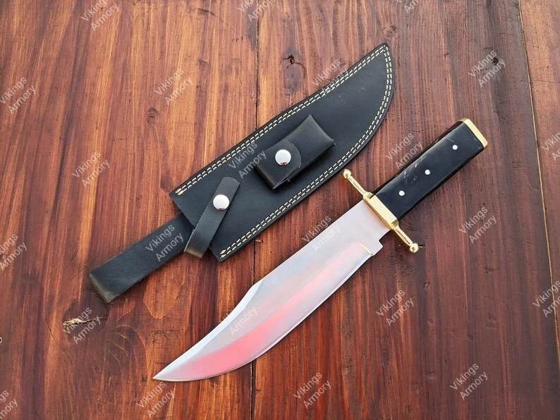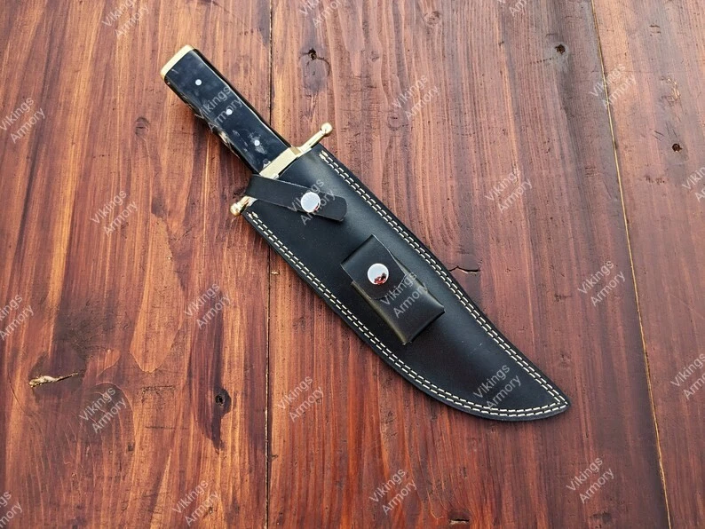 Vintage Bowie Knife – Custom Handmade Smithsonian-Style Replica Handmade Antique-Inspired Bowie with Buffalo Horn Handle & Leather Sheath Presenting a beautifully crafted Vintage Bowie Knife, inspired by classic Smithsonian-style historical designs. This handmade piece combines traditional craftsmanship with timeless antique aesthetics, making it an excellent choice for collectors, outdoor enthusiasts, and gift buyers alike. Each knife is carefully handmade with attention to detail, offering an authentic vintage look while maintaining excellent balance and durability. Whether displayed in a collection or carried for outdoor use, this Bowie knife delivers both style and performance. 📏 Dimensions & Measurements Overall Length: 14.5 inches Blade Length: 10 inches Handle Length: 4.5 inches 🛠 Materials Blade Material: High-quality Carbon Steel Handle Material: Genuine Buffalo Horn, securely fitted with a Brass Guard Sheath: Premium handmade Leather Sheath (included) 🌟 Key Features Handmade vintage-style Bowie design Smithsonian-inspired antique appearance Strong and durable carbon steel blade Natural buffalo horn handle for a classic, elegant look Brass guard for added balance and safety Comes with a high-quality leather sheath 🎁 Perfect For Birthday & Christmas gifts Anniversary & wedding gifts Groomsmen & best man gifts Father’s Day gift Outdoor enthusiasts & collectors Camping, hunting, and display purposes 🧼 Care Instructions Sharpness Warning: Extremely sharp—handle with care. Blade Care: Apply a thin coat of linseed oil to a clean, dry blade to help prevent rust and corrosion. Buff off excess oil. Natural Materials: Avoid water-based products on the blade, handle, and sheath. Leather Care: Use a natural leather balm with beeswax periodically to maintain the leather handle and sheath. Sharpening: Recommended to use carborundum or diamond sharpening stones. ✍️ Custom & Personalized Orders Personalization and custom orders are welcome. If you’d like engraving, size changes, or bulk orders, feel free to message us—we’ll be happy to assist.