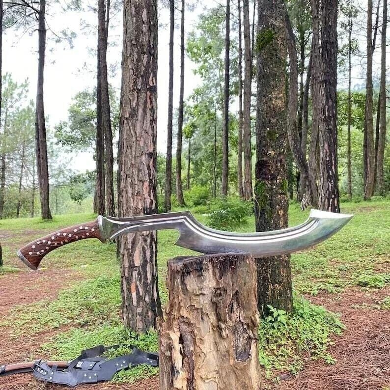 "A MASTERPIECE OF ANCIENT WARFARE REBORN" "A SYMBOL OF POWER AND WARRIOR PRESTIGE" Custom Handmade 5160 High Graded Carbon Steel Blade "HISTORICAL DESIGN TRADITIONAL BLADE EGYPTIAN KHOPESH SWORD" Historical Masterpiece for Collection Hunting - Camping "BEST Gift for LOVE ONCE" "All Our Knives are Handmade, Durable, Certified and Assurance Guaranteed" OUR AIM IS TO ENSURE YOU RECEIVE THE HIGHEST QUALITY PRODUCTS AND SERVICE ITEM DESCRIPTION OVERALL LENGTH 32 inches BLADE LENGTH 24 inches HANDLE LENGTH 8 inches TOTAL WEIGHT 1610 Grams approx HANDLE MATERIAL Great Looking Hand Forged BEST QUALITY Knife Handle is Made up of High Quality Rosewood BLADE MATERIAL 5160 High Carbon Steel SHARPNESS Excellent Sharpness (You Can Further Sharpen it According to your Taste) ROCKWELL HARDNESS 50 TO 55 HR ACCESSORY TYPE PREMIUM LEATHER SHEATH (Pouch) made of Original Cowhide is included "QUESTIONS" If you have any question feel free to send us message we aim to answer all questions within 24 hours "FEEDBACK" Please leave us a positive 5 STAR feedback, our system will automatically leave you a positive feedback within minutes If you are not satisfied with our service please contact us before leaving any negative or natural feedback. We will resolve all issues as quickly as possible "PAYMENT" We accept only PayPal. All major credit and debit cards are accepted through PAYPAL "DISCLAIMER" By Bidding / buying, you certify that you are 18 years of age or older and legally authorized to purchase this product in your country We are not responsible for any injuries associated with the use of our tools Our products are intended for legal use only by responsible buyers Before bidding please check your country laws as some countries Custom don't allow this. If your purchase is held by Custom Authorities in your country/State we will not be responsible for that and no refund will be issued "CUSTOMER SATISFACTION" We are confident that you will like my products as We struggle hard to provide you TOP QUALITY PRODUCTS. In case of problem please write to me before leaving a negative feedback and I will absolutely resolve it. “Your satisfaction is our Reward!” "OUR GUARANTEE" The assurance in our quality allows us to offer you a 15 days money back guarantee. HOW TO TAKE CARE OF YOUR KNIFE (1) Put a thin layer of oil or lubricant on the blade after each use. This procedure will avoid direct contact of moisture on the blade. Moisture helps the rusting phenomena. (2) DO NOT store it in leather sheath for a LONG period of time. Oil it and store it rather in a plastic bag. Thank you for your Interest in our Products F or custom and Bulk Quantity Order Please Send us E-Mail