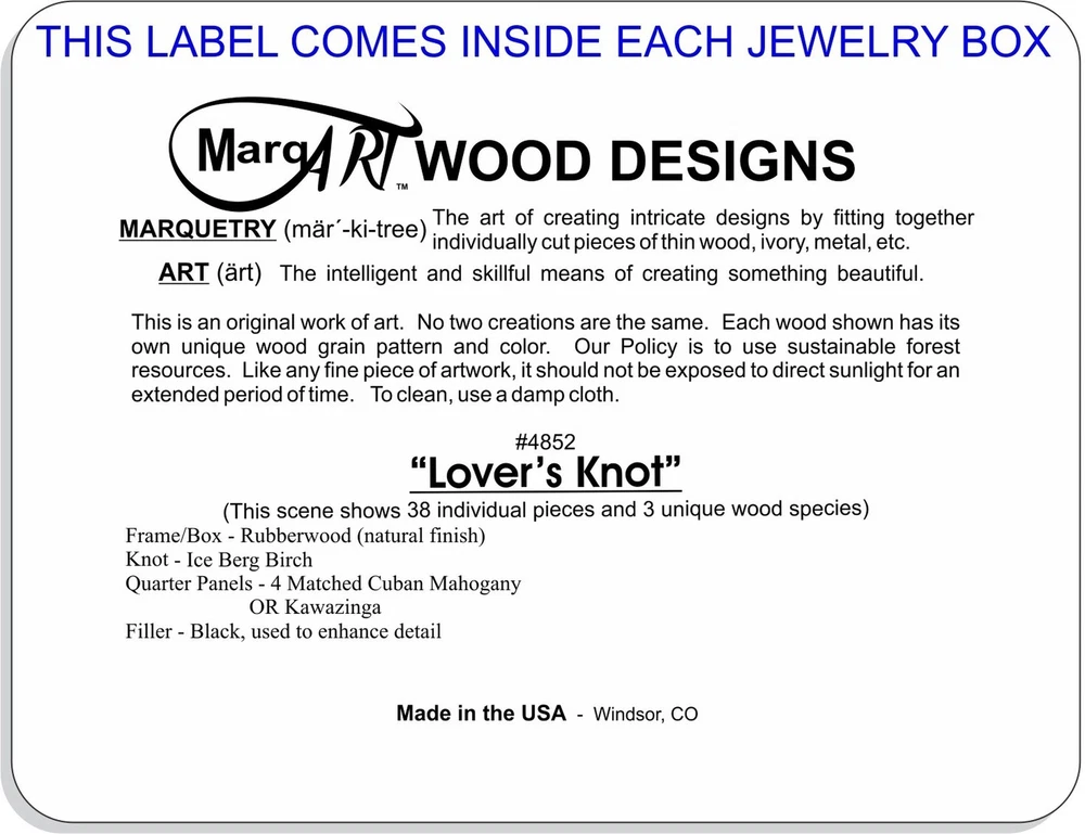 Wood Art Celtic Box - Handmade USA - Unmatched Quality - Unique, No Two are the Same - Original Work of Wood Art. A Celtic Gift, Ring, Trinket or Wood Jewelry Box (4852 Celtic Knot 4x5x1.5) - Buy Now with Fast Shipping! Wood Art Celtic Box - Handmade USA - Unmatched Quality - Unique, No Two are the Same - Original Work of Wood Art. A Celtic Gift, Ring, Trinket or Wood Jewelry Box (4852 Celtic Knot 4x5x1.5) Product Details Brand: MarqArt Color: CELTIC KNOT BOX (#4852 size: 4"x5"x1.5") Material: Hardwood Special Feature: This is a High Quality, Handmade Jewelry Box - not some cheap foreign imported thing that will arrive broken, scratched, marred or smelling of chemicals., This unique wood box is expertly crafted. The wood has a fine satin finish that minimizes smudges or finger prints and keeps it looking new., Solid Sturdy Construction - It will not Fall Apart. It is designed and built to last a lifetime, it will not fall apart after a few days, weeks or months like many of our competitors imported products., This unique wood trinket boxes inside is lined with black velvet to protect your jewelry., The jewelry boxes bottom is finished in a fine tan velvet to help protect your furniture. See more Style: Celtic Box Brand: MarqArt Color: CELTIC KNOT BOX (#4852 size: 4"x5"x1.5") Material: Hardwood Special Feature: This is a High Quality, Handmade Jewelry Box - not some cheap foreign imported thing that will arrive broken, scratched, marred or smelling of chemicals., This unique wood box is expertly crafted. The wood has a fine satin finish that minimizes smudges or finger prints and keeps it looking new., Solid Sturdy Construction - It will not Fall Apart. It is designed and built to last a lifetime, it will not fall apart after a few days, weeks or months like many of our competitors imported products., This unique wood trinket boxes inside is lined with black velvet to protect your jewelry., The jewelry boxes bottom is finished in a fine tan velvet to help protect your furniture. Style: Celtic Box Recommended Uses For Product: For storage, Jewelry Product Dimensions: 5.25"L x 4"W x 1.5"H Capacity: 1 Pounds Water Resistance Level: Not Water Resistant Item Weight: 5.76 ounces Opening Mechanism: Hinge Shape: Rectangular Pattern: Letter Print Number of Items: 1 Number of Compartments: 1 Unit Count: 1.0 Count Item Package Quantity: 1 Material Feature: mature plantation trees that are no longer able to produce latex UPC: 098801000206 Closure Type: Hinge Item Weight: 5.8 ounces Manufacturer: MarqArt Wood Designs Item model number: 4852 Is Discontinued By Manufacturer: No Date First Available: December 13, 2013 Key Features ✅ Unmatched Quality . . Sturdy Construction - Designed and Built to last a Lifetime ✅ An Original work of Art - No two are the same. . Using Sustainable Forest Resources ✅ Hand Made in the USA - Not some cheap foreign import. . . . . Size: 4x5x1.5 Inches ✅ This Design shows 38 individual pieces and 3 unique wood species. ✅ We are a small, family run business. We are proud of our work & we stand behind it. Product Description