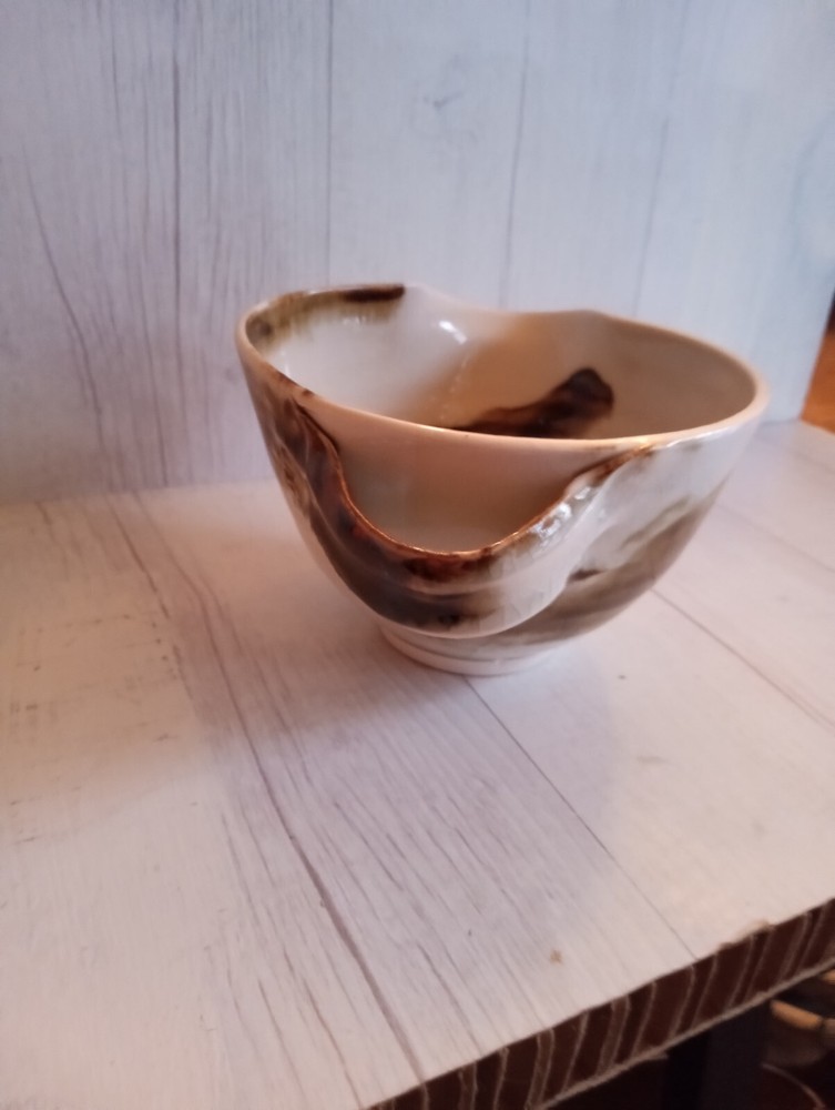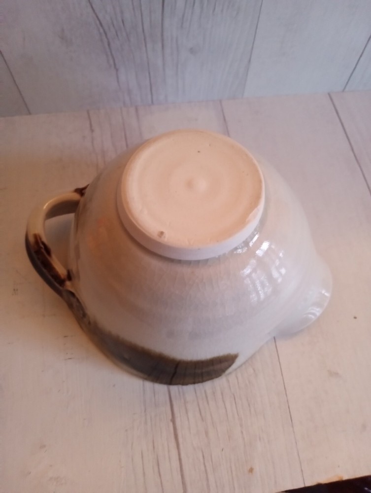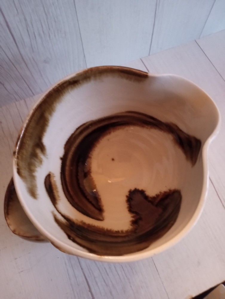 This is a handmade footed pottery item could be a creamer could be a bowl ... You decide white & brown tone swirl effect with a glossy finish. Handle on one side.