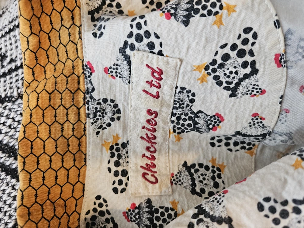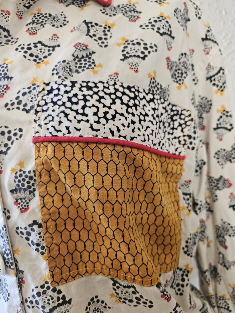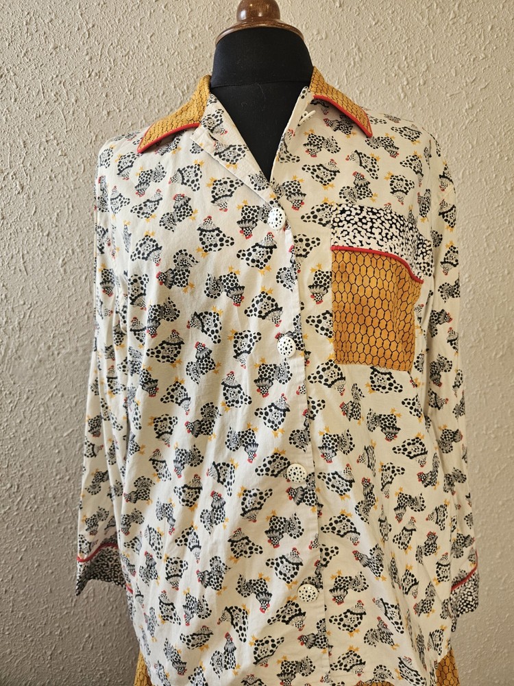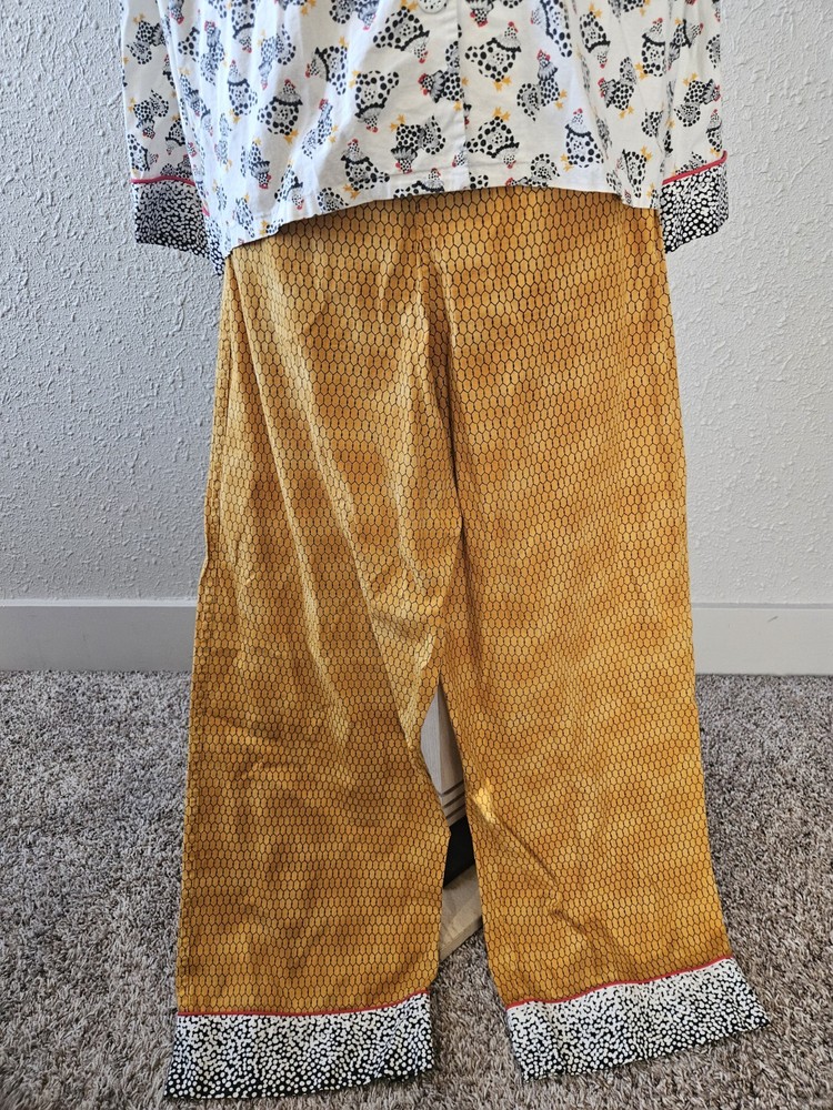 Adorable handmade women’s pajama set featuring a charming chicken print—perfect for cozy nights or relaxed mornings with a touch of farmhouse flair 🐓✨ This unique 2-piece set includes a long sleeve button-up top and matching pants in coordinating prints. The playful chicken pattern paired with mustard yellow honeycomb accents gives it a fun cottagecore, country-chic vibe. Details: Size: Women’s M/L (see fit notes below) Brand: Handmade (tagged “Made with Love by Grammy”) 2-piece set: button-up top + pull-on pants Long sleeves with contrast cuffs Chest pocket with coordinating fabric Elastic waistband for comfort Lightweight, breathable fabric Unique chicken & honeycomb print design Fit: Relaxed, comfy fit — best suited for Medium to Large depending on desired looseness. Condition: Excellent handmade condition. No noticeable stains, tears, or flaws.