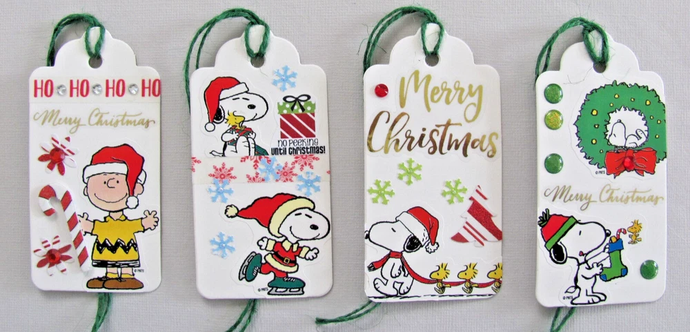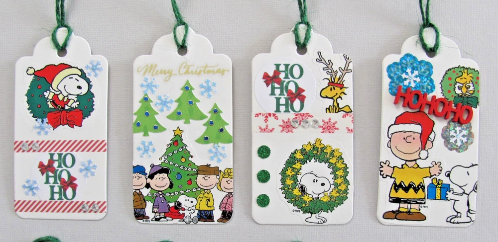 Welcome to Peggy's Paper Cuts! I am happy to combine shipping cost! One of a kind listing for 8 handmade Christmas gift tags created with Current Stickers featuring cartoon characters, Snoopy and Charlie Brown. Measure 2" x 4" On back of each tag is a festive To-From label so you can personalize your gift. Add these cute tags to gift bags, treat bags, gift packages or gift baskets. Enhance journal pages & scrapbooking layouts, create handmade greeting cards, hang on the tree, dress up a holiday tablescape or give the set as a gift! Design details include 3D effects, misc stickers, Washi tape, jewel gems, hand punched embellishments, Stickles glitter glue, glitter paper and green twine ties. You will receive actual 8 gift tags displayed in photos. Gift tags will arrive wrapped in tissue paper and plastic. Shipped with added protection of a bubble mailer and tracking . Returns accepted within 30 days of purchase.