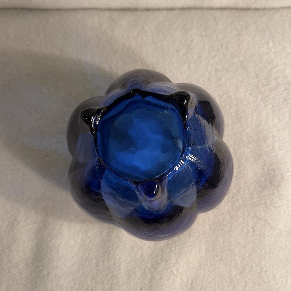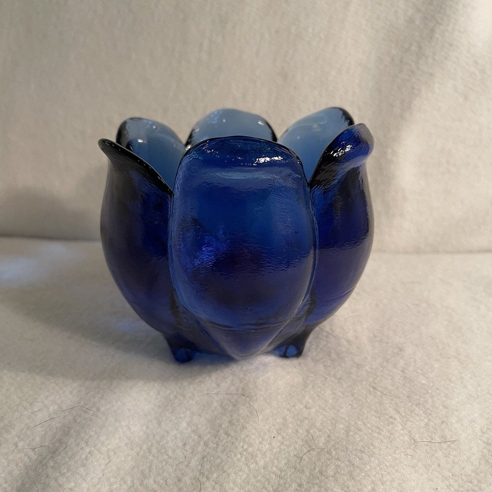 This handmade cobalt blue tulip flower shaped glass dish candle holder is a unique and decorative piece that adds a touch of Mid-Century Modernism to any space. Made in Spain in the 1980s, this original piece features a round shape and a vibrant blue color. The intricate design and handmade quality make it a standout collectible for those who appreciate handmade items and vintage decor. This candle holder is not only functional but also adds a stylish and artistic flair to any room. Excellent condition. No chips or cracks.