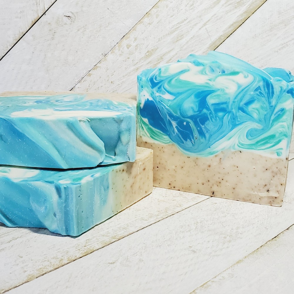 LIFE'S A BEACH smells of Sea Salt, Moss, Jasmine and Mandarin. A 5oz Body bar Handmade in the USA with Organic and Food Grade Ingredients: Coconut Milk, Aloe Vera Juice, Olive Oil, Coconut Oil, Lard, Palm Oil, Castor Oil, Avocado Oil, Cocoa Butter, Shea Butter, Hemp Seed Oil, Beeswax, Kaolin Clay, Jojoba Oil, Colorants. LIFE'S A BEACH was made with the Blues and Greens from the Ocean - with your toes in the Sand. Formulated to be a Moisturizing Body Bar for Him or Her. This is cold process soap, made in small batches with food grade and/or organic ingredients, formulated to provide you a creamy lather with extra Shea and Cocoa butters for Hydration and Moisture. Each batch is unique; Because of this your bar may differ slightly from the pictures above.