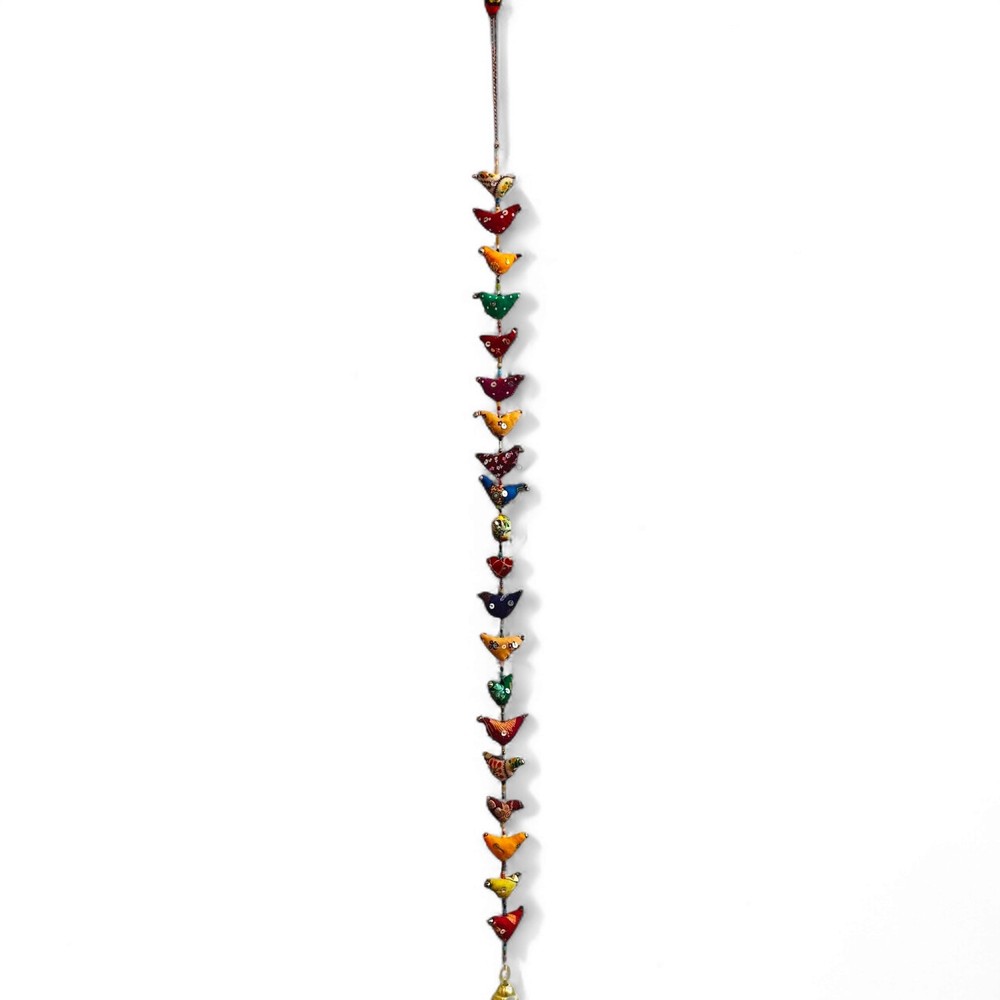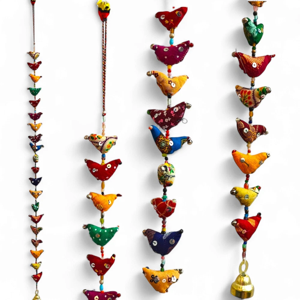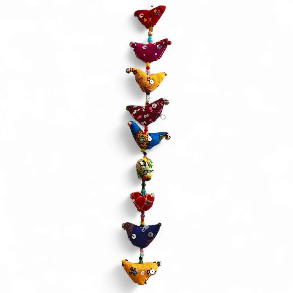 Brighten up your space with this vibrant Handmade Bird Hanging! Crafted by skilled Indian artisans, this stunning wall and door hanging features a colorful chain of fabric birds adorned with mirrors, beads, and a traditional bell. It’s the perfect fusion of boho charm and ethnic Indian craft, ideal for home, balcony, patio, or gifting during festivals like Diwali and Christmas. Key Features: 100% Handmade with love in India Multicolor birds in assorted fabrics Accented with tiny mirrors, beads & embroidery Includes a decorative metal bell at the bottom Length: Approx. 30–36 inches (varies slightly as handmade) Lightweight and easy to hang Perfect For: Boho wall decor Housewarming or spiritual gifts Doorway, living room, kids’ room, or meditation spaces Add a touch of joyful tradition and handcrafted beauty to your home today!