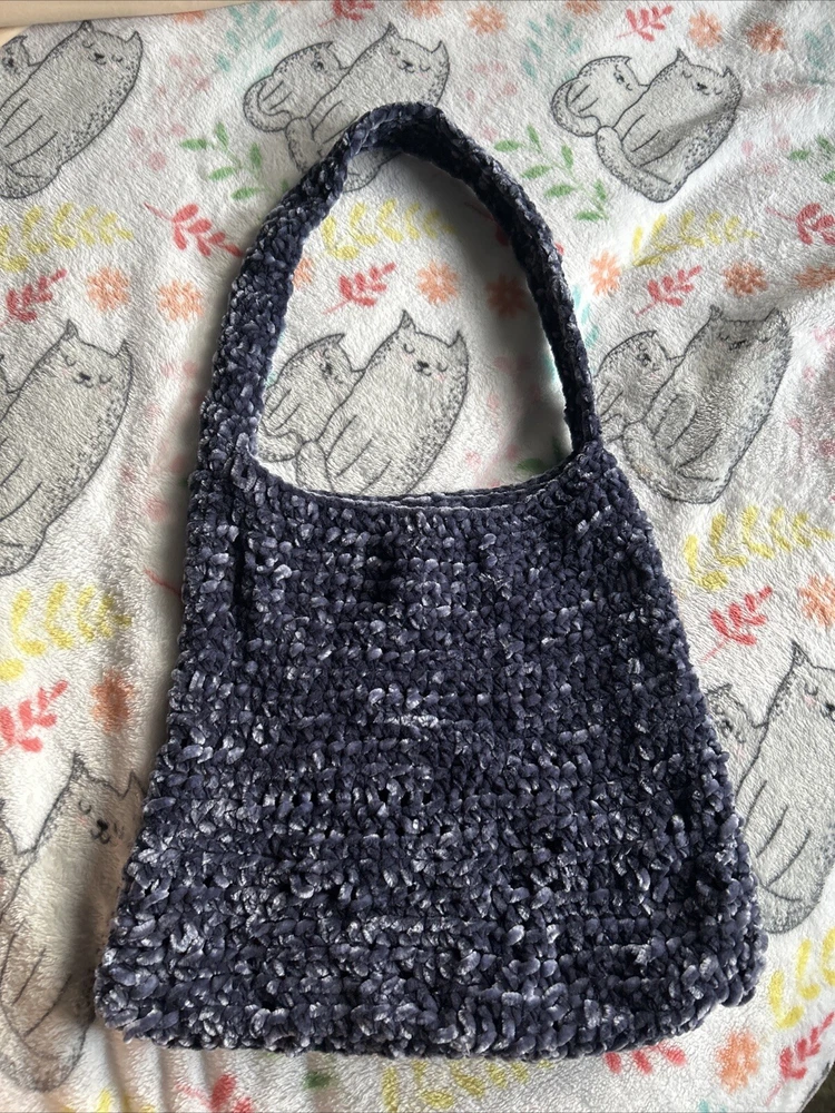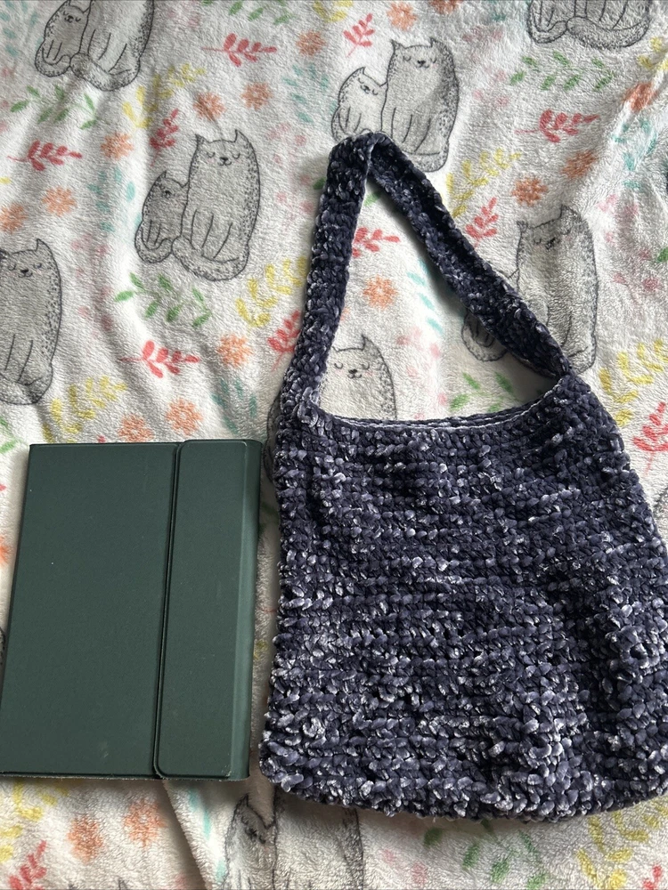 Handmade crochet shoulder bag. Can fit phone, iPad, wallet, keys and more. It’s made with blue velvet yarn, extremely soft, and extremely cute!