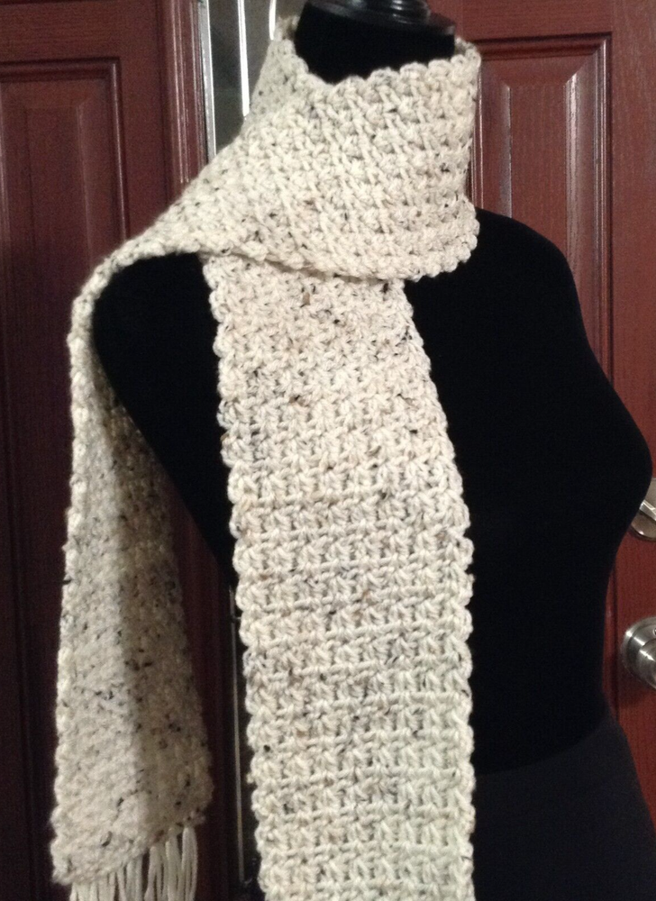 This soft & warm scarf is the perfect scarf for yourself or gift. Ready to mail USPS with tracking Color: Ivory Tweed (blend of ivory, brown and black colors) - Size: 4.5 x 54 - 97% Acrylic Yarn & 3% Viscose Crocheted by me with love and care to every detail. Machine wash in lukewarm water, place in delicate washing bag to protect scarf. Do not bleach, dry clear or iron. Dry on low heat. Thank you for visiting my shop #753