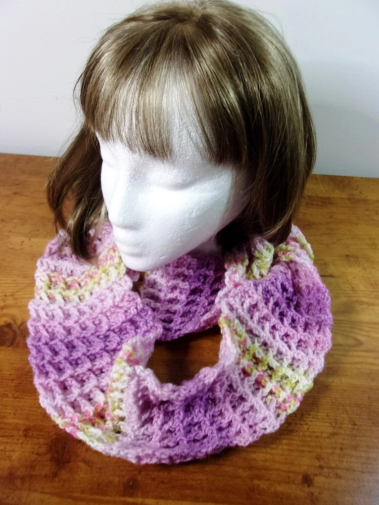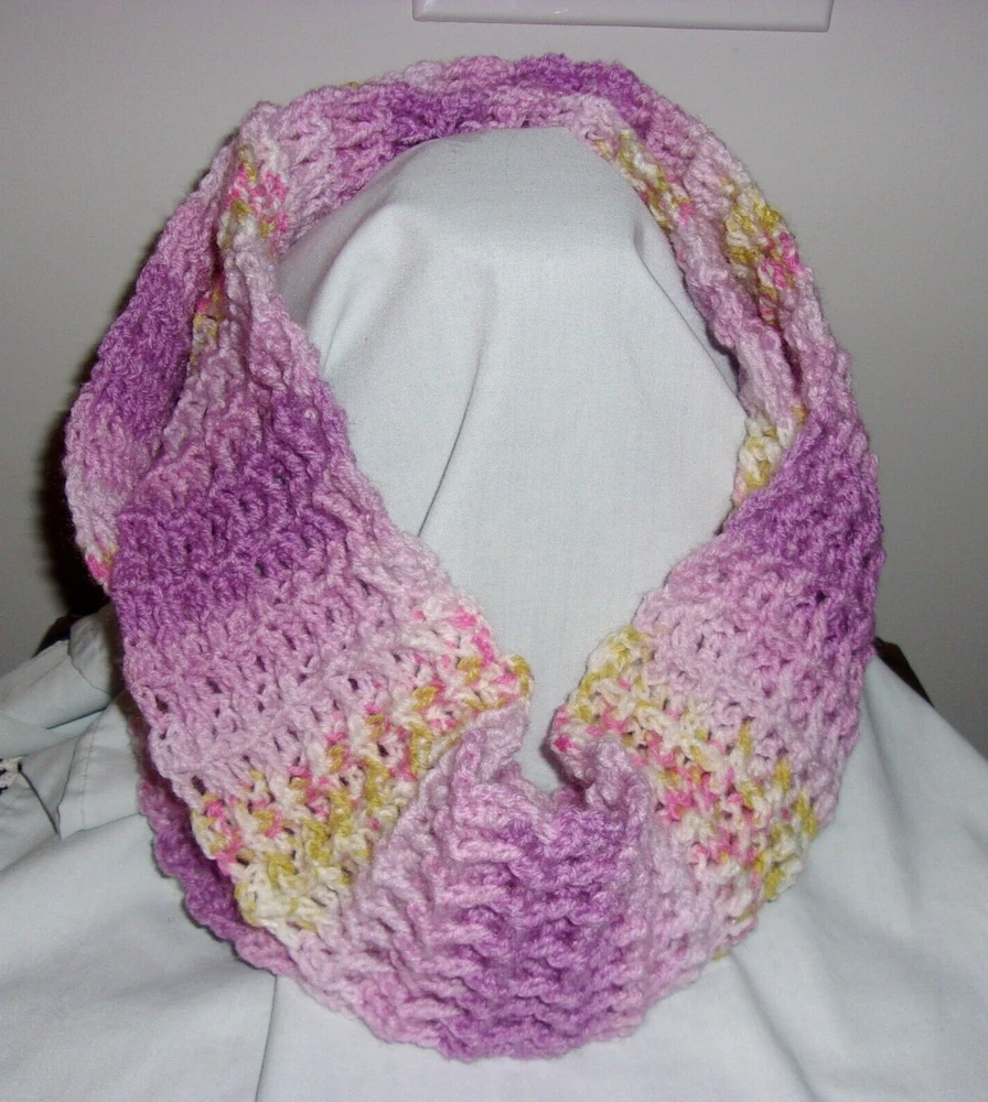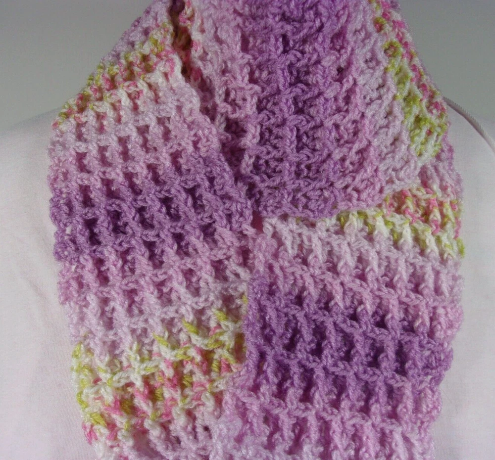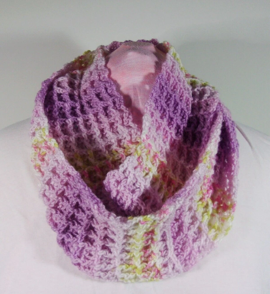 This snuggly scarf is approximately 56" long and 5" wide. It's brand new and features an intricate waffle stitch. The reverse side makes a very interesting texture that's soft and warm, so it looks fine with either side showing. The scarf is joined into a 56" long infinity loop. It's plenty long enough to be worn as a cowl, or even as a hooded cowl! It's handmade of brand new Lion Brand yarn that was made in the USA. I can't remember the name of the color. It's a muted Unforgettable yarn, ranging from a light purple, through shades of sage green to light yellow. This is a very calming and mellow scarf, perfect for a stormy day! I crochet in a smoke free, pet freehome. RETURNS: I stopped accepting automatic returns because of the expense of "buyer's remorse". If there is a mistake in a listing, I will ALWAYS do my best to make it right, if you will contact me immediately! Please visit other listings and see upcoming auctions. I try to list different items on a regular basis. NOTE: I list for family and friends. All items are from smoke free homes. The pre-owned items that I list are used, vintage or just plain old. Items are researched on various sites, to get pricing ideas, and I'll always present reasonable offers to owners of the listings. Items are cleaned, unless the descriptions explain why that isn't possible or wise. Items may show some form of wear, scratches, or other age related imperfections. Items are described as accurately as possible, and I try to get great photos. Please avoid misunderstanding by reading ALL text, and seeing ALL pictures. If you need more information: please ask any questions before bidding/buying. Shipping: I use eBay's calculated shipping, labels, and tracking services. The calculator estimates shipping based on the total weight and size of the package, to your zip code. Please ask for an invoice when buying multiple items, and I'll combine shipping to save your money! Please remember that I must still pay for "free shipping" to you. Sellers have NO control over the cost of shipping . Fees cost sellers OVER 20% of the TOTAL of what you pay . PLEASE keep this in mind when making an offer, and when leaving feedback about what makes up "very fair and reasonable shipping charges". I work hard to earn your 5 star rating! This is a "yard sale" (NOT a professional seller), so I re-use CLEAN shipping materials to help keep costs low. I ship via the Postal Service, asap after payment is received! Please note that eBay cancels unpaid orders on the 4th day. If you’d like to know about new listings, please "follow" and see new listings in your feed. Thanks for looking! Bid/buy with confidence - see my feedback.