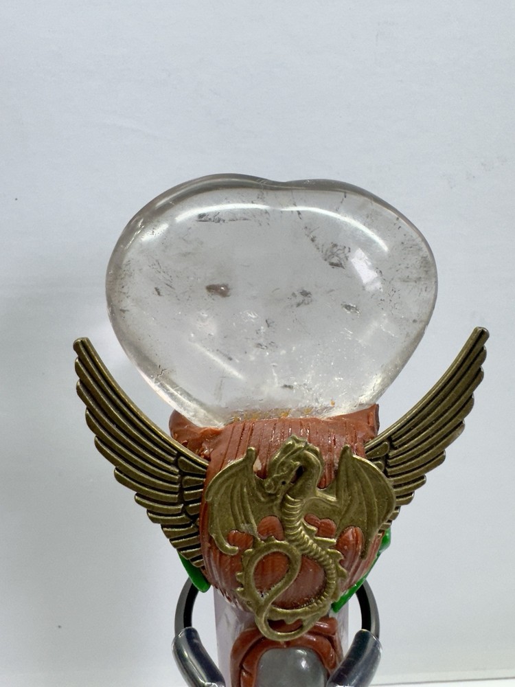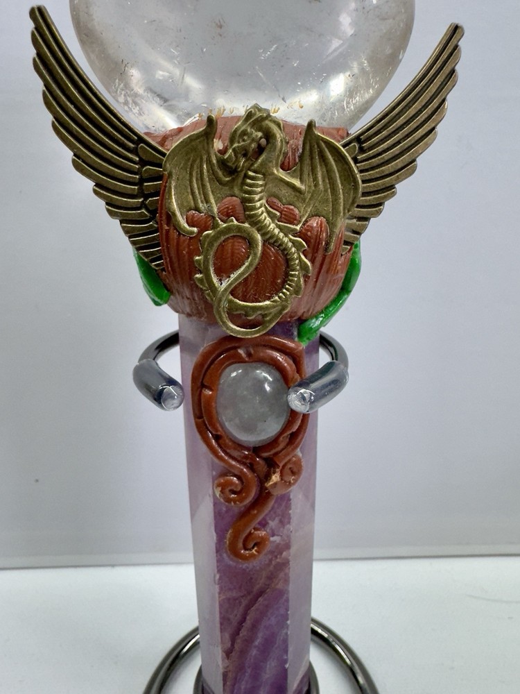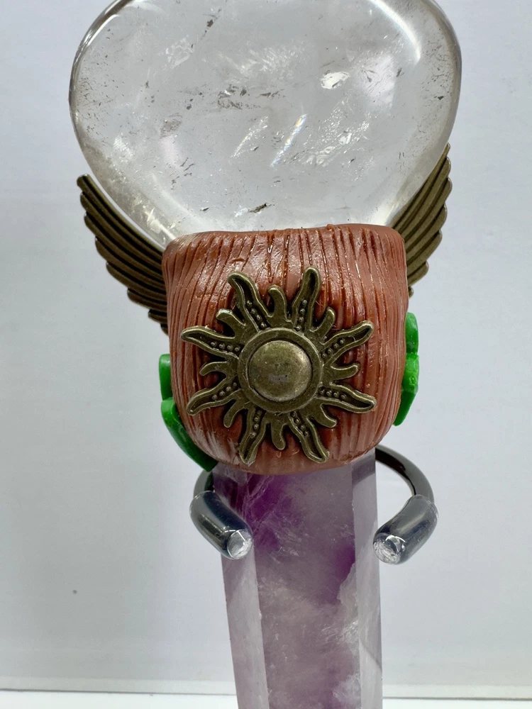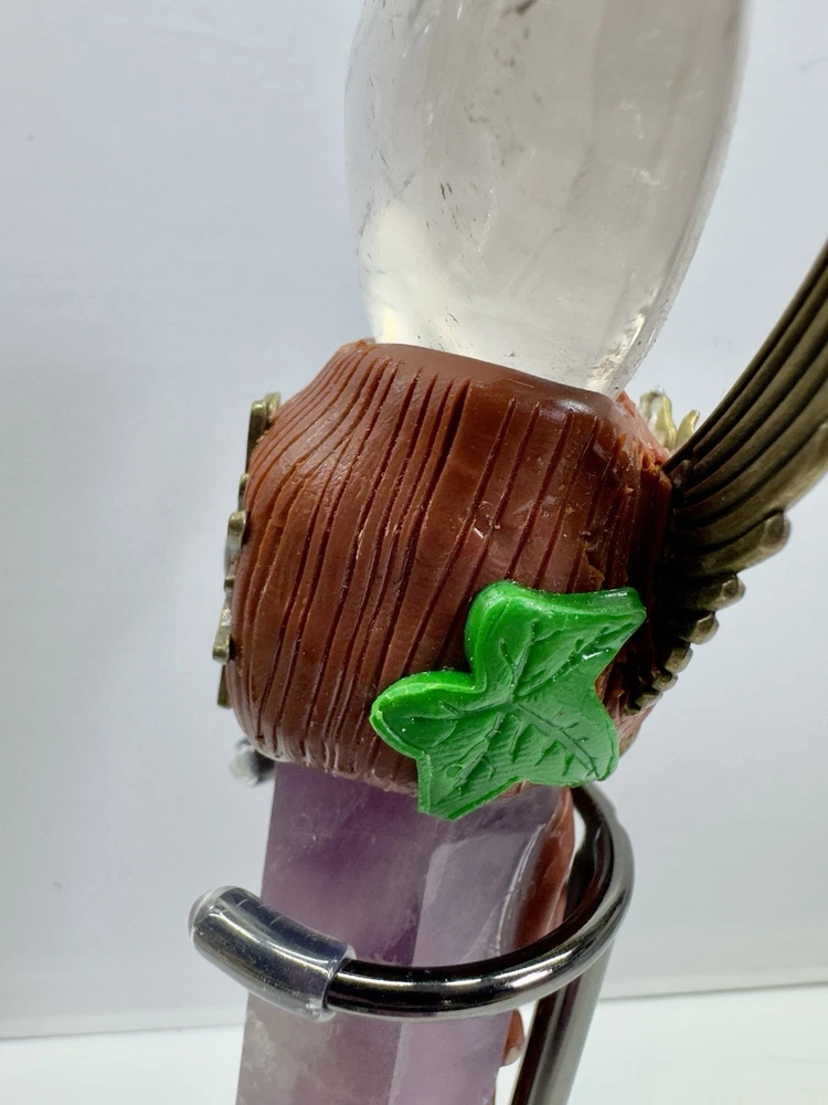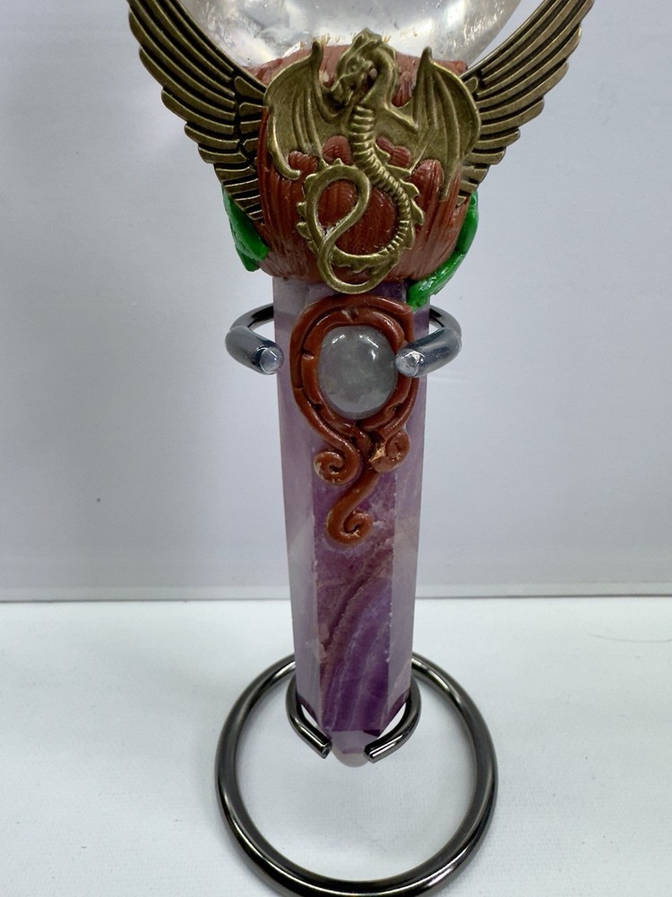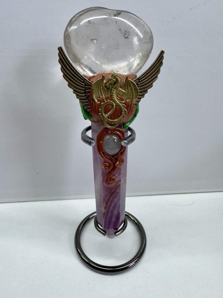 This handmade crystal wand features Amethyst and Clear Quartz, crafted into a powerful magic scepter. The wand is designed with a natural point shape and originates from India. Perfect for those interested in witchcraft or crystal healing, this unique piece combines the properties of Amethyst and Clear Quartz to enhance spiritual practices and energy work. The wand exudes a mystical charm and is ideal for collectors of crystals and mineral specimens.