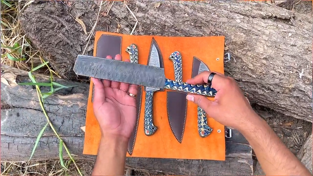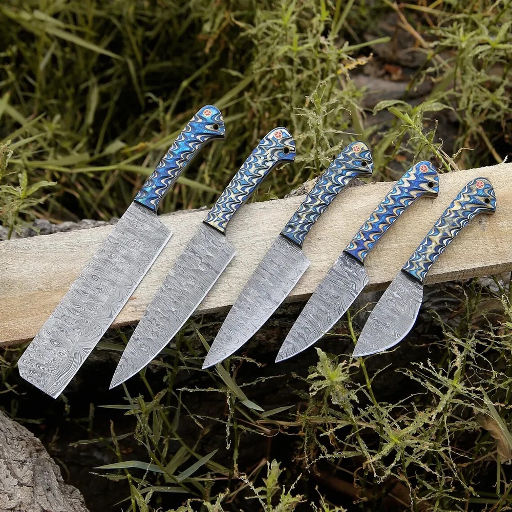 Handmade Damascus Steel 5 PCS Chef Knife set Professional Kitchen Knives Personalized Groomsman Anniversary Gift Housewarming Chef gifts Personalized Gift ,Customized Gift ,Boyfriend Gift ,Birthday Gift ,Gift for Men ,Father's day Gift ,Anniversary Gift ,Groomsman Gift ,Husband Gift ,Halloween Gift ,Thanksgiving Gift, Valentines day Gift ,Christmas Gift, Mother's Day Gift, Camping Knife Gift, EDC Knife Gift, Customized Gift, Folding Knife, Pocket Knife, Best Man Gift, Back Lock Knife Item Description Full Length : 12-11-10-9-8" Blade Length : 7-6-5-4-3" Handle Length : 5" Handle Material : Blue Multicolor Pakka wood Beautiful Handle file work on the spine Razor Sharp cutting Edge come with Leather roll kit ------------------------------------------------------------------------------------ BEST Folding/Pocket Gift for Boyfriend Men BAMSI Blades Authentic Damascus Straight Razor made of 100% Hand Forged Damascus Blade and is the result of hours of work, Composed of 1075, 15N20 high carbon steel . Comfortable Handle: All our Items are designed with detail attention to offer comfortable grip and control of hand, making it easier to hold and use. A masterpiece gift for your loved ones, to spread happiness and joy. We do not sell knives to anyone who is underage of 18 Years. ---------DISCLAIMER ----------- After receiving the item if you are not satisfied with the product and services please do not open a case and put -ve Review on the site . You must contact us we will try our best to solve your Problem ASAP. Thank you Customs & Import Duty Policy (Listing Note) Important Notice for US Customers: Our products are shipped from Pakistan. Please note that import duties, customs charges, or taxes may apply when your order arrives in the USA. These fees are not included in the product price or shipping cost and must be paid by the buyer directly to US Customs or the courier service. We do our best to minimize these charges by declaring accurate values. However, the final decision regarding duties and taxes is made by US Customs. Buyer Responsibility: By placing an order, you agree to pay any applicable import duties or taxes charged at the time of delivery. If you refuse to pay the customs duty and the parcel is returned to us, shipping costs and return fees will be deducted from your refund. If the parcel is abandoned due to unpaid duty, no refund will be issued. We highly recommend checking your country’s customs rules and charges before placing an order. Thank you for your understanding and cooperation!
