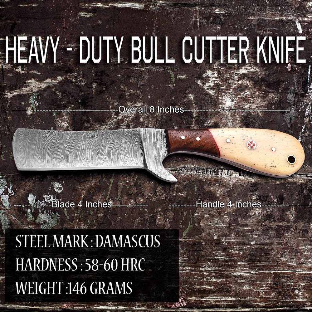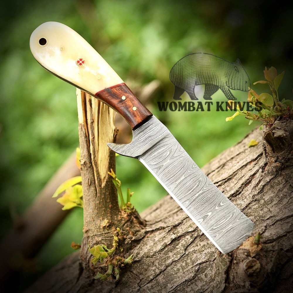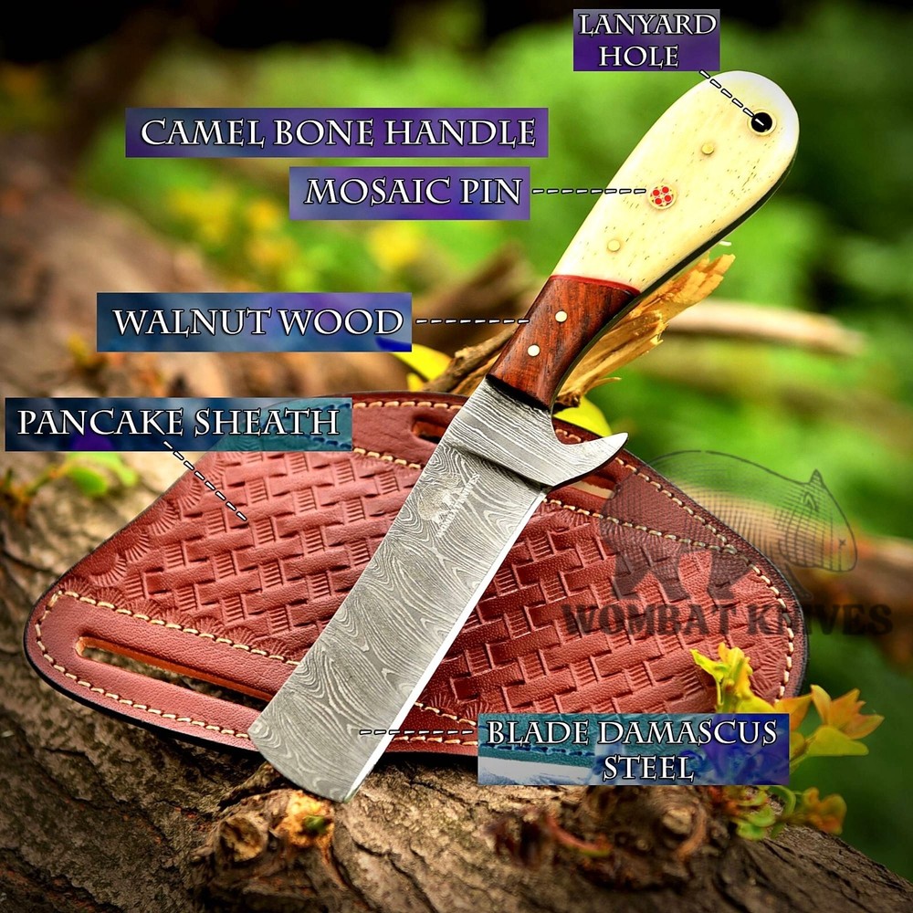 WOMBAT KNIVES Handmade Damascus Steel Cowboy Bull Cutter Knife with Leather Sheath, Fixed Blade Hunting Knife, EDC Skinning, Camping, Outdoor Utility knife Overall length: 8" Inches Handle length: 4" Inches Blade length: 4" Inches Material Used in handle: Camel Bone and walnut Wood Blade material: Damascus Steel Twist Pattern Leather Sheath: Pancake Cross Draw Leather sheath Comes With knife great and premium Quality Finishing. Multiples Purpose: The cowboy fixed blade knife is versatile, serving as both an everyday carry (EDC) knife and excelling in various outdoor activities. Its functionality extends to being an ideal bushcraft knife, camping companion, western cutlery tool, and lineman knife. With its sharp blade, it's well-suited for sporting events, fishing, wood chopping, and more. Ideal Gift: The Damascus Steel hunting knives for men are expertly designed to both serve and impress, making them excellent gifts for loved ones. The cowboy fixed blade knife, accompanied by a pancake leather sheath, is a perfect choice for special occasions such as weddings, Christmas, birthdays, Father’s Day, Brother’s Day, or Valentine’s Day.