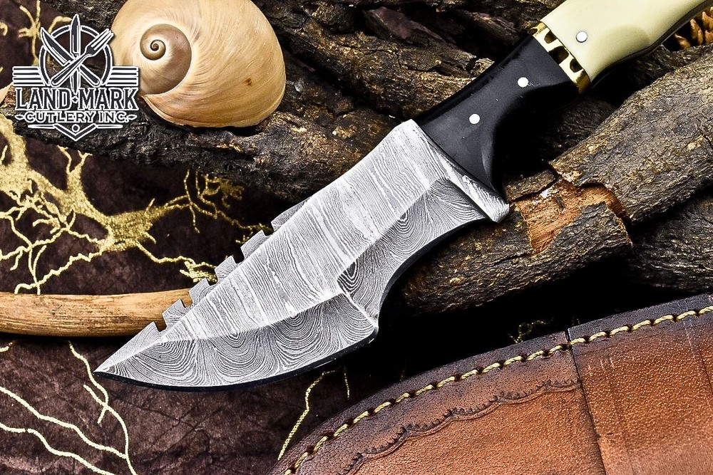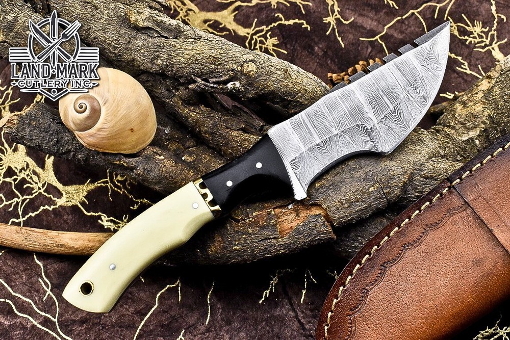 Custom Hand Made DAMASCUS STEEL HUNTING TRACKER KNIFE WITH MASLA SHEET AND BONE BOLSTER HANDLE We offer a shipping discount for More then one purchased . And discount will be apply on combine invoice, Discount will not apply on separate payment. ITEM DETAILS OVER ALL LENGTH 9.0 inches long (Approx) HANDLE LENGTH 4.5 inches long (Approx) BLADE LENGTH 4.5 inches long (Approx) BLADE HARDNESS 58-60 HRC Which Holds The Sharp Edge For Long Time. HANDLE BONE AND SHEET COVER LEATHER SHEATH This Awesome custom made KNIFE has a nice hand forged with the combination of 4340 & 1080 steel. HOW OUR DAMASCUS IS MADE: All our Damascus is real and not just an acid etch. Damascus is a mixture of 1080HC and 4340 nickel carbon. You heat them up together and then fold the bar over and over to get the desired layers, ours are 396 layers. Then you burn the blade in acid, and it turns the nickel satin color and the high carbon turns blackish gray. This is how the layers are exposed to show the layers of the new steel created coined "Damascus". All Damascus is acid etched to show the layers. If you high polish the metal it will be shinny satin like all steels. Only after you burn the sides of the blade with acid do you see the layers of the two steels. Makes sense? After we make our knives we high polish the handles and put an edge on the blade. The high polishing buffs off the acid burned layer of the handle, and the blade edge is sharpened and the acid burned edge becomes satin. You can re-burn the tang of the blade near the handles and the edge of the blade and it will show the layers once more. All our knives are hand made, durable and unique ***** YOU WILL RECEIVED THE SAME KNIFE Qality Standards Our Damascus blades are made from high quality non-stainless steels which rival or exceed any Damascus blade made from the 10 series with 4340. Our Damascus combination has taken years to perfect and has been tested under a variety of application which will offer professional performance in categories of toughness, strength (lateral stress) and edge honing and holding ability. In a 5 spot Rockwell test our blades will average near or close to 58 which offers a perfect balances between its toughness and strength.Our blades due to carbon content need to be regularly treated with wax and/or 3 in 1 oil to maintain its superior quality. Questions if you have any question feel free to send us message we aim to answer all questions within 24 hours Feedback If you are not satisfied with our service please contact us before leaving any negative or natural feedback. We will resolve all issues as quickly as possible. Disclaimer We are not responsible for any injuries associated with the use of our tools. Our products are intended for legal use only by responsible buyers. Therefore, we will not sell our products to anyone under the age of 18. Before bidding please check your country laws as some countries Custom don't allow this. If your purchase is held by Custom Authorities in your country/State we will not be responsible for that and no refund will be issued Shipping We offer a 20% shipping discount for More then one purchased . And discount will be apply on combine invoice, Discount will not apply on separate payment We ship within 24 hours after receiving complete payment but this can be delayed due to week ends or Governments and Religious Festivals . . This is beyond our control and we apologize for this inconvenience. Precautions Our Tools are very sharp so open and use them very carefully We are not responsible for any injuries associated with the use of our tools Tips to Care knife 1. NEVER STORE YOUR KNIFE FOR LONG TIME IN LEATHER SHEATH. 2. LEATHER CAN ABSORB WATER, WHICH WILL RUST THE KNIFE. 3. ALWAYS CLEAN THE BLADE AFTER USING WITH OIL OR WAX