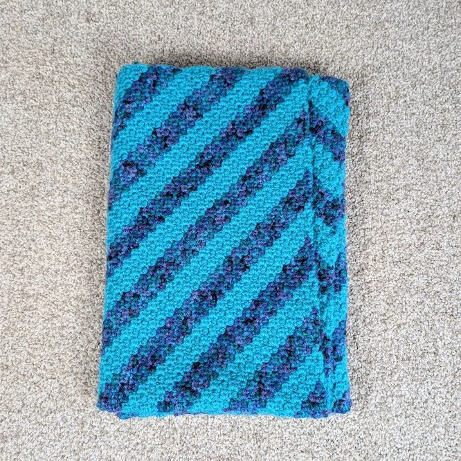 Striped Baby Blanket - Blue/Turquoise Snuggle up your baby with this beautiful handmade blanket. Perfect for the stroller or car seat, or lay on the ground for some much needed tummy time. The bright colors are great for brain development and the soft yarn feels great against baby's delicate skin. This blanket measures 36" x 36". Made with love in a Smoke Free/Cat Friendly Home. Cats are not allowed to play with yarn Keywords: knit throw, striped blanket, turquoise throw, navy blue blanket, diagonal stripe throw, handmade blanket, knitted throw blanket, square throw, textured blanket, home decor, cozy throw, baby blanket, baby throw, stroller blanket, crib blanket, tummy time blanket