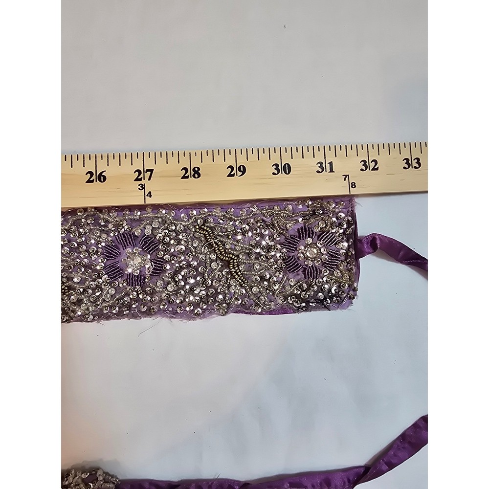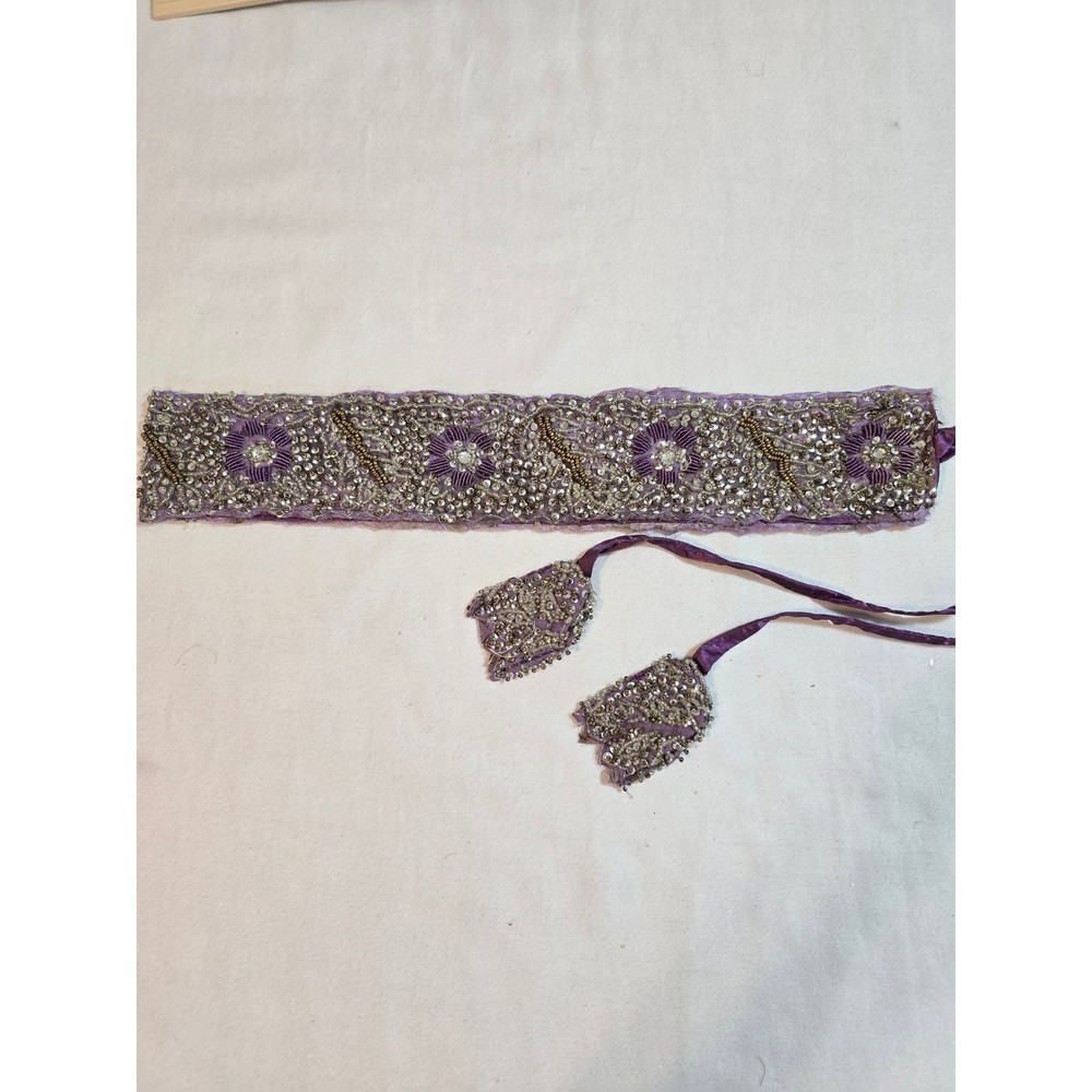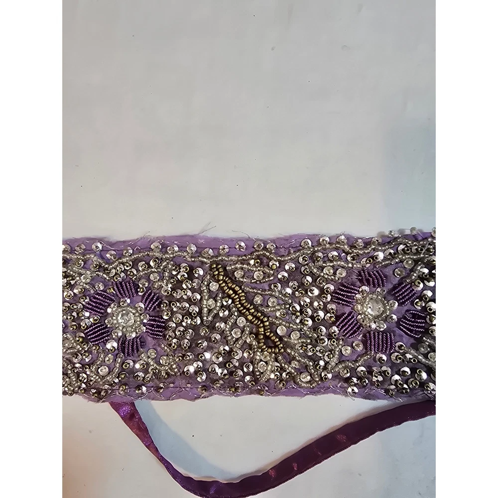 A stunning purple fabric sash belt adorned with intricate beadwork and sequin floral designs. This eye-catching accessory features delicate beading in silver and gold tones, creating a rich, textured finish. The ties allow for versatile styling, making it perfect for adding a touch of glamour to any outfit. Elevate your look for weddings, parties, or cultural events. Handmade items may have flaws, please look at pics closely. Measurements: • Beaded Section Length: 31.5 in • Beaded Section Width: 2.5 in • Tie Length (each side): 14 in Material: Beads, Metallic Fiber Style: Waist Belt Theme: Gypsy Accents: Beaded, Sequin, Tasseled, Embroidered Type: Belt Department: Women Pattern: Floral Features: Adjustable Keywords: beaded belt, embellished sash, purple accessory, waist tie, sequin belt, floral design, statement accessory, evening wear, bridal accessory, festival wear, couture belt, ethnic accessory Smoke free home Ships next business day