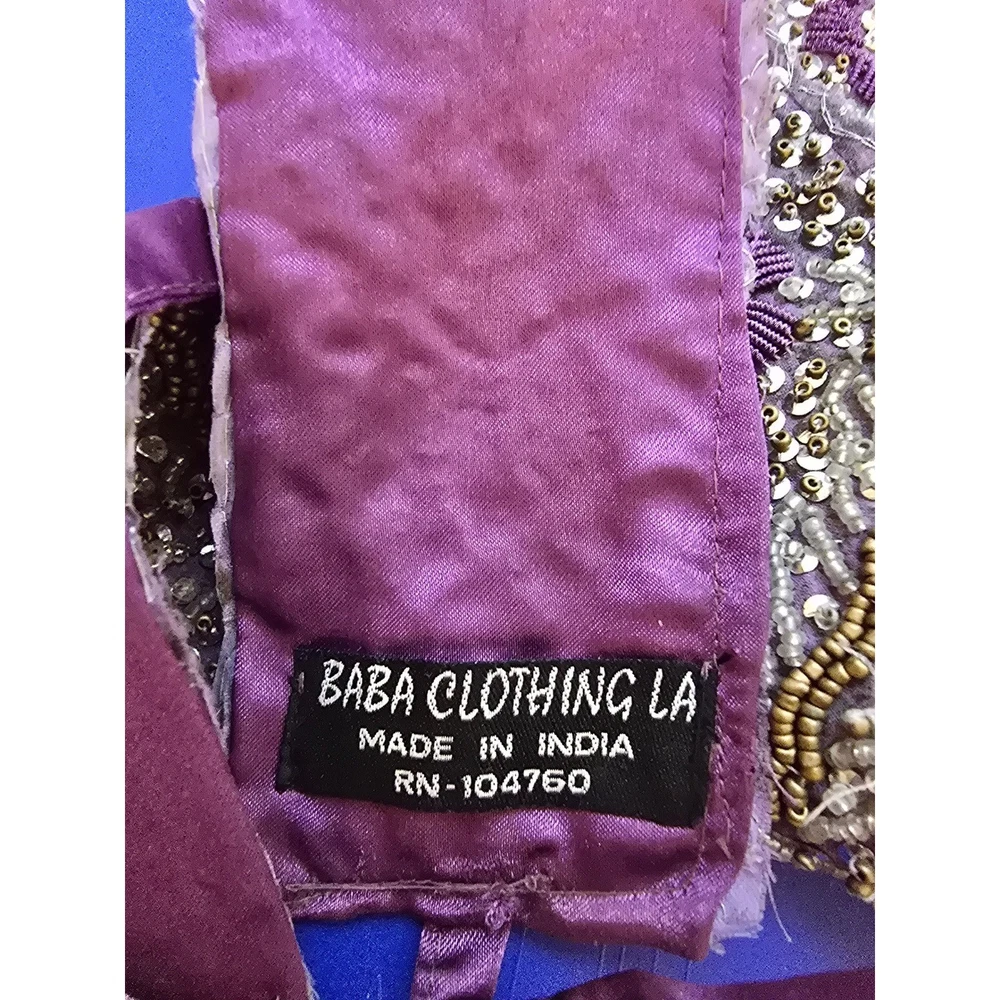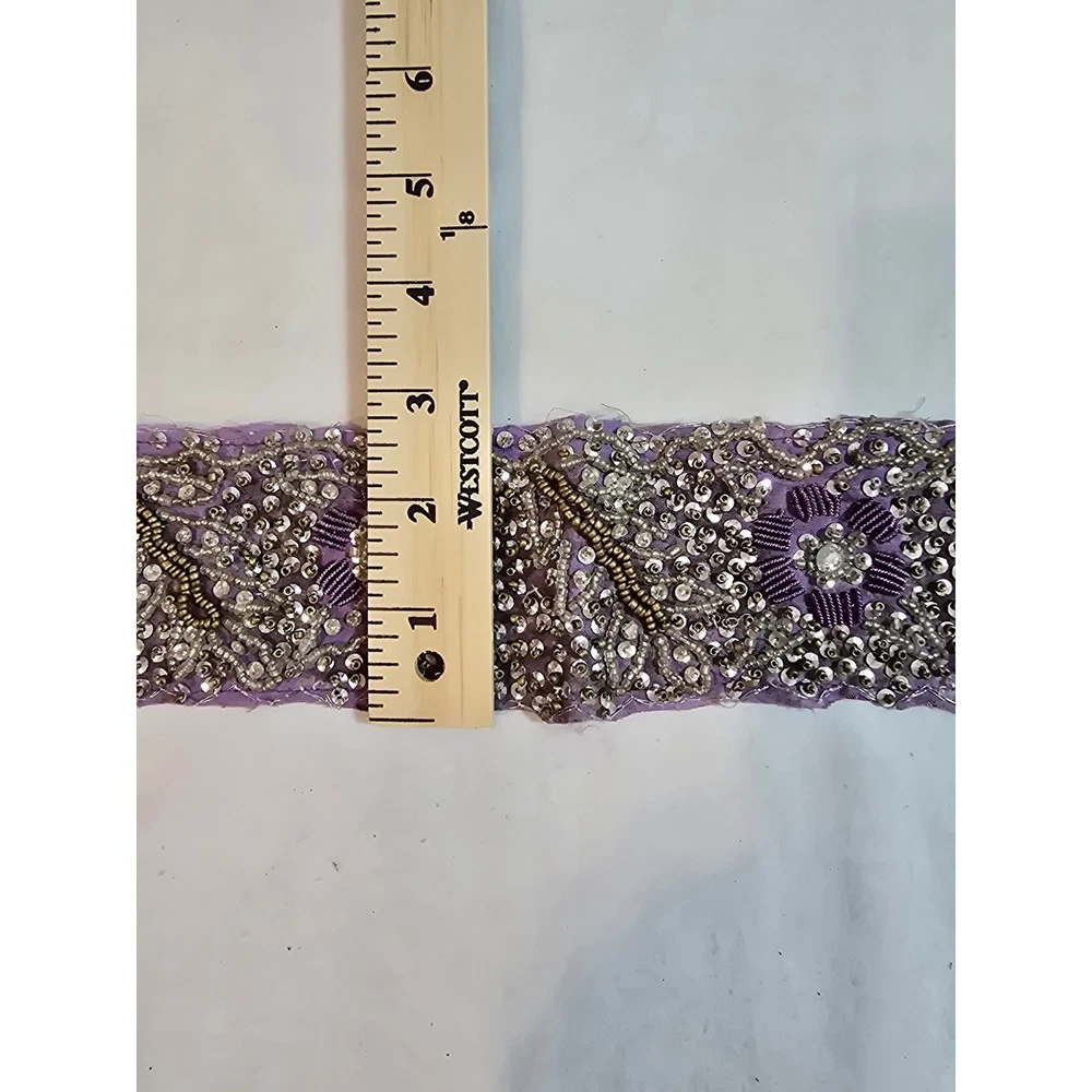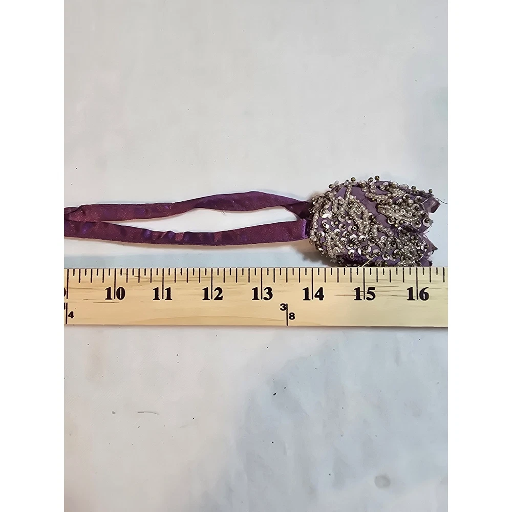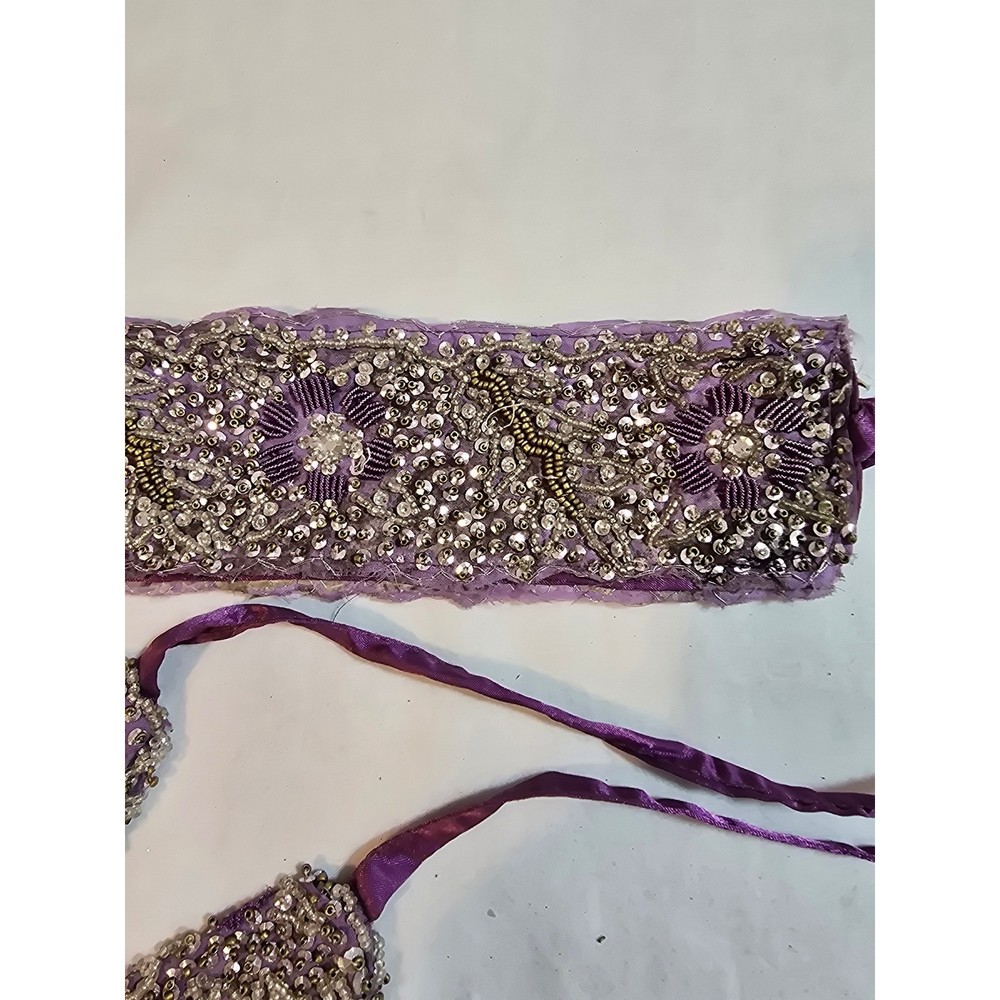 A stunning purple fabric sash belt adorned with intricate beadwork and sequin floral designs. This eye-catching accessory features delicate beading in silver and gold tones, creating a rich, textured finish. The ties allow for versatile styling, making it perfect for adding a touch of glamour to any outfit. Elevate your look for weddings, parties, or cultural events. Handmade items may have flaws, please look at pics closely. Measurements: • Beaded Section Length: 31.5 in • Beaded Section Width: 2.5 in • Tie Length (each side): 14 in Material: Beads, Metallic Fiber Style: Waist Belt Theme: Gypsy Accents: Beaded, Sequin, Tasseled, Embroidered Type: Belt Department: Women Pattern: Floral Features: Adjustable Keywords: beaded belt, embellished sash, purple accessory, waist tie, sequin belt, floral design, statement accessory, evening wear, bridal accessory, festival wear, couture belt, ethnic accessory Smoke free home Ships next business day