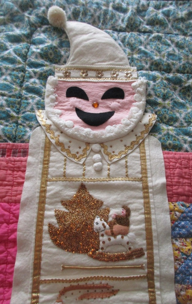 Christmas Card Wall Hanging Handmade - Felt with gold rick rack, sequins & gold beads - A ton of work went into the bead & sequin work on this piece The gold Christmas tree is made of star sequins & small round beads Age unknown - Measures 50" long by 11" wide There are 4 Card pockets which are under the Gold Tree, Train, Candle & Angel There may be a few sequins missing & a few tiny dingy spots in the white felt but overall it is in excellent condition
