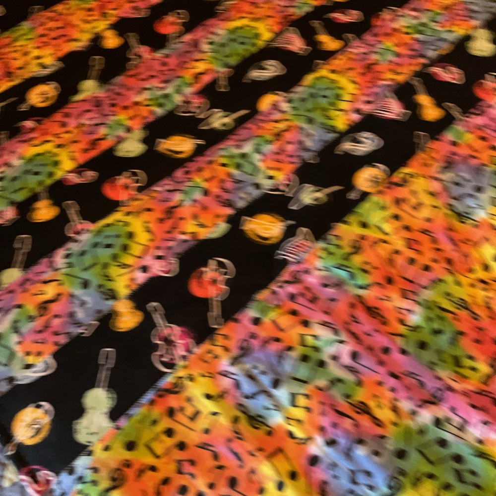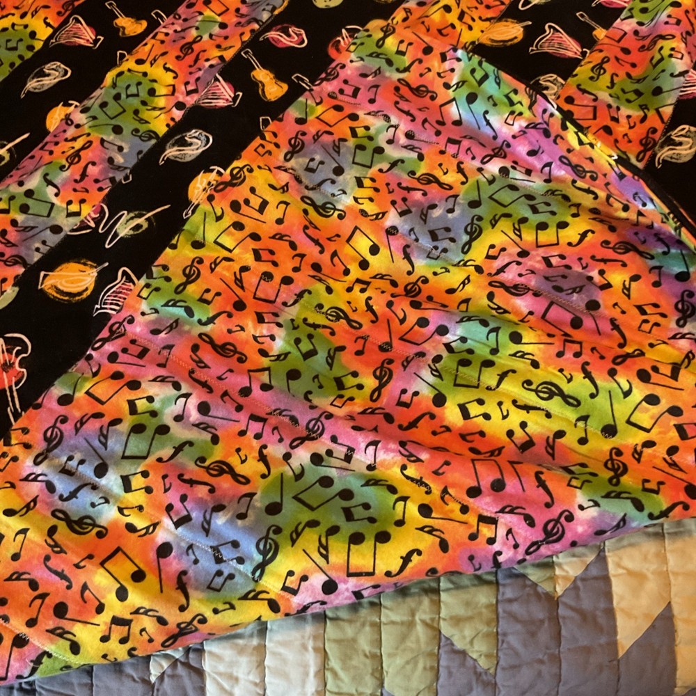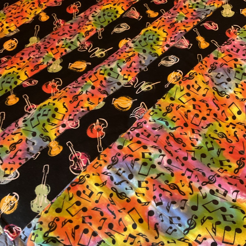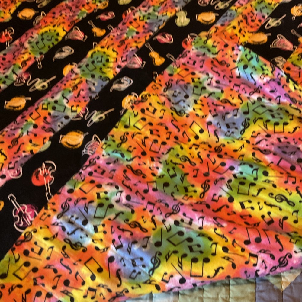 This product is a handmade flannel lap quilt measuring 40x60 inches, featuring a novelty music-themed design in vibrant multicolor. Created in the United States, the quilt is made from cozy flannel material and utilizes a strip technique for its construction. Perfect for music lovers or those who appreciate unique and handmade crafts, this quilt is a cozy and decorative addition to any home or crafting collection.