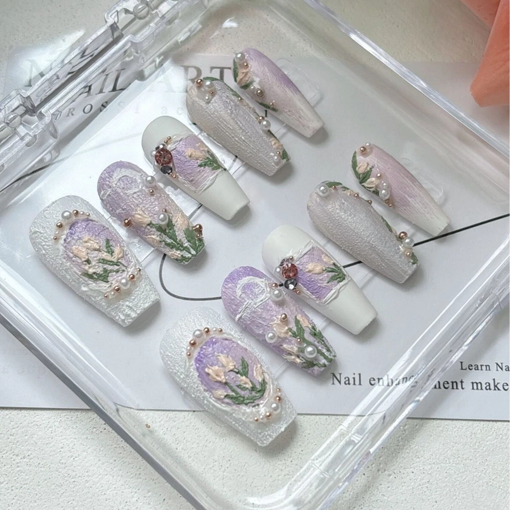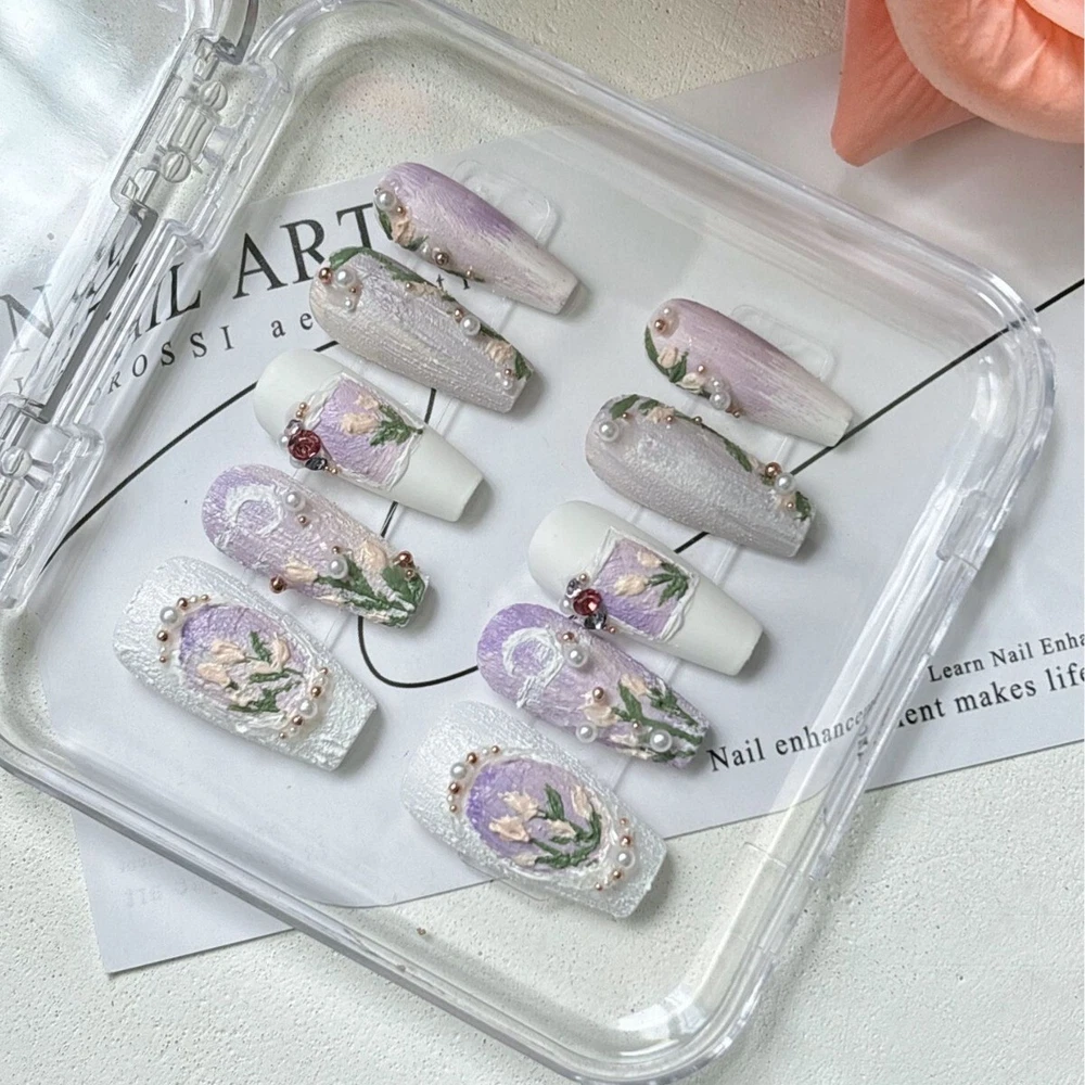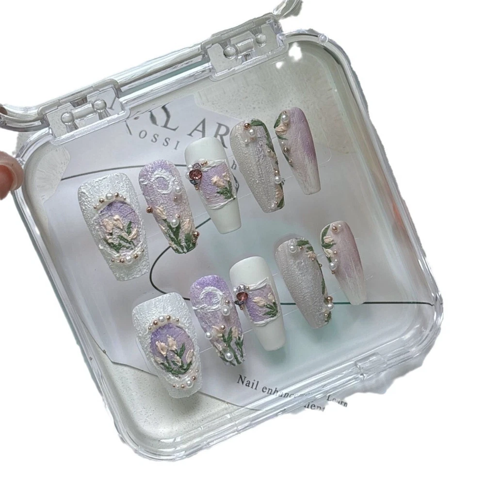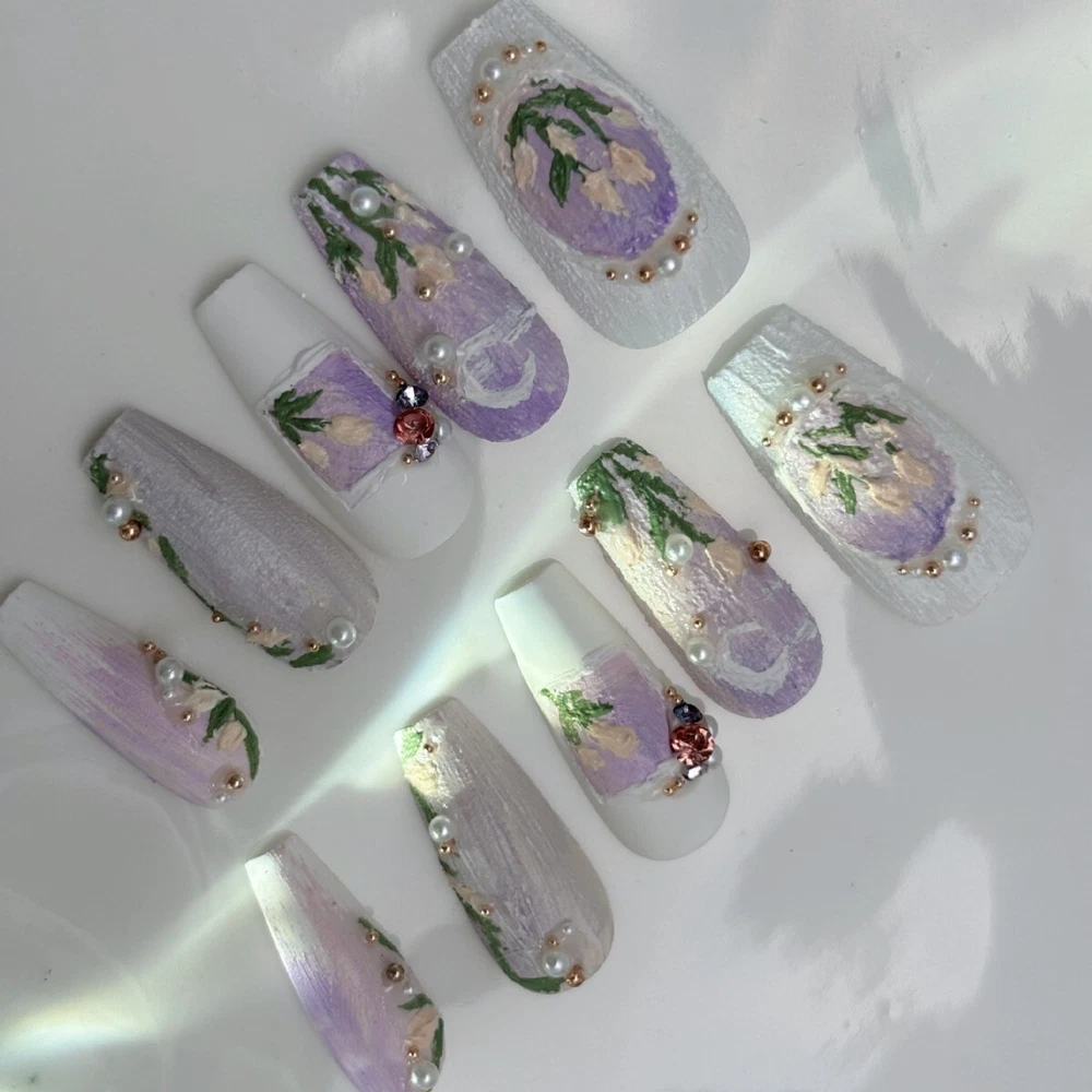 Each set is handmade according to size.Please understand some orders will take longer to ship out.Thanks for support and patience! Please under feel free to contact me with any questions,comments,or concerns!! Handmade Press on Nails Application Steps: (1)Start by preparing your nails: remove any old polish remove any dead skin away from cuticle area to ensure that your nail has a bigger area for the sticker to properly fit for better adherence when nail is applied. (2) Gently file the top surface of you nail to remove any residue prior to applying the Press on Nails. (3) Be sure your nail surface is clean and dry. (4) Select the suitable size of adhesive sticker for your fingernail before you place the sticker (5) Gently remove the top protective layer on the adhesive sticker and place on the press on nail (6) Align the press on nail with your natural nail starting at the cuticle and pressing down towards the tip of your natural nail please remember to hold press on nail for a minimum of 30 seconds to ensure there is no air space between press on and natural nail. Lastly, Enjoy Your Beautiful Nails!!! Handmade Press on Nail Removal Steps: Immerse hand in warm soapy water for a minimum of 2 minutes this will assist in removing the glue sticker while maintaining the condition of the press on nail for re-use. Notes on Handmade Production: Since it is 100% hand customized, especially some complex patterns, there is no way to be the same as the pictures shown. We hope you can understand, thank you for your support, and we will continue to work hard! We have been striving to provide products that satisfy our customers!!!
