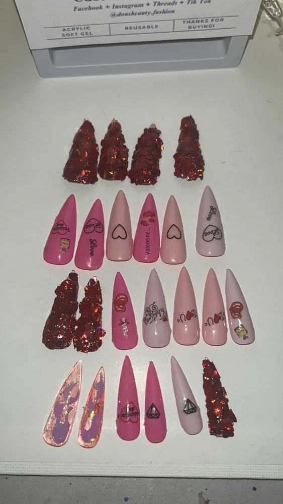 Super cute for the day of love. We're obsessed with this VDay set! This set was handmade and designed by yours truly. Nails are stilleto shaped with various kisses, diamonds and Valentines Day wording . Each set comes with glue, a cuticle stick, and an Emory board. This set has 23 nails! The sizes in this set are as follows: Size 0: 4 nails Size 1: 5 nails Size 4: 5 nails Size 6: 5 nails Size 8: 4 nails =23 nails ATTENTION: Nails are made with poly gel. These nails are highly flammable. Please advise and avoid purchasing if you have a known allergy to poly gel and the chemicals in most nail polishes.