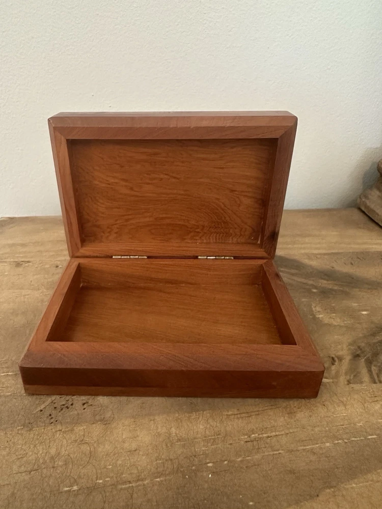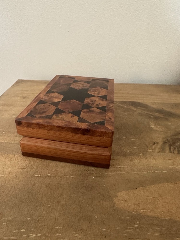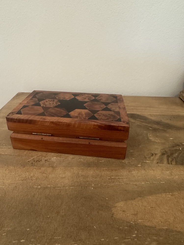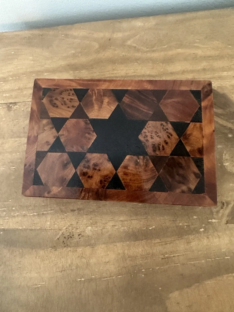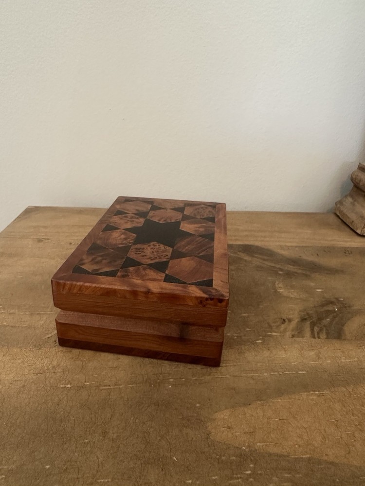 This beautiful trinket box is perfect for storing your small items in style. Made from high-quality wood, it features intricate carvings and a hinged lid. The box is handmade in Morocco and measures 5 inches in length and 1.5 inches in height, making it compact and perfect for any room, whether it's your bedroom, closet, shop, or workshop. The box's pattern is wood grain, and it comes in a beautiful brown color that will complement any decor. It's perfect for all occasions and features a collection of keepsake boxes. The box is also ideal for storing your collectibles, jars, and tins. Get this handmade trinket box today and add a touch of elegance to your space. Discoloring on bottom of box