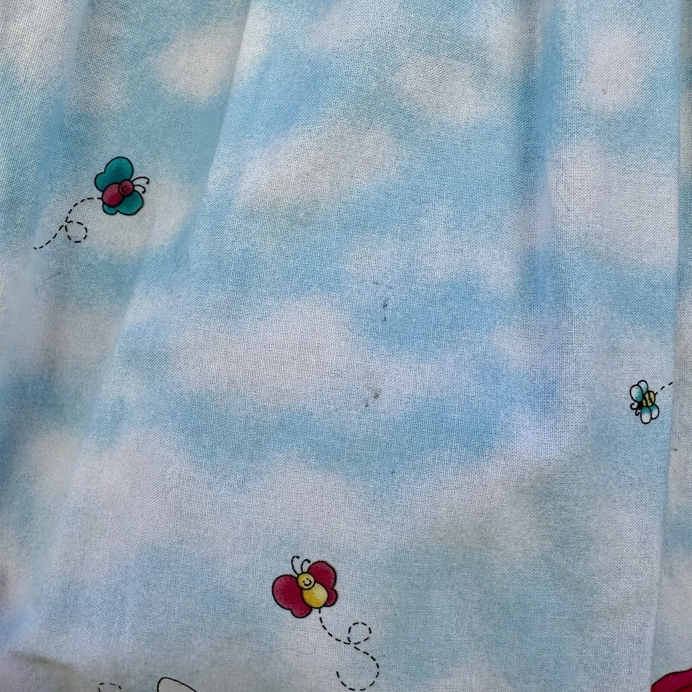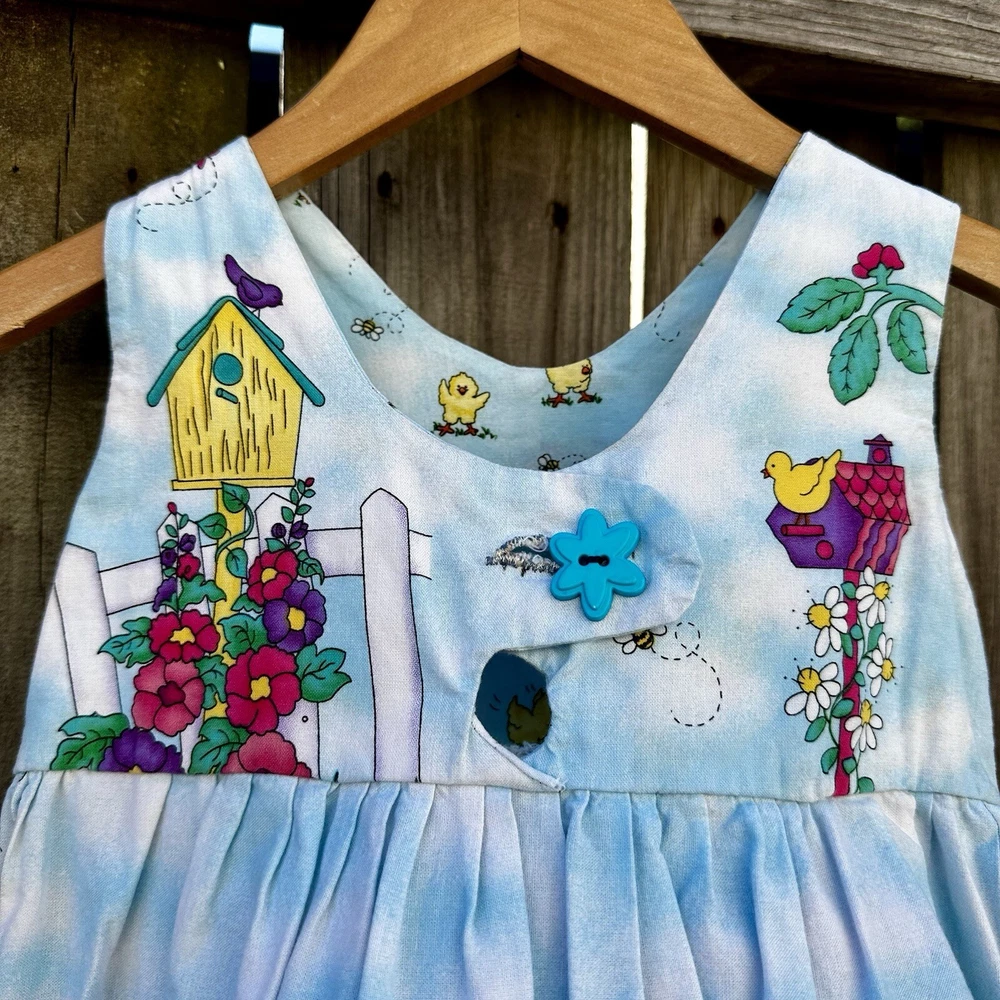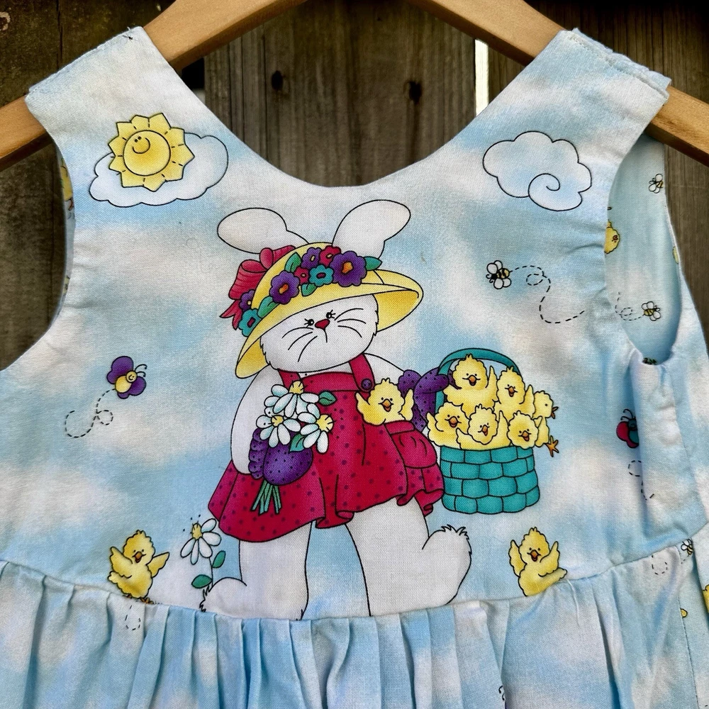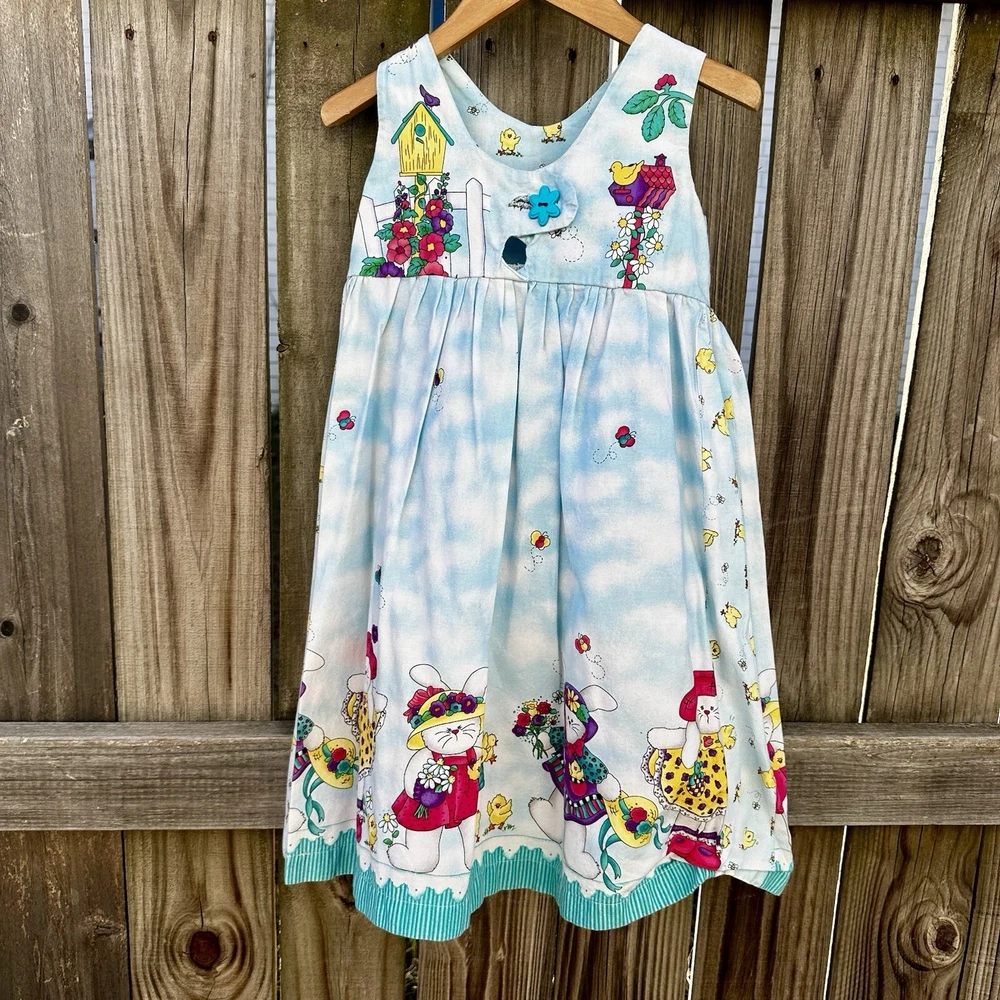 Handmade Girls Easter Spring Bunnies & Flowers Sleeveless Jumper Dress Sz 6-8 Excellent condition with small stain flaw as pictured Have not stain treated No tags Fits approx girls size 6-8 Please see measurements for proper fit Chest: 24” Waist: 24” Length: 27”