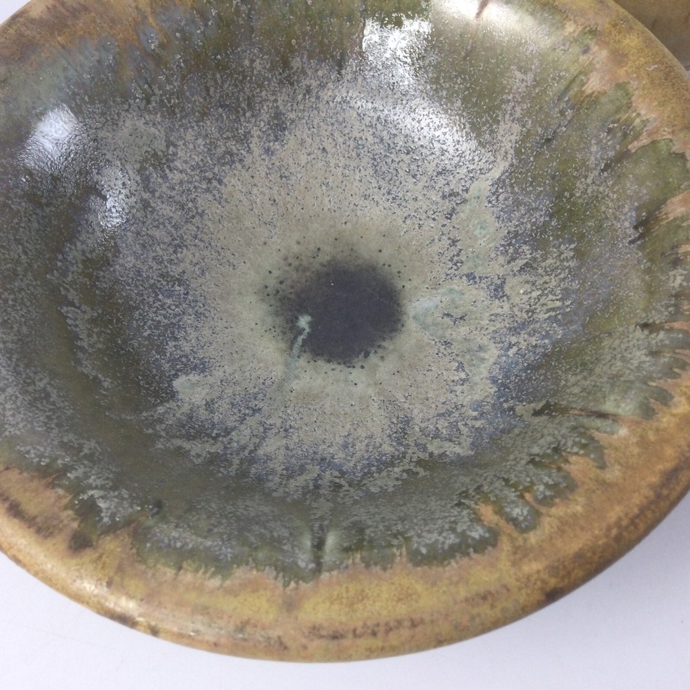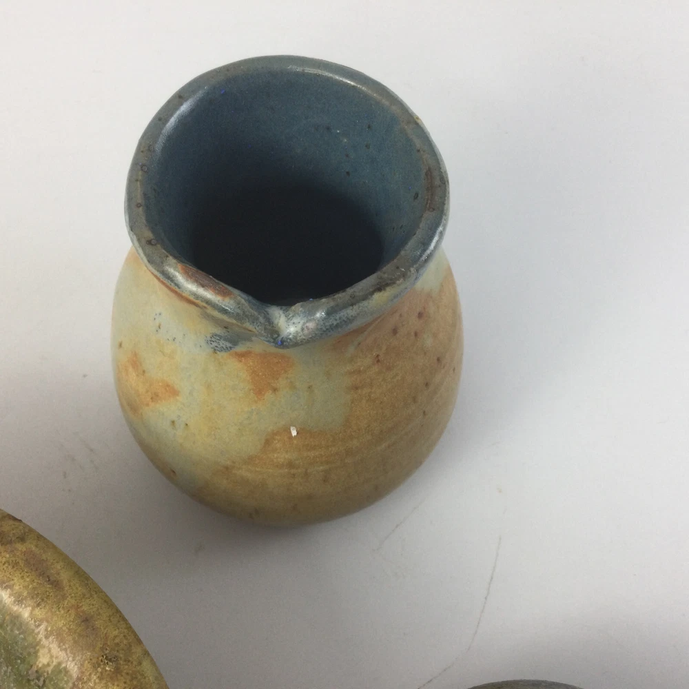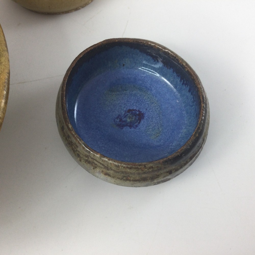 Art Pottery Stoneware Mini Vase and 2 Bowls Set of 3 Handmade Glazed. Very good condition, no chips or cracks. Vase is 3" H Larger Bowl is 6.5" W x 2" H Small Container is 3" W
