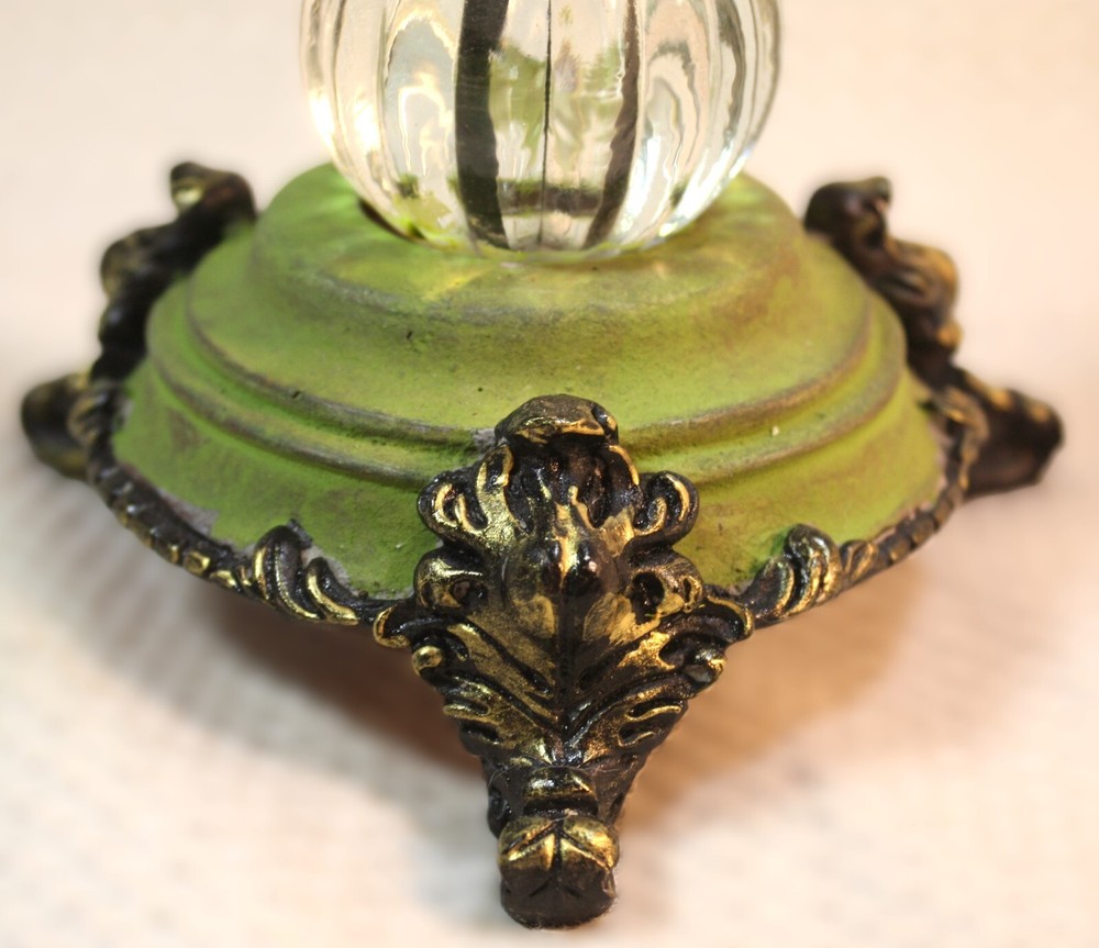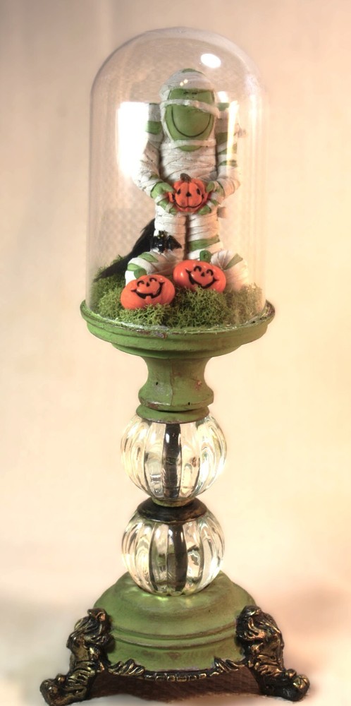 This handmade Halloween cloche on a pedestal features a cute Frankenstein monster mummy with several smiling pumpkins, perfect for adding a festive touch to your home decor. The figurine stands at 12.5 inches tall, with a creepy style and clear glass finish that adds to its appeal. The green color and detailed design make it a unique and eye-catching piece for celebrating Halloween in style.