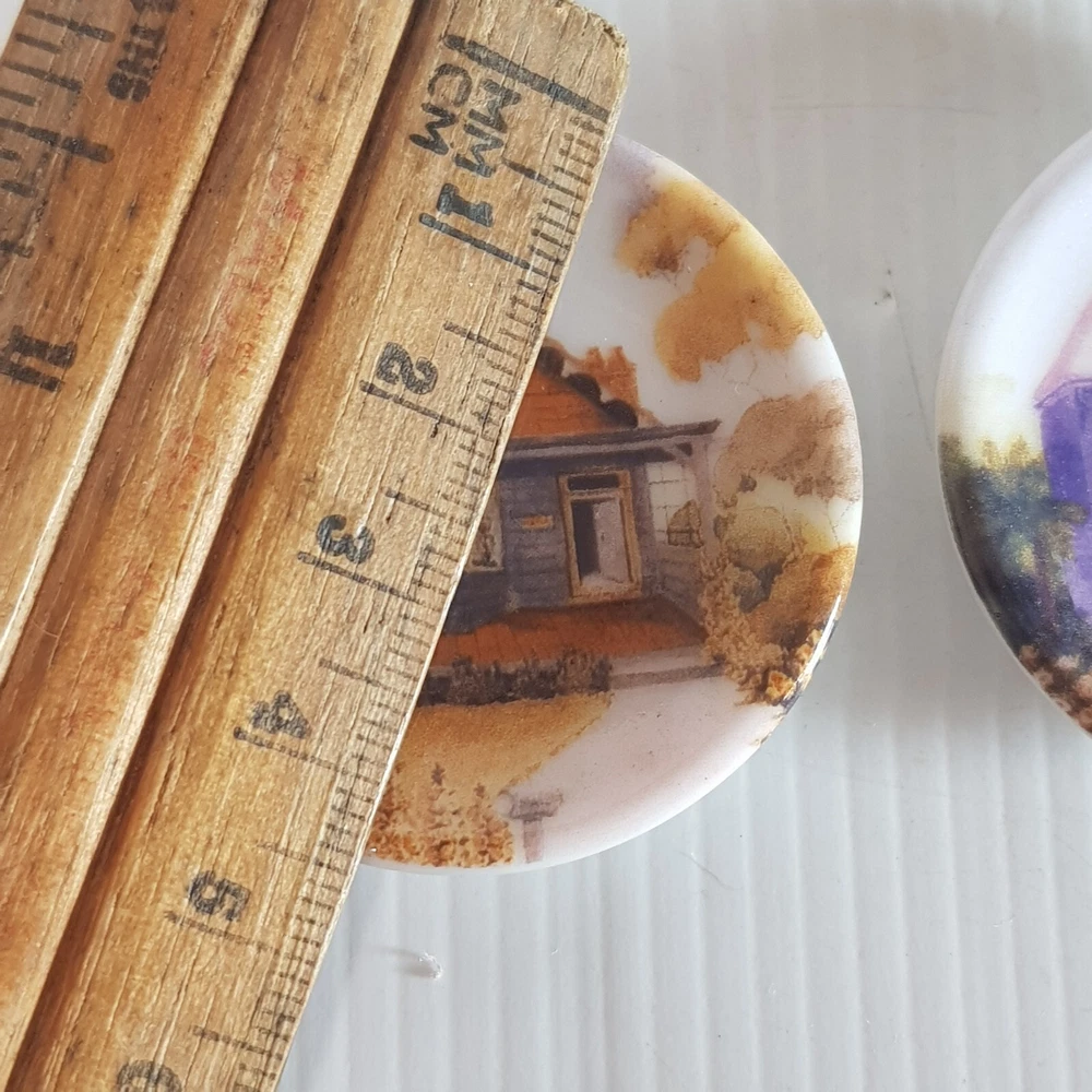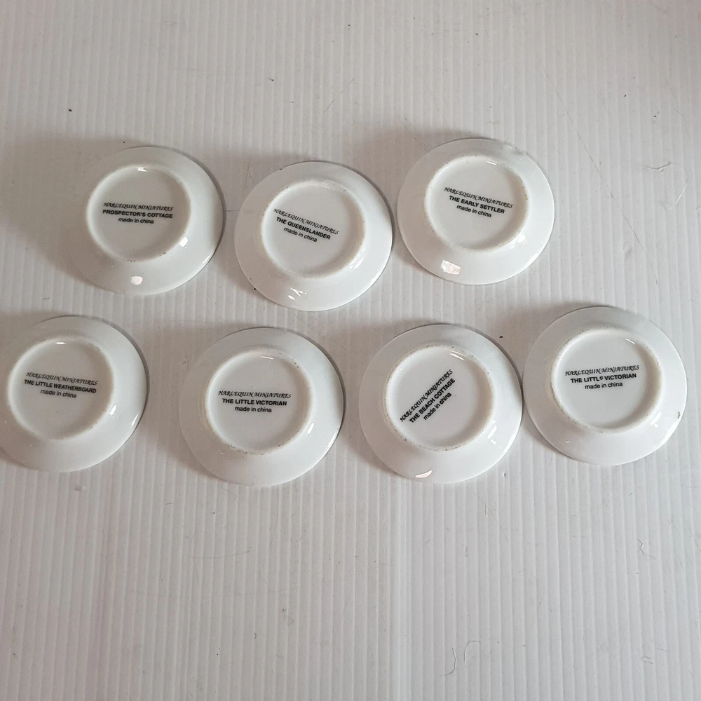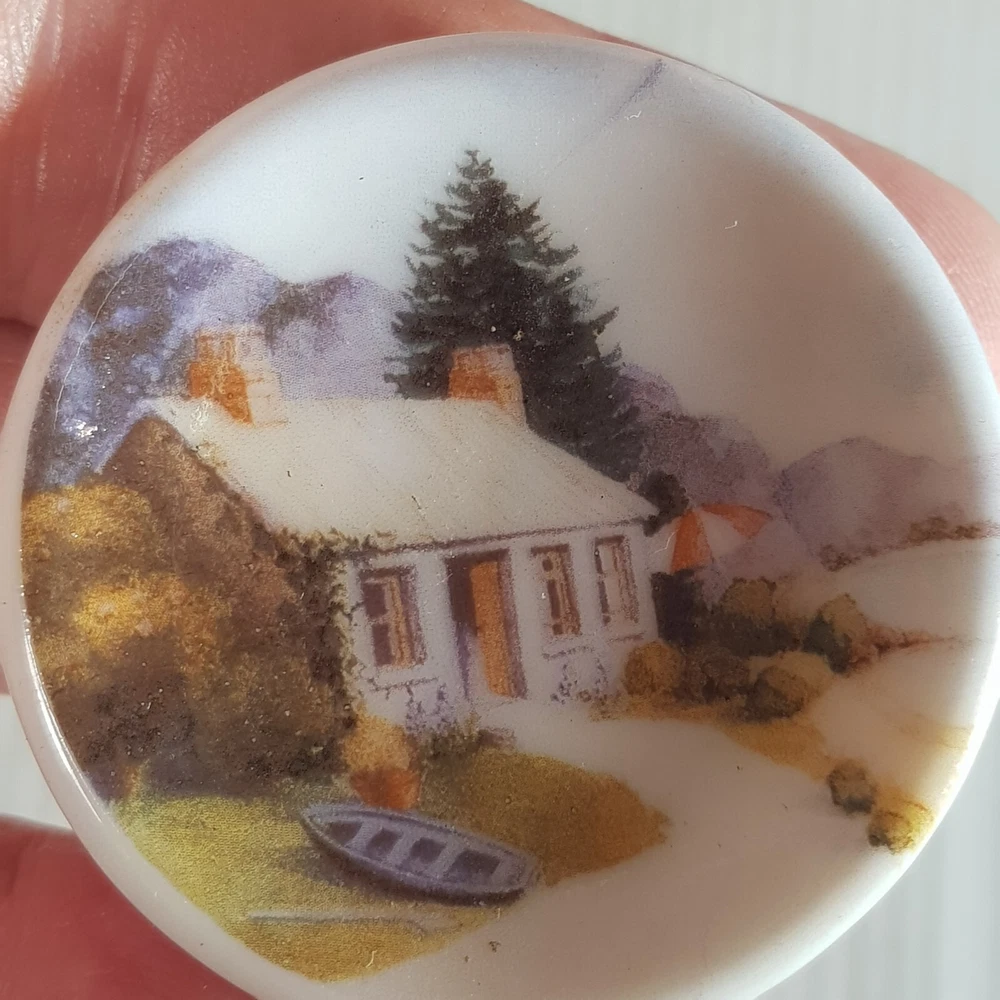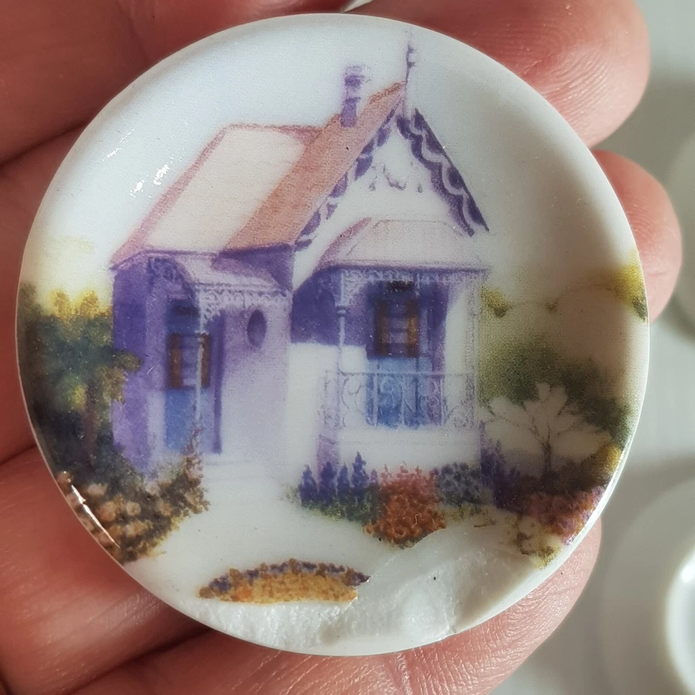 Add a touch of charm to your dollhouse kitchen with this set of 7 handmade ceramic plates from the Harlequin collection. Each plate features a unique design, including vintage house art, and landscape themes. Made of porcelain and measuring 4.5cm in length and width, these miniature plates are perfect for a 1:12 scale dollhouse. Ideal for collectors aged 12 and up, these vintage-inspired pieces bring a touch of farm life to your doll's house décor.