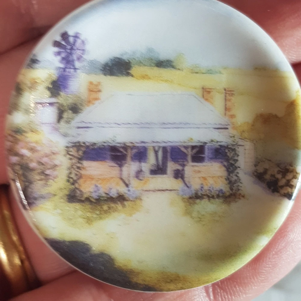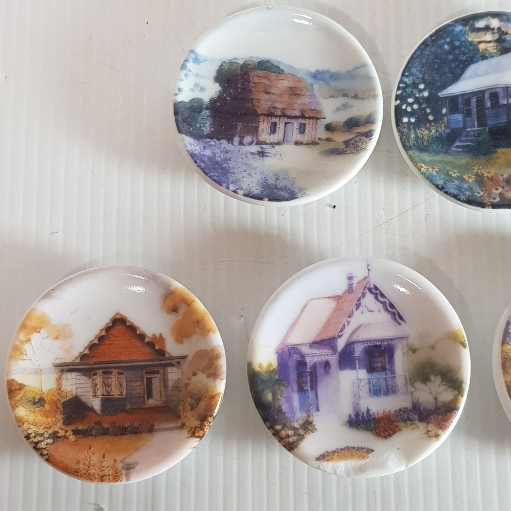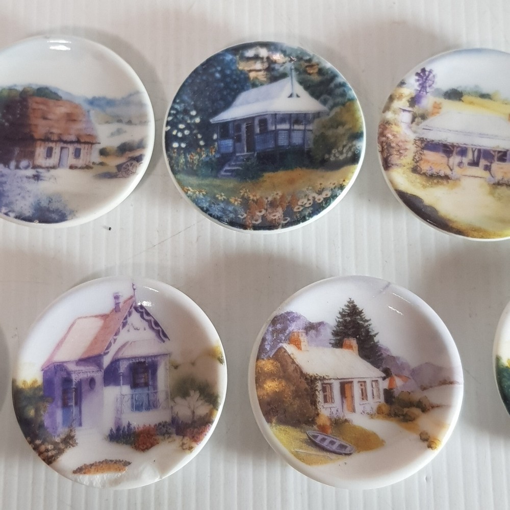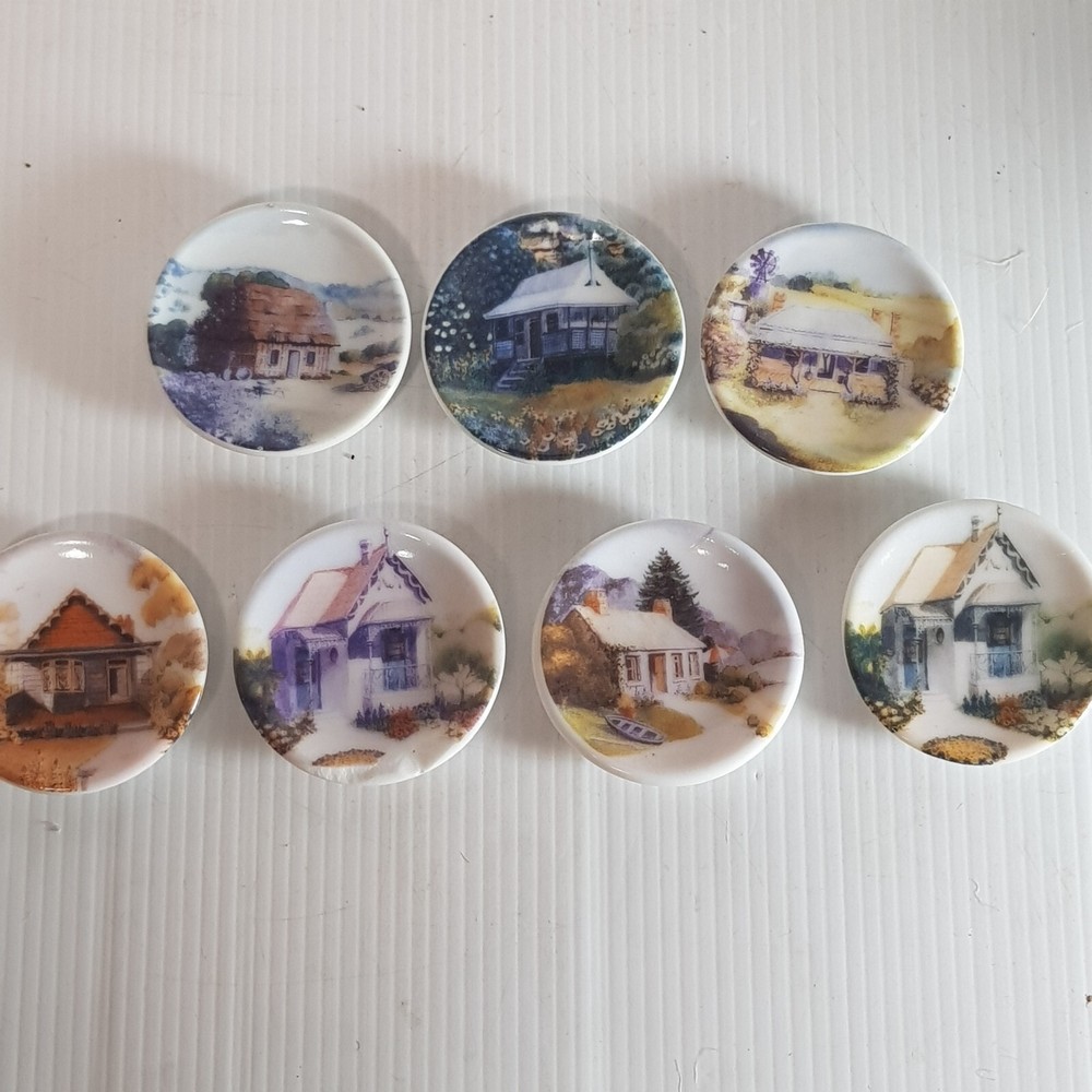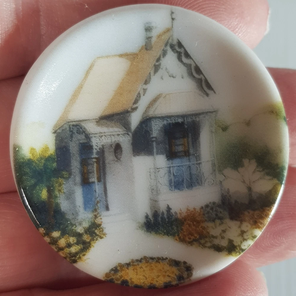 Add a touch of charm to your dollhouse kitchen with this set of 7 handmade ceramic plates from the Harlequin collection. Each plate features a unique design, including vintage house art, and landscape themes. Made of porcelain and measuring 4.5cm in length and width, these miniature plates are perfect for a 1:12 scale dollhouse. Ideal for collectors aged 12 and up, these vintage-inspired pieces bring a touch of farm life to your doll's house décor.