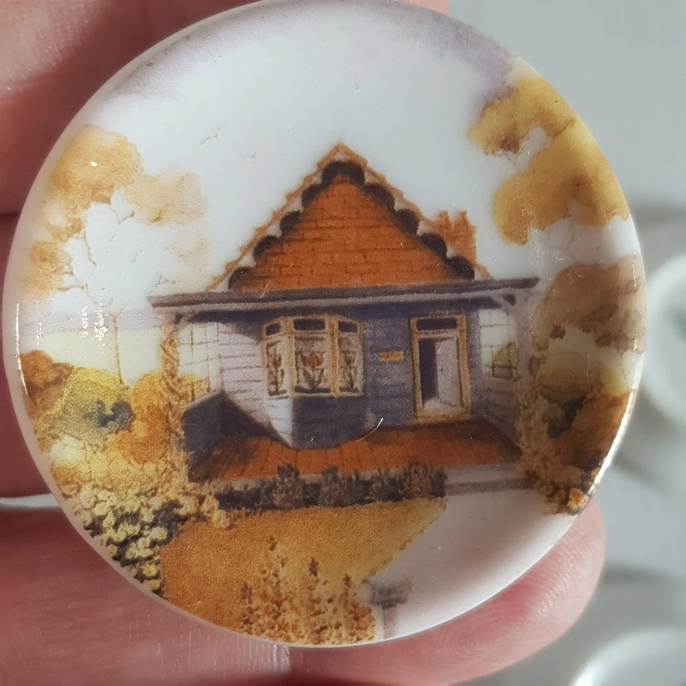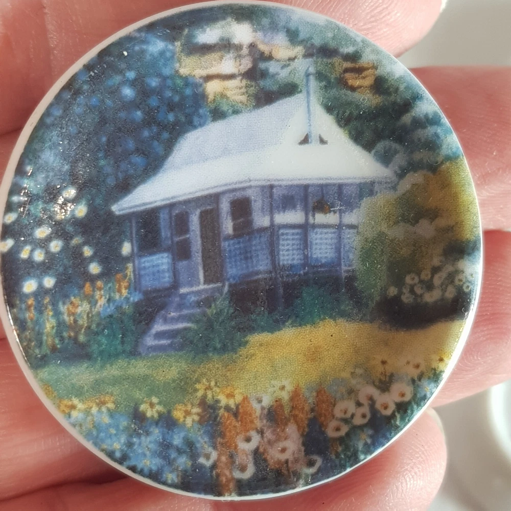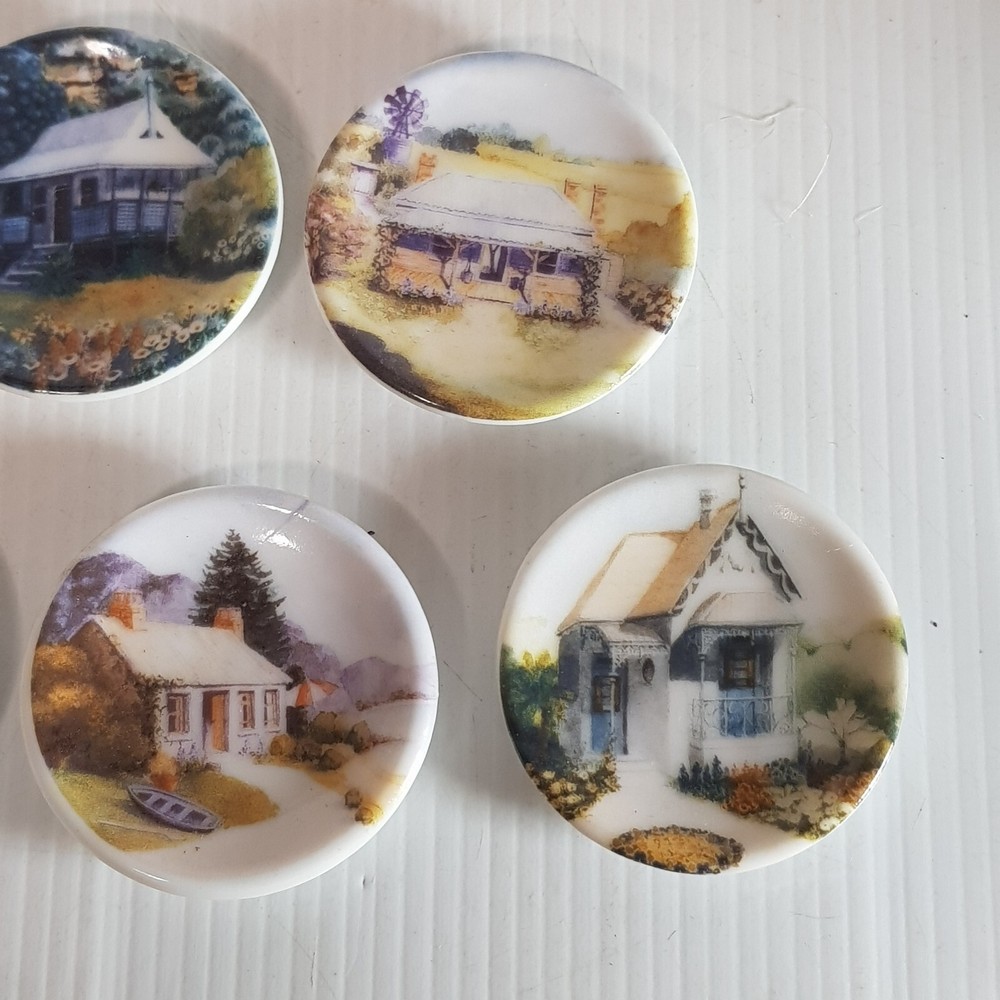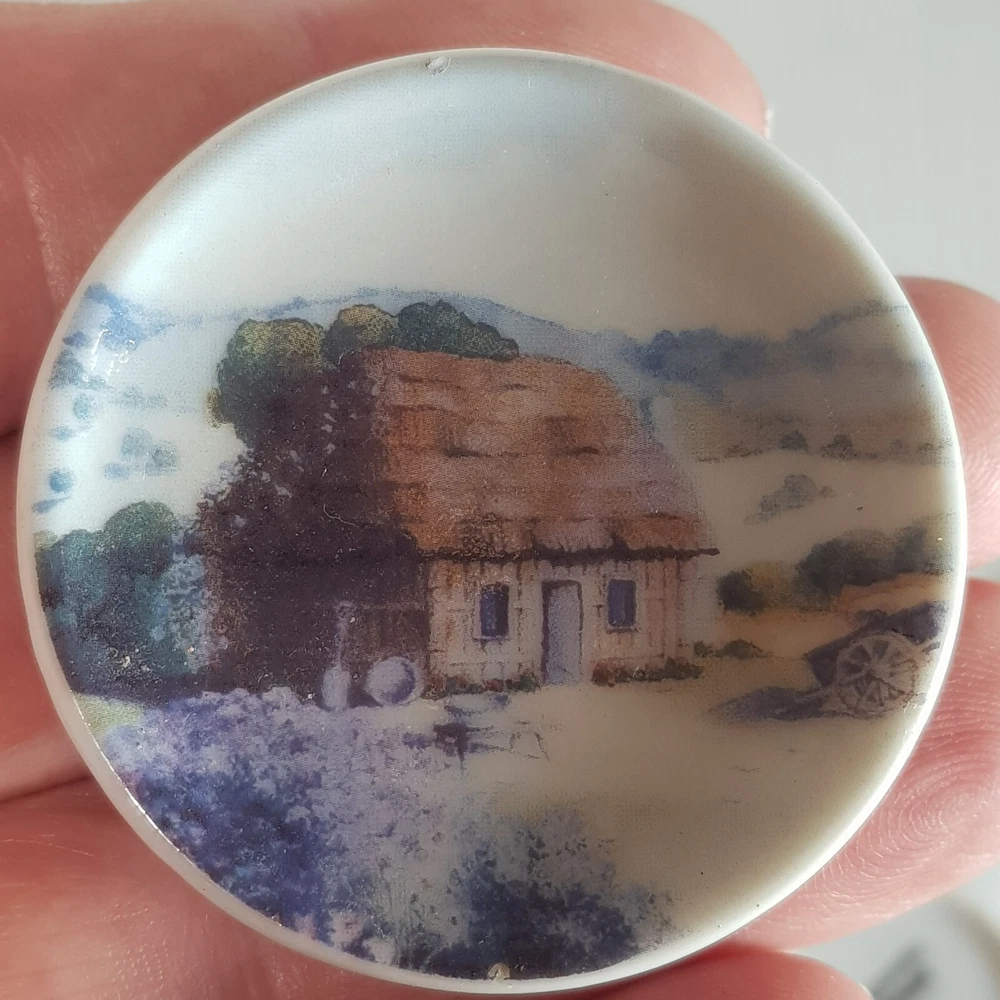 Add a touch of charm to your dollhouse kitchen with this set of 7 handmade ceramic plates from the Harlequin collection. Each plate features a unique design, including vintage house art, and landscape themes. Made of porcelain and measuring 4.5cm in length and width, these miniature plates are perfect for a 1:12 scale dollhouse. Ideal for collectors aged 12 and up, these vintage-inspired pieces bring a touch of farm life to your doll's house décor.