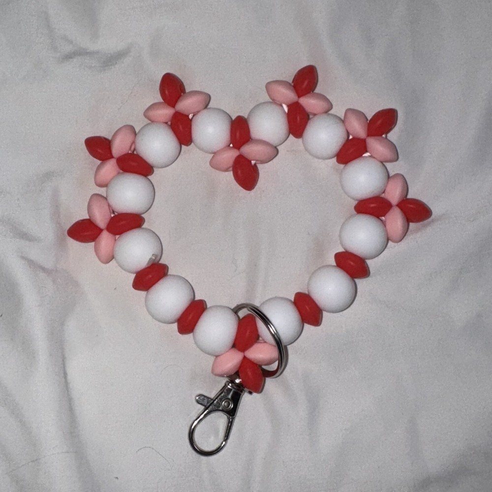 Celebrate Valentine's Day in style with this charming wristlet keychain! add your own wallet!house keys!car keys!etc! each wristlet is handmade to order by me * Unique Shape: This wristlet keychain features a unique design that stands out, making it a perfect accessory for any outfit. * Handmade and Made for a Purpose: Each keychain is handmade, ensuring a unique and personal touch that adds a special element to your collection. Colors on wristlet vary Add a touch of charm to your everyday essentials with this delightful Valentine's Day wristlet keychain! Thank you for supporting my small business