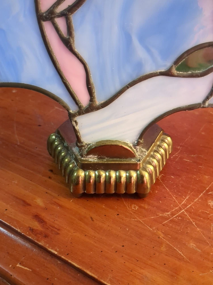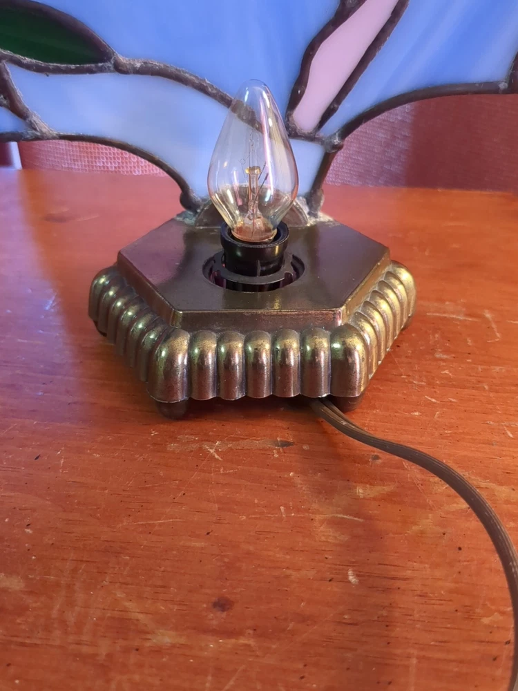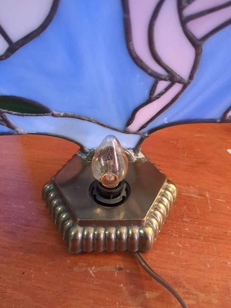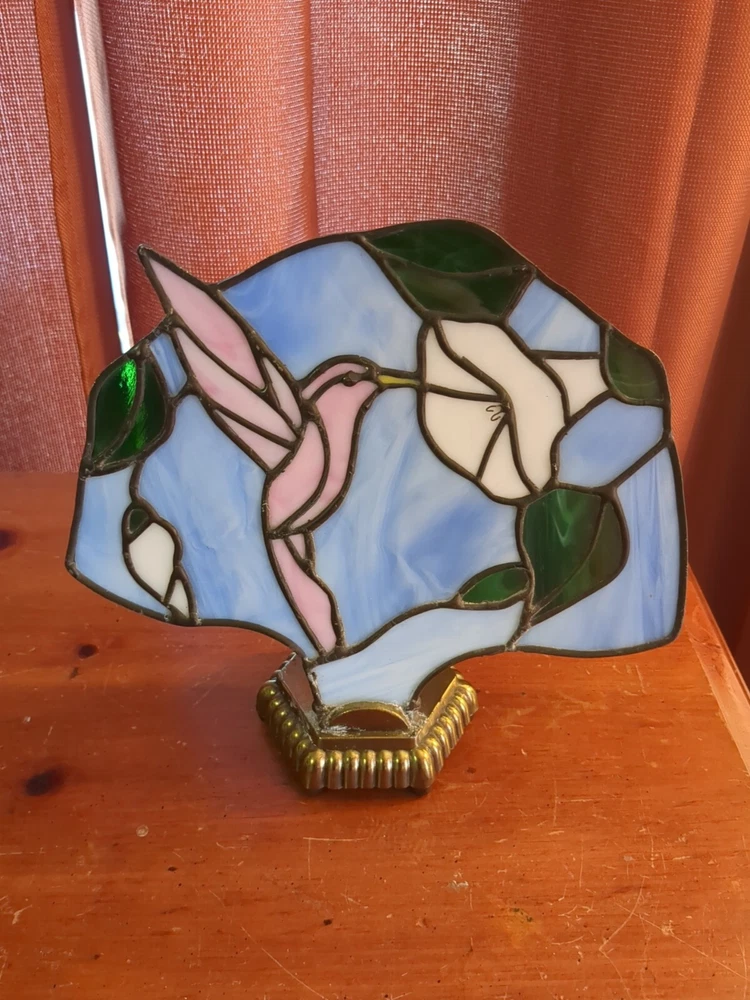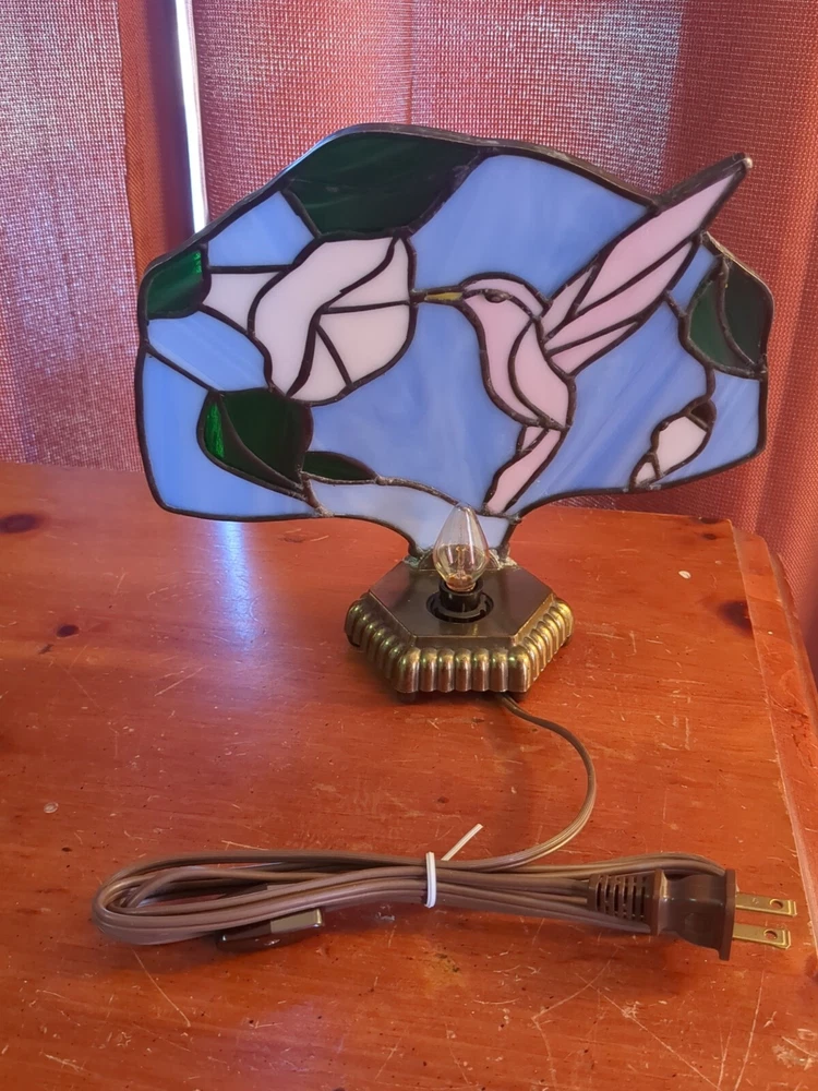TESTED AND WORKS 10 INCHES TALL 10 INCHES WIDE NO CHIPS NO CRACKS IN STAINED GLASS 6 FOOT CORD HEAVY BRASS BASE SHIPPED WITH CARE The Handmade Hummingbird Stained Glass Light Lamp features a charming hummingbird pattern on stained glass, set on a brass base. This vintage/retro style table lamp is corded for power and uses a light sensor for operation. Perfect for adding a unique touch to your home decor.