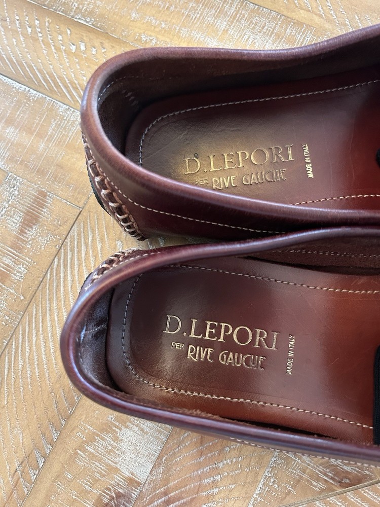 Step up your style with these handcrafted D. Lepori per Rive Gauche penny loafers, made in Italy from high-quality leather. These rich brown drivers feature detailed moc-toe stitching, cushioned leather insoles, and rubber outsoles for added comfort and grip. A perfect blend of casual sophistication and classic Italian craftsmanship.