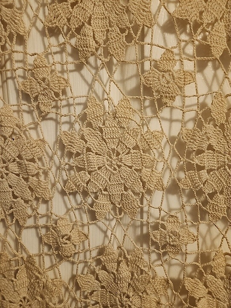 This is truly vintage, AMERICAN MADE by an American grandmother, crocheted tablecloth. The pattern is Queen Anne's Lace Tablecloth Pattern (#7050 on Freevintagecrochet.com) It is a beautiful ivory color, An open weave pattern. It would drape well on a 7' x 5' dining room table. The wood grain will show through nicely. I dont know the age of this one, but it has been well taken care of, and the thread is still strong. It will bring a nostalgic atmosphere into your home. Sigh... Listing and template services provided by inkFrog
