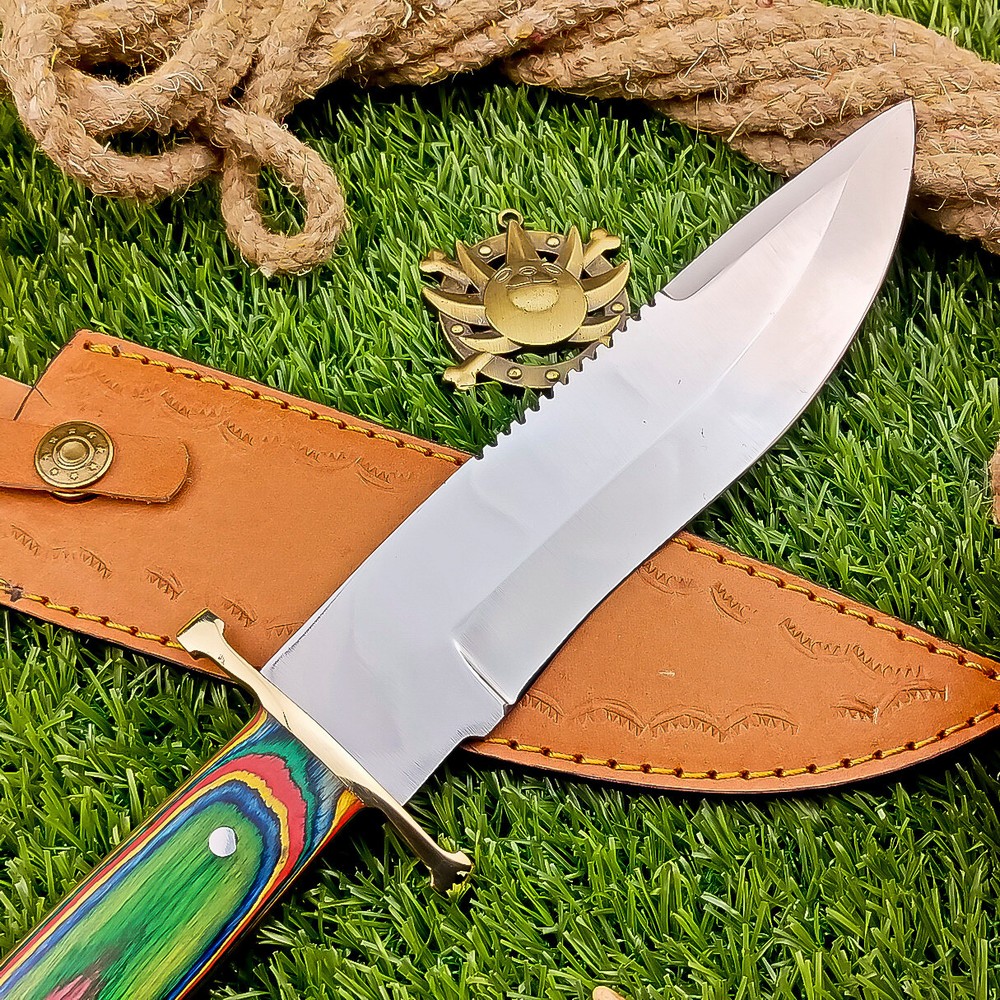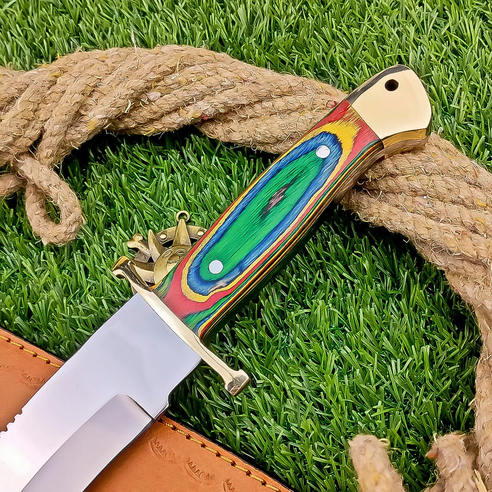 BEAUTIFUL Handmade J2 Hunting Knife, Bowie Knife, Camping Knife, Specifications: Overall Length: 12.00" Blade Thickness: ~4 mm Blade Material: J2 Steel Handle Material: Multi color Wood with brass pins with hand casted brass bolster. Includes: Leather sheath Care Instructions: Sharpen with a Diamond Wet Stone at a 20-degree angle. Clean with soap and water, dry thoroughly, and apply gun oil. Store away from the sheath to prevent rust. Important Notes for Buyers: Verify your country’s import regulations before purchase. Customs duties, if any, are the buyer’s responsibility. Shipping & Returns: Free shipping included. 14-day return policy applies. Contact Us: Message us anytime. We respond within 24 hours.