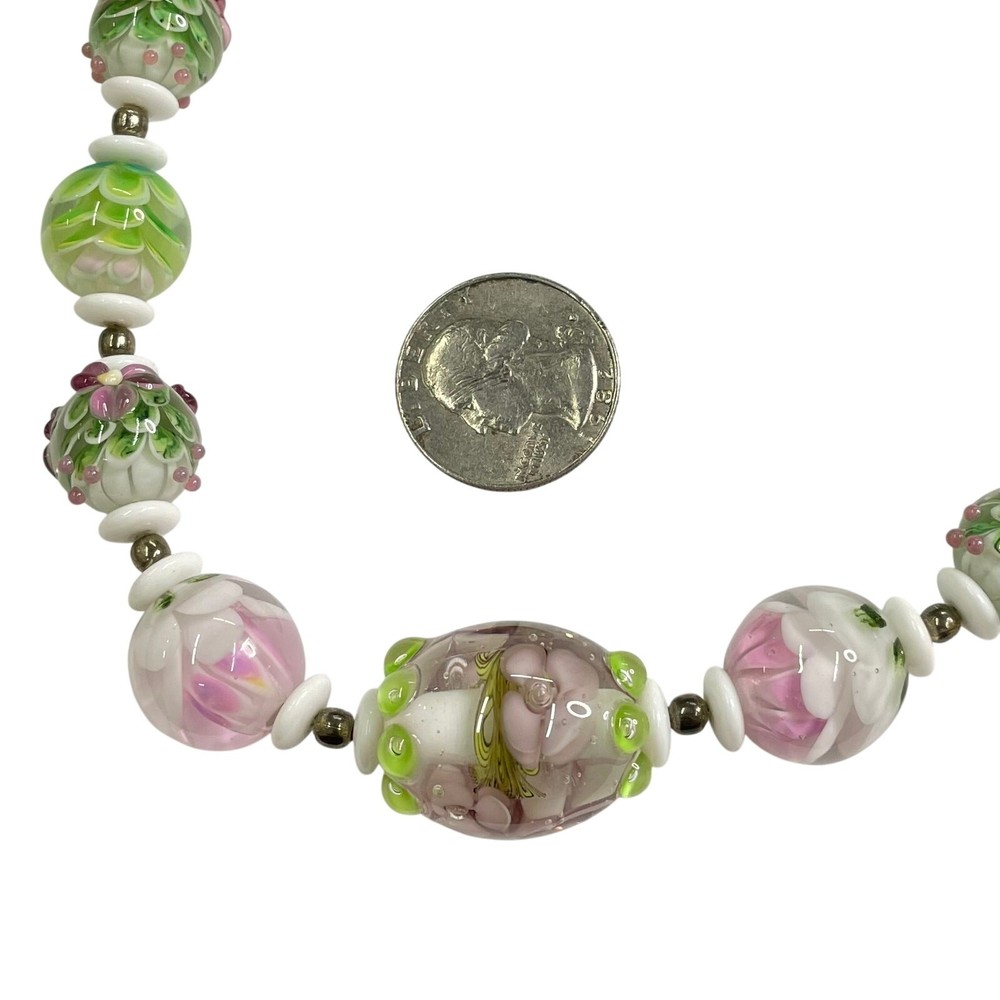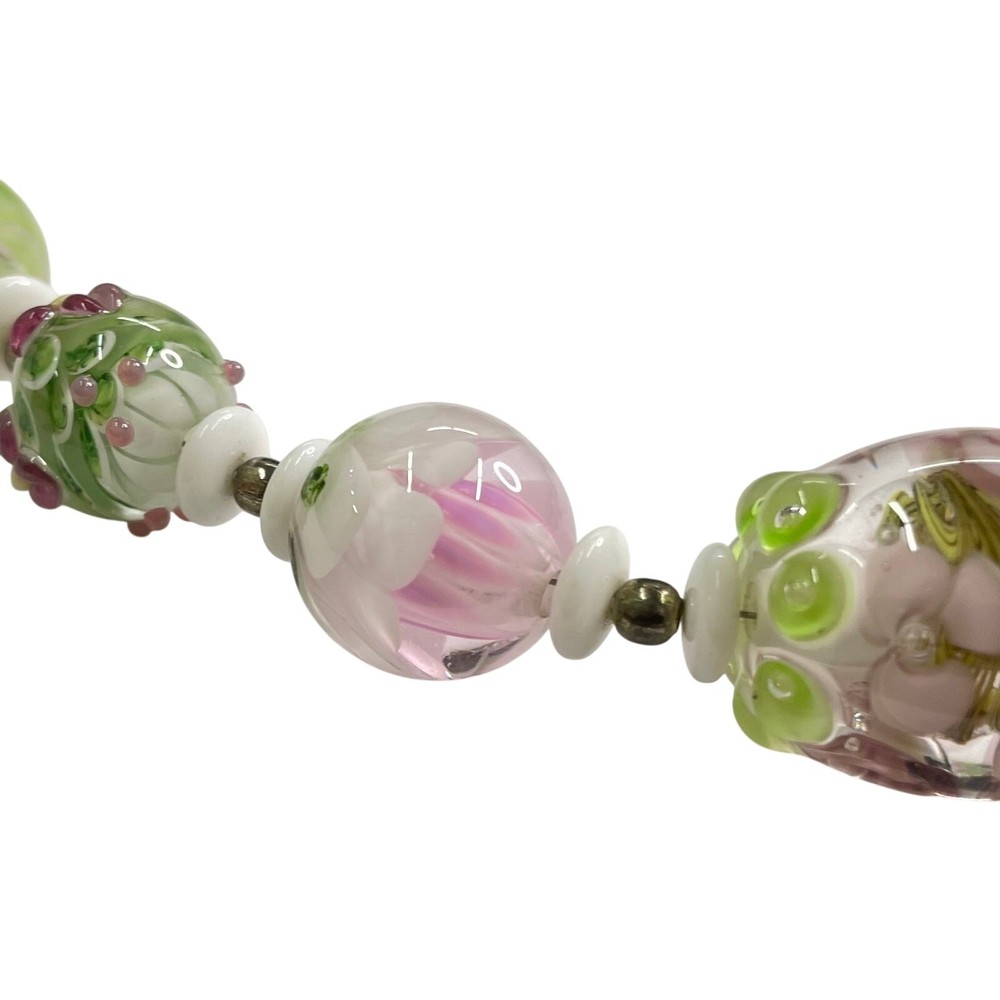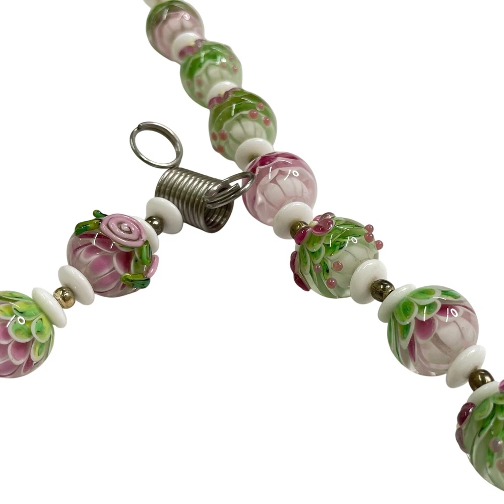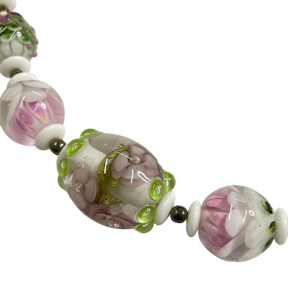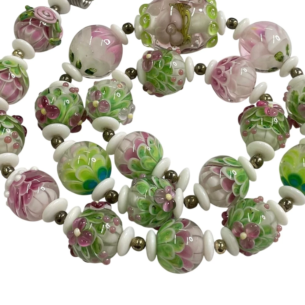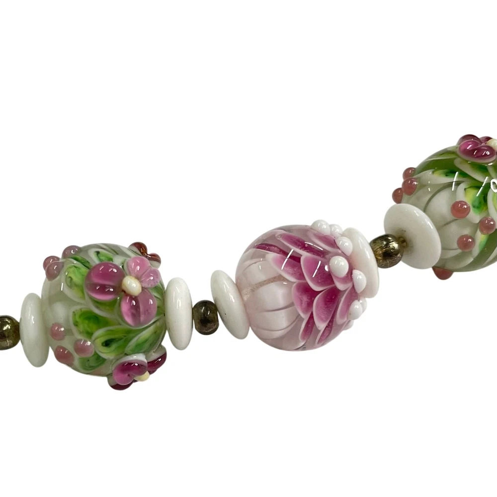 Handmade Lampwork Pink Green White Flowers Petals Raised Glass Artisan Bead Set for Jewelry Making Beautiful set of pink, green, and white Flower & Petal matching beads; some with detailed raised designs. Main beads are round and there is 1 focal barrel bead. Beads are already strung and could be made into necklace with clasps/closings or used for other jewelry projects. There are also small white disc and round gold tone spacer beads. 4 oz total. *Beads are part of a HUGE collection of Lampwork Beads. I will be listing more beads over the next few weeks/months. I offer combined shipping on multiple items. Just message me before checkout and I will send you an invoice with discounted shipping. Thanks for looking!