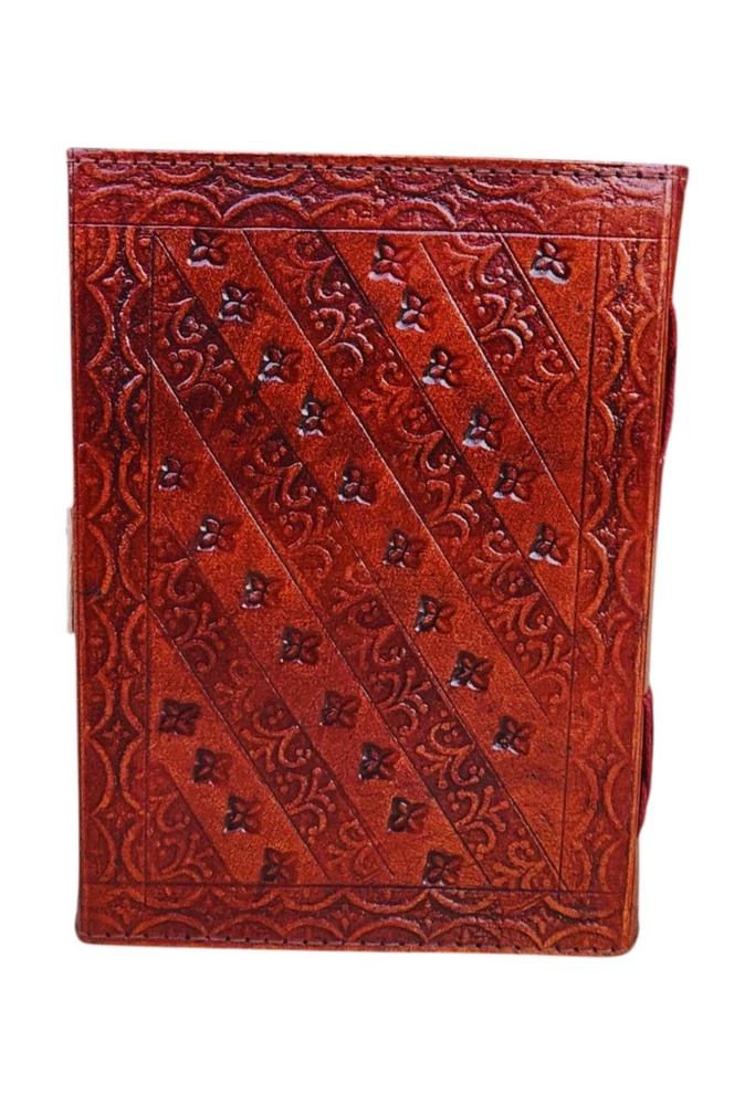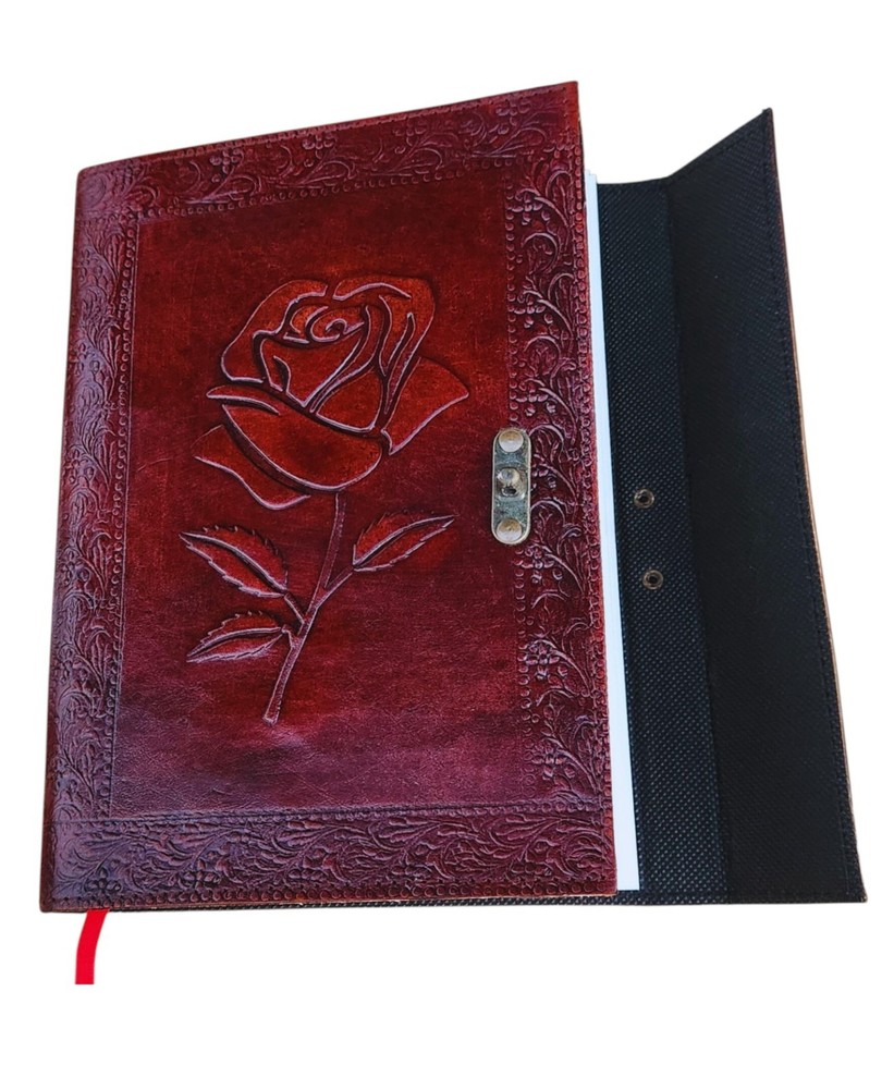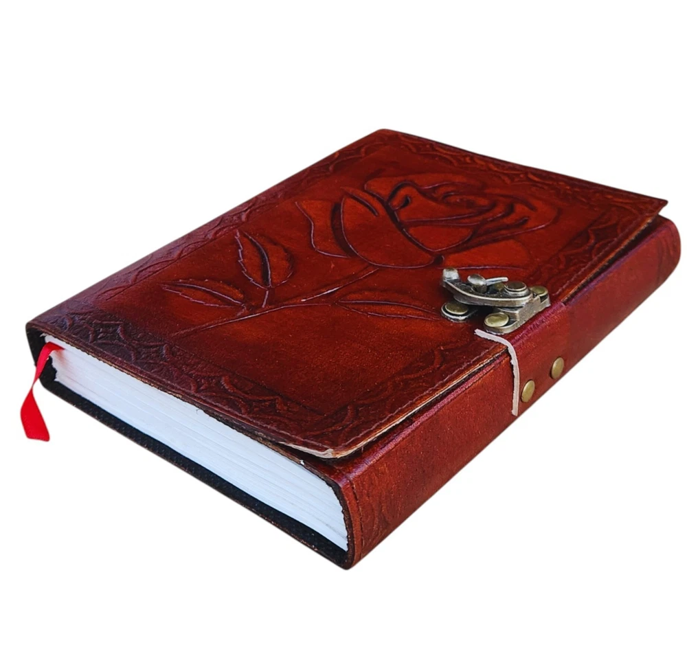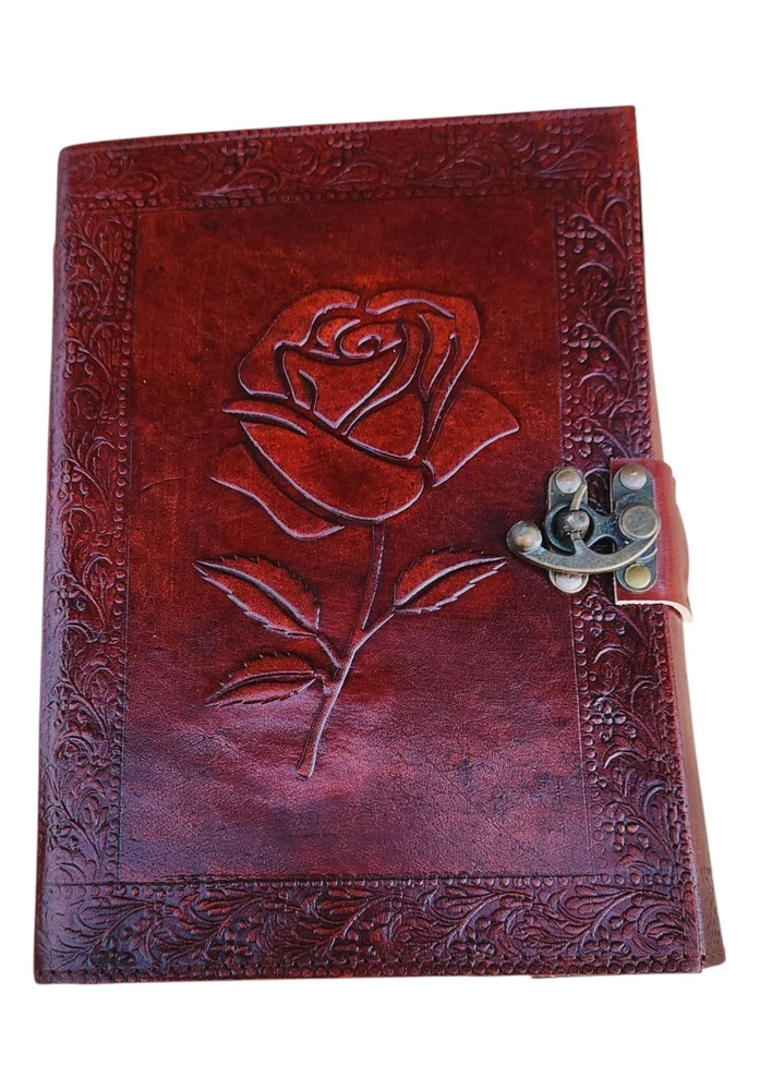 Experience the Art of Writing with Our Hand-Embossed Rose Leather Journal Capture your thoughts, sketches, and secrets in a journal that feels like a piece of history. This is not just a notebook; it is a handcrafted heirloom designed for poets, travelers, and dreamers. Why This Journal Stands Out: Exquisite Rose Artistry: The front cover features a deeply embossed, detailed rose, symbolizing beauty and timelessness. Premium Genuine Leather: Crafted from high-quality, supple leather with a rich vintage patina that smells authentic and gets better with age. Secure Vintage C-Clasp: Keep your private thoughts safe with the antique brass C-hook lock, adding a rustic, medieval charm. Hand-Stitched Durability: The spine is expertly hand-stitched to ensure pages never fall out, allowing the journal to lay flat for easy writing. Eco-Friendly Paper: Contains thick, cream-colored unlined pages that prevent ink bleed-through. Perfect for fountain pens, charcoal, or even watercolors. Perfect For: Daily Gratitude & Bullet Journaling Travel Adventures & Sketching A Unique Gift for Birthdays, Anniversaries, or Graduations Dimensions: [ 7 x 5 x 3 inches] Page Count: [ 200 Pages / 100 Sheets]